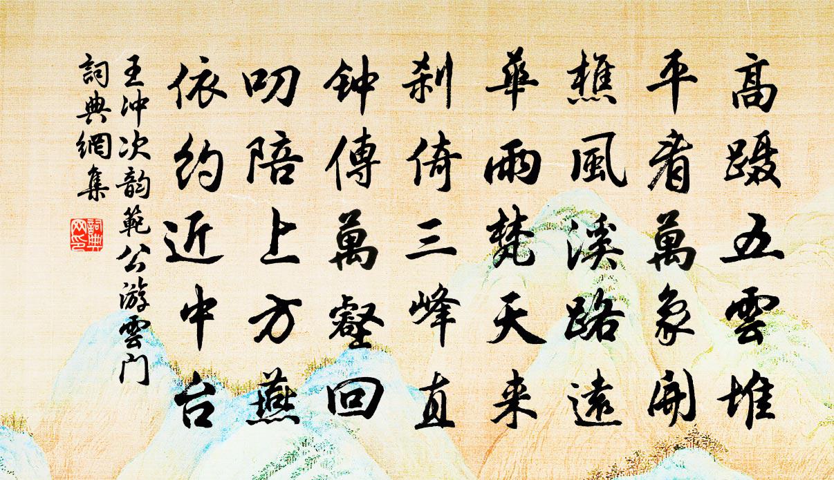 詩詞名句歷史字典書法欣賞書法字典國語詞典說文解字康熙字典古漢語字典標 題 作 者 詩 句 次韻范公游雲門作者:王沖 朝代:宋代次韻范公游雲門原文高躡五雲堆,平看萬象開。樵風溪路遠,華雨梵天來。剎倚三峰直,鍾傳萬壑回。叨陪上方燕,依約近中台。詩詞問答問:次韻范公游雲門的作者是誰?答:王沖問:次韻范公游雲門寫於哪個朝代?答:宋代王沖次韻范公游雲門書法欣賞次韻范公游雲門書法作品詩詞推薦【正宮】梁州令南李子昌〔元代〕芳草長亭露帶沙,盼遊子來家。翠消紅減亂如麻,隔妝檯慵梳掠掩菱花。 【賽鴻秋北】我這裡望賓鴻目斷夕陽輓歌詩陸機〔魏晉〕卜擇考休貞。嘉命鹹在茲。夙駕警徒御。結轡頓重基。龍(左巾右荒)被廣柳。前驅矯輕旗。殯宮何嘈嘈。哀響沸垂柳唐彥謙〔唐代〕垂柳碧髯茸,樓昏帶雨容。思量成晝夢,來去發春慵。梳洗憑張敞,乘騎笑稚恭。碧虛從轉笠,紅燭近高舂。怨臉送潚宰富陽樓鑰〔宋代〕富春富山水,地勝雄三吳。壯哉十萬戶,畿邑拱行都。大江橫吾前,上下萬賈趨。吾子丞剡川,攝事奸已鉏。試縣湖山堂汪元量〔宋代〕高堂寂寞半開門,草沒頹牆竹滿園。雨過湖天籠白晝,雲歸山市鎖黃昏。忘機今古鷗來往,說夢興亡燕語言。行盡頌古一百首釋智愚〔宋代〕石潤非玉,水麗非金。大禹決而西泝,卞和泣而陸沈。踏莎行·碧海無波晏殊〔宋代〕碧海無波,瑤台有路。思量便合雙飛去。當時輕別意中人,山長水遠知何處。綺席凝塵,香閨掩霧。紅箋小字憑誰江梅引姚燧〔元代〕年年江上見寒梅。幾枝開。暗香來。疑是月宮,仙子下瑤台。冷艷一枝折入手,斷魂遠,相思切,寄與誰。怨極恨師正堂二首李呂〔宋代〕物我雖殊理本同,算來身教易為功。表端豈但日間影,德盛應如草上風。作字心君生筆下,照人眸子驗胸中。平生漫歌八曲。故城東元結〔唐代〕漫惜故城東,良田野草生。說向縣大夫,大夫勸我耕。耕者我為先,耕者相次焉。誰愛故城東,今為近郭田。龍隱岩方信孺〔宋代〕曾榜武夷九曲,何如桂嶺七星。水石小容螭隱,煙雲長帶龍腥。宋太夫人輓詞晁說之〔宋代〕漢室賢良逝,萊妻節操長。生涯兩丱角,心事一縑緗。膝下黃金帶,齋中紫玉章。人間足悲樂,壠柏起清商。金盞子吳文英〔宋代〕賞月梧園,恨廣寒宮樹,曉風搖落。莓砌掃珠塵,空腸斷、熏爐燼銷殘萼。殿秋尚有餘花,鎖煙窗雲幄。新雁又、殘句:二月探供三月酒王禹偁〔宋代〕二月探供三月酒,今年未得去年錢。臨江蕭氏家寶堂蘇轍〔宋代〕迥人不解作生涯,唯有中堂書五車。竹簡多於孔氏壁,牙籤新似鄴侯家。田園豈是子孫計,青紫今為里巷夸。富貴雜詩二十七首曹勛〔宋代〕方塘倒影青天淨,幽么生 * 蔭濃。春去得閒觀物化,吹涼醒睡喜支筇。過湘妃廟許渾〔唐代〕古木蒼山掩翠娥,月明南浦起微波。九疑望斷幾千載,斑竹淚痕今更多。自安仁至豫章途中雜興十九首趙蕃〔宋代〕積潦當塗三尺強,筍輿那得代浮梁。脫靴直厲成孤笑,赤腳踏冰思舊狂。問信紅梅二章舒岳祥〔宋代〕凍白千林須雪重,暖紅一點著春多。啞驢瘦策平皋去,如此風流奈老何。春日有感孟郊〔唐代〕雨滴草芽出,一日長一日。風吹柳線垂,一枝連一枝。獨有愁人顏,經春如等閒。且持酒滿杯,狂歌狂笑來。名句推薦猶記得、當年深隱,門掩兩三株。張炎《渡江雲·山陰久客一再逢春回憶西杭渺然愁思》 花滿河陽,為君羞褪晨妝茜。吳文英《燭影搖紅·賦德清縣圃古紅梅》 映階碧草自春色,隔葉黃鸝空好音。杜甫《蜀相》 青楓颯颯雨淒淒,秋色遙看入楚迷。李攀龍《送明卿之江西》 桂魄初生秋露微,輕羅已薄未更衣。王維《秋夜曲》 調角斷清秋,征人倚戍樓。張喬《書邊事》 待羔兒、酒罷又烹茶,揚州鶴。辛棄疾《滿江紅·和范先之雪》 不學問,無正義,以富利為隆,是俗人者也。荀子《荀子·儒效》 興,百姓苦;亡,百姓苦!張養浩《山坡羊·潼關懷古》 飲馬渡秋水,水寒風似刀。王昌齡《塞下曲四首》