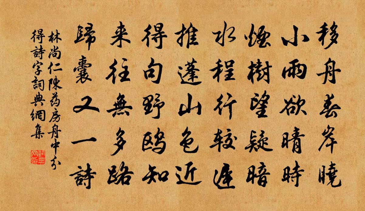 詩詞名句歷史字典書法欣賞書法字典國語詞典說文解字康熙字典古漢語字典標 題 作 者 詩 句 陳藥房舟中分得詩字作者:林尚仁 朝代:宋代陳藥房舟中分得詩字原文移舟春岸曉,小雨欲晴時。煙樹望疑暗,水程行較遲。推蓬山色近,得句野鷗知。來往無多路,歸囊又一詩。詩詞問答問:陳藥房舟中分得詩字的作者是誰?答:林尚仁問:陳藥房舟中分得詩字寫於哪個朝代?答:宋代林尚仁陳藥房舟中分得詩字書法欣賞陳藥房舟中分得詩字書法作品詩詞推薦題李氏敬聚堂家鉉翁〔宋代〕千載河間舊典刑,詩書習氣至今存。故家喬木知誰在,五世同居是義門。用秦公贈李次仲韻呈次仲三首曹勛〔宋代〕欲求玄牝蘊清華,莫放朝昏子午差。收得五華滋湛露,自應雙鶴下青霞。頗聞北海終棲火,莫向東陵只種瓜。它日同賦梅花十二題水邊王銍〔宋代〕雪後溶溶嫩水通,滿枝煙雨暗春風。試看照影橫斜處,渾似靚妝清鏡中。離別詩曹植〔魏晉〕人遠精魂近。寤寐夢容光。觀音洞秦觀〔宋代〕匹馬驕嘶石路斜,觀音洞口踏煙霞。普陀風景差相似,只欠潮音小白花。雜詠十首酬汪鎮卿林景熙〔宋代〕權臣坐偃月,棄官如飄蓬。及茲顛沛秋,翻然挺孤忠。一死未得所,綱羅掛秋鴻。渡淮已不食,蛻槁夷齊風。黃鐘樂魏承班〔唐代〕池塘煙暖草萋萋,惆悵閒宵含恨,愁坐思堪迷。遙想玉人情事遠,音容渾似隔桃溪。偏記同歡秋月低,簾外論心花寄上鄭郎中姜夔〔宋代〕梅根東望九會雲,中有風流衣鄉人。名下一生勞夢想,尊前數語倍情親。節旄在道催歸漢,花鳥留君且作春。見說題晏國師喝水岩趙與滂〔宋代〕古磚出唐井,豫識國師名。於此坐禪處,喝回流水聲。如何神晏塔,移作李綱塋。見說山中石,不平空自鳴。已賦四花復得紅因念閣下舊遂足五花之韻項安世〔宋代〕吾衰不復夢蓬瀛,忽見紅梅眼暫驚。獨樹正當雲閣起,艷汝斜照石渠明。懶隨朔雪傳春信,長倚東風詫曉酲。歲晚次韻答胡山甫兼簡汪日賓戴表元〔宋代〕白髮詩翁南峽居,肯來與子不相疏。久知諸老難折簡,端為此家多貯書。談吐清無涉俗處,容顏衰似避兵初。溪梁【雙調】新水令_大明開放九佚名〔元代〕大明開放九重天,拜紫宸玉樓金殿。紅搖銀燭影,香裊御爐煙。奏鳳管冰弦,唱大曲梨園。列文武官員,降玉府神出妓金陵子呈盧六其二李白〔唐代〕南國新豐酒。東山小妓歌。對君君不樂。花月奈愁何。沖虛宮陸游〔宋代〕林館松門白晝扃,驂鸞人去已千齡。基存舊宅樓台古,地有遺丹草木靈。滿洞曉雲春釀雨,一池秋水夜涵星。 * 水調歌頭(題臨江驛和徐意一韻)李曾伯〔宋代〕君莫厭行役,易爾此非難。人情無已,久陰憂潦霽憂乾。借得庭軒一榻,忘卻征塗炎暑,小駐瀹龍團。世路任渠險早發始興陳陶〔唐代〕雲里山已曙,舟中火初爇。綠浦待行橈,玄猿催落月。沿流信多美,況復秋風發。掛席借前期,晨雞莫嘲哳。自過犍為山水益佳晁公溯〔宋代〕客游三十年,不出僰與巴。江惡崖石粗,十步九褒斜。自過賴里西,山水日夕佳。冥冥見遠樹,涉涉鋪平沙。兩岸送元簡上人適越劉禹錫〔唐代〕孤雲出岫本無依,勝境名山即是歸。久向吳門游好寺,還思越水洗塵機。浙江濤驚獅子吼,稽嶺峰疑靈鷲飛。更入送李秀才為道士吳可〔宋代〕聖澤朝來淨世緣,不教仙骨墮儒門。金龜換酒當年客,白鹿升天后世孫。泉石招君友猿鶴,利名憐我醉朝昏。 * 讀史陸游〔宋代〕夜對遺編嘆復驚,古來成敗浩縱橫。功名多向窮中立,禍患常從巧處生。萬里關河歸夢想,千年王霸等棋枰。人間名句推薦稻根科斗行如塊,田水今年一尺寬。范成大《夏日田園雜興》 兒童急走追黃蝶,飛入菜花無處尋。楊萬里《宿新市徐公店》 言無二貴,法不兩適。韓非及後人《韓非子·問辯》 落花夜雨辭寒食。塵香明日城南陌。吳文英《菩薩蠻·落花夜雨辭寒食》 滿地黃花堆積。憔悴損,如今有誰堪摘?李清照《聲聲慢·尋尋覓覓》 畫樓洗淨鴛鴦瓦,彩繩半濕鞦韆架。王元鼎《醉太平·寒食》 滿眼遊絲兼落絮,紅杏開時,一霎清明雨。馮延巳《鵲踏枝·清明》 我有所念人,隔在遠遠鄉。白居易《夜雨》 不及夜台塵土隔,冷清清、一片埋愁地納蘭性德《金縷曲·亡婦忌日有感》 瀚海百重波,陰山千里雪。李世民《飲馬長城窟行》