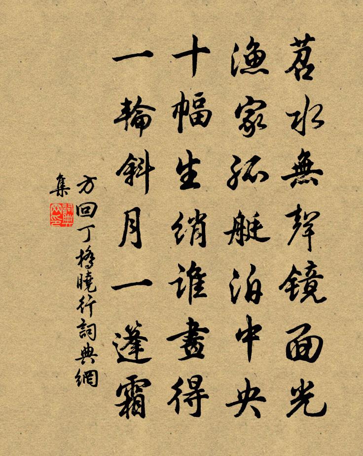 詩詞名句歷史字典書法欣賞書法字典國語詞典說文解字康熙字典古漢語字典標 題 作 者 詩 句 丁橋曉行作者:方回 朝代:宋代丁橋曉行原文苕水無聲鏡面光,漁家孤艇泊中央。十幅生綃誰畫得,一輪斜月一篷霜。詩詞問答問:丁橋曉行的作者是誰?答:方回問:丁橋曉行寫於哪個朝代?答:宋代方回丁橋曉行書法欣賞丁橋曉行書法作品詩詞推薦芙蓉樓送辛漸王昌齡〔唐代〕寒雨連江夜入吳,平明送客楚山孤。洛陽親友如相問,一片冰心在玉壺。送鄭十八虔貶台州司戶傷其臨老陷賊之故闕為面別情見於杜甫〔唐代〕鄭公樗散鬢成絲,酒後常稱老畫師。萬里傷心嚴譴日,百年垂死中興時。蒼惶已就長途往,邂逅無端出餞遲。便與游龍湫拜諾矩羅尊者釋祖珍〔宋代〕十里松溪到上流,斷崖千尺瀉龍湫。誰言尊者心無著,冷眼長年看不休。次韻蘇主管青溪十絕句項安世〔宋代〕雨餘溪水十分盈,更革秋潮數寸生。西浸夕陽東浸月,並於池面作鮮明。送僧歸天寧萬年禪院錢惟演〔宋代〕絕巘依滄海,疑君際紫氛。岩扉晴落雪,寶地晝生雲。淨饌芝房秀,深爐桂葉熏。宰官游未得,空愧北山文。次劉子駒韻胡宏〔宋代〕忙中不識本來心,一點靈光自在明。只向靜中尋底事,恐遭顛沛不員成。訴衷情侯善淵〔元代〕林泉退隱作生涯。寂寞棄繁華。中山翠微仙子,滿目泛靈砂。凝素液,混丹霞。坼瑤葩。雲濤煙浪,島外方壺,那臨江仙·登凌歊台感懷李之儀〔宋代〕偶向凌歊台上望,春光已過三分。江山重疊倍銷魂。風花飛有態,煙絮醉無痕。已是年來傷感甚,那堪舊恨仍存。勉弟子還山頌張繼先〔宋代〕昔劫因緣今劫會,昨日顏容今日改。世間滄海盡桑田,慎勿重來呈傀儡。染雲王安石〔宋代〕染云為柳葉,剪水作梨花。不是春風巧,何緣有歲華。次韻邢敦夫秋懷十首秦觀〔宋代〕邢侯秋臥痾,揮毫見深衷。賡者二三子,翕然笙磬同。不為兒女姿,頗形四方風。屬有山水念,因之絲與桐。臨江仙(次韻葉少蘊惜春)李彌遜〔宋代〕試問花枝余幾許,捲簾細雨隨人。風光猶戀苦吟身。海棠渾怯冷,為我強留春。細聽惜花歌白雪,不知盞面生塵。晚行湖上陸游〔宋代〕飽來捫腹繞村嬉,北陌東阡信所之。女手采余桑鬱郁,煙蕪生遍冢累累。高林日暮無鶯語,深巷人歸有犬隨。東走游雲湖胡寅〔宋代〕衡湘久來往,眼到山輒對。愛山真自性,久看眼未礙。今朝渡石潭,蘭槳亂青帶。初升岸稍高,忽喜地更大。行行自述陳寶之〔宋代〕少年落魄走京華,老大無錢赴酒家。羞作寺丞門裡客,一片明月照梅花。飲藥房陳戶山居韻得合字林尚仁〔宋代〕常人厭寂寥,隱士畏喧雜。山居主人百好無,終日喔詩增長書合。我本山中人,心事亦頗合。杖藜約客行幽深,來孫器之奉使淮浙至江為書見寄以詩謝之五首司馬光〔宋代〕岫貼晴天闊,舟緣石岸深。遙知作書處,纜裊綠波心。【仙呂】翠裙腰 閨思朱庭玉〔元代〕雨余花落莓苔地,巢燕啄香泥,柳綿點水浮萍碎。景遲遲,鞦韆斜掛彩繩低。 【金盞兒】啟朱扉,出蘭閨。晚送甥回崇仁李劉〔宋代〕萬里七年艱險同,我車西去子舟東。教兒強學先循理,嫁女隨宜莫諱窮。注就歐詩勤琢削,續成漢紀更磨礲。鄉人漳河疑冢京鏜〔宋代〕疑冢多留七十餘,謀身自謂永無虞。不知三馬同槽夢,曾為兒童遠慮無。名句推薦心似已灰之木,身如不系之舟。蘇軾《自題金山畫像》 但怪得、當年夢緣能短。吳文英《三姝媚·過都城舊居有感》 風定落花深,簾外擁紅堆雪。李清照《好事近·風定落花深》 鹹言上國繁華,豈謂帝城羈旅。子蘭《秋日思舊山》 請君看取東流水,方識人間別意長。嚴仁《鷓鴣天·惜別》 雲壓西村茅舍重,怕他榾柮同燒。陳維崧《臨江仙·寒柳》 放眼暮江千頃,中有離愁萬斛,無處落征鴻。楊炎正《水調歌頭·把酒對斜日》 重足而立,側目而視。司馬遷《史記·汲鄭列傳》 閣道步行月,美人愁煙空。李白《上之回》 青春花姊不同時。淒涼生較遲。吳文英《醉桃源·芙蓉》
