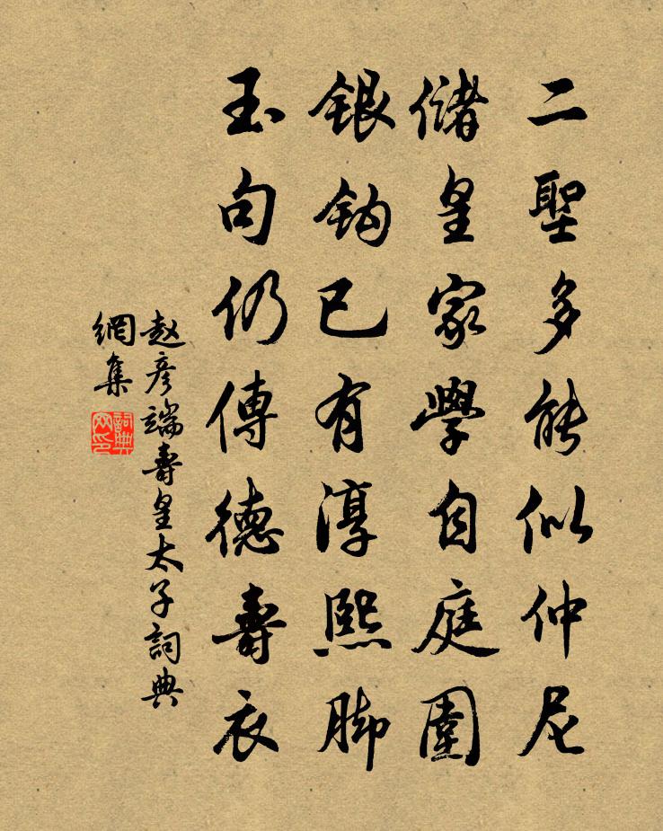 詩詞名句歷史字典書法欣賞書法字典國語詞典說文解字康熙字典古漢語字典標 題 作 者 詩 句 壽皇太子作者:趙彥端 朝代:宋代壽皇太子原文二聖多能似仲尼,儲皇家學自庭圍。銀鉤已有淳熙腳,玉句仍傳德壽衣。詩詞問答問:壽皇太子的作者是誰?答:趙彥端問:壽皇太子寫於哪個朝代?答:宋代趙彥端壽皇太子書法欣賞壽皇太子書法作品詩詞推薦水調歌頭(韓倅·九月八日生辰)楊無咎〔宋代〕帝里記當日,賜第富相聯。惟君家最稱著,桐木老參天。三相勛庸才業,一代風流人物,繼世賴君賢。自合躋清要芭蕉釋善珍〔宋代〕瓦溝月暗亂螢飛,照見芭蕉葉上詩。憶得前時吟最苦,自攜殘燭拂蛛絲。句程師孟〔宋代〕芍藥□難種。范參政自建康得資政宮祠六詩寄呈趙蕃〔宋代〕細思不是乞身難,政為貧賢不放閒。奏疏比聞頻叩闕,詔恩今見許還山。游三井觀陸游〔宋代〕三井久知名,暇日偶一訪。棟宇壞欲盡,基址尚閎壯。畫牆皆國工,煙雲儼天仗,旌旄亞戈戟,佩玉雜弓*。太古開窗徐夤〔唐代〕閉戶開窗寢又興,三更時節也如冰。長閒便是忘機者,不出真如過夏僧。環堵豈慚蝸作舍,布衣寧假鶴為翎。薔薇幸蜀西至劍門李隆基〔唐代〕劍閣橫雲峻,鑾輿出狩回。翠屏千仞合,丹嶂五丁開。灌木縈旗轉,仙雲拂馬來。乘時方在德,嗟爾勒銘才。送羅臣濟北歸朱翌〔宋代〕君才可從六龍飛,便合超騰向日畿。曾使諸生館下立,又騎一馬醉中歸。江山得助雲蒸筆,桃李不言春上機。歸去雜詠陸游〔宋代〕青羊宮中竹暗天,白馬廟畔柏如山。琴尊處處可消日,車馬紛紛自欠閒,哭王仲密四首強至〔宋代〕群居三益友,再拜十年兄。一別長南北,相逢遂死生。淚流添渭水,心折注江城。聞訃悲尤劇,書成仆未行。和陶讀《山海經》蘇軾〔宋代〕談道鄙俗儒,遠自太史走。仲尼實不死,於聖亦何負。紫文出吳宮,丹雀本無有。遼哉廣桑君,獨顯三季後。贈天目吳君實林景熙〔宋代〕詩興翩翩度雪溪,岩雲猶護舊留題。夢回殘月蒼梧曉,家在春風秀麥西。萱草堂深衣屢寄,桃花觀冷酒重攜。故山織圖二十四首餵蠶樓璹〔宋代〕蠶兒初飯時,桑葉如錢許。扳條摘鵝黃。藉紙觀蟻聚。屋頭草木長,窗下兒女語。日長人頗閒,鍼線隨織補。游西湖沈韜文〔唐代〕□□□□□□□,菰米蘋花似故鄉。不是不歸歸未得,好風明月一思量。七十翁吟七言十首方回〔宋代〕幼孤何敢事兒嬉,聞道惟慚性鈍遲。早尚虛文迷釋老,晚參實學溯濂伊。五更燈火芸千卷,兩世冠裳桂一枝。夢幻拍板謠王禹偁〔宋代〕 * 親采扶桑木,鏤脆排焦其數六。雙成捧立王母前,曾按瑤池白雲曲。幾時流落來人間,梨園部中齊管弦。管弦千秋歲(春欲去,二妙老人戲作長短句留之,為社中一笑)周紫芝〔宋代〕送春歸去。說與愁無數。君去後,歸何處。人應空懊惱,春亦無言語。寒日暮,騰騰醉夢隨風絮。盡日間庭雨。紅送僧歸閩釋重顯〔宋代〕雪老當年曾入嶺,真禪今日又思鄉。孤帆隱隱曾唯我,月照夜濤空渺茫。玉樓春歐陽澈〔宋代〕個人風韻天然俏。入鬢秋波常似笑。一彎月樣黛眉低,四寸鞋兒蓮步小。絕纓嘗宴瓊樓杪。軟語清歌無限妙。歸時阮郎歸張掄〔宋代〕炎天何處可登臨。須於物外尋。松風澗水雜清音。空山如弄琴。宜散發,稱披襟。都無煩暑侵。莫將城市比山林。名句推薦今春看又過,何日是歸年。杜甫《絕句二首》 至善是心之本體。只是明明德到至精至一處便是。然亦未嘗離卻事物。王陽明《傳習錄·卷上·徐愛錄》 法令至行,公平無私劉向《戰國策·秦一·衛鞅亡魏入秦》 長袖善舞,多錢善賈。韓非及後人《韓非子·五蠹》 待羔兒、酒罷又烹茶,揚州鶴。辛棄疾《滿江紅·和范先之雪》 諸葛大名垂宇宙,宗臣遺像肅清高。杜甫《詠懷古蹟五首·其五》 御柳如絲映九重,鳳凰窗映繡芙蓉。溫庭筠《楊柳枝》 秋風蕭瑟,洪波湧起。曹操《觀滄海 / 碣石篇》 幾硯昔年游,於今成十秋。司馬光《送龔章判官之衛州·新及第》 秋至搗羅紈,淚滿未能開。江淹《悼室人》