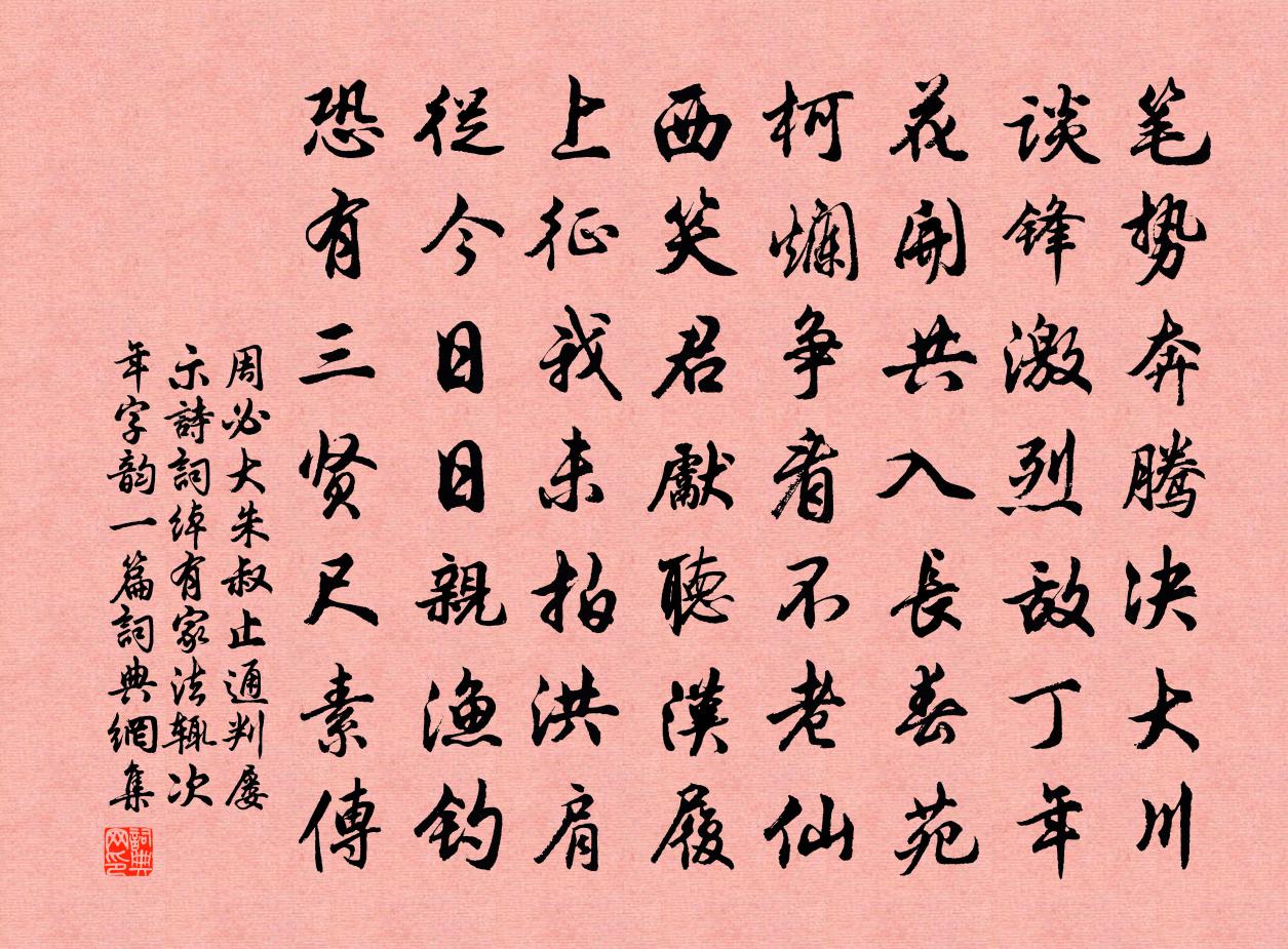 詩詞名句歷史字典書法欣賞書法字典國語詞典說文解字康熙字典古漢語字典標 題 作 者 詩 句 朱叔止通判屢示詩詞綽有家法輒次年字韻一篇作者:周必大 朝代:宋代原文筆勢奔騰決大川,談鋒激烈敵丁年。花開共入長春苑,柯爛爭看不老仙。西笑君先聽漢履,上征我未拍洪肩。從今日日親漁釣,恐有三賢尺素傳。詩詞問答問:《朱叔止通判屢示詩詞綽有家法輒次年字韻一篇》的作者是誰?答:周必大問:該詩寫於哪個朝代?答:宋代書法欣賞朱叔止通判屢示詩詞綽有家法輒次年字韻一篇書法作品詩文賞析【原題】:朱叔止通判屢示詩詞綽有家法輒次年字韻一篇兼簡汪仲嘉敷學樓大防顯學二尚書詩詞推薦好事近(生朝紀夢)程大昌〔宋代〕自涉希壽來,疑道無多歲月。昨夜風吹好夢,報前途康吉。石橋堅壯跨黃河,不用資舟楫。管取身心安泰,閱椿齡訪羅孟弼竹園張栻〔宋代〕知君日來修竹底,卻課市樓朱墨程。應是禪門嫌揀擇,不論清濁要圓成。古詩十九首·東城高且長佚名〔兩漢〕東城高且長,逶迤自相屬。迴風動地起,秋草萋已綠。四時更變化,歲暮一何速!晨風懷苦心,蟋蟀傷侷促。蕩滌蓬萊閣聞大風陸游〔宋代〕天風搖盪萬松聲,卷海頹山得我驚。觸灩澦堆秋起柂,鏖皋蘭下夜還營。荷戈老氣縱橫在,看劍新詩欬唾成。興盡木蓮樹生巴峽山谷間巴民亦呼為黃心樹大者…題三絕句雲白居易〔唐代〕如折芙蓉栽旱地,似拋芍藥掛高枝。雲埋水隔無人識,唯有南賓太守知。紅似燕支膩如粉,傷心好物不須臾。山中共城十吟其二曰春郊閒步邵雍〔宋代〕病起復驚春,攜筇看野新。水邊逢釣者,壠上見耕人。訪彼形容苦,酬予家業貧。自慚功濟力,未得遂生民。瑞香盛開,呈益國公二首楊萬里〔宋代〕針來大筍束仍攢,作麽開時色兩般。荀令金爐炷沉水,昭容紫袖襯中禪。同花異葉株株異,一種欒枝節節欒。雪裡挽鄉守樓宗簿陳宓〔宋代〕公來當赤立,節用以為餘。垂橐無金帛,窮閻有袴襦。杜門蒙枉顧,易簀阻前趨。忍見歸雙旐,傷心豈獨莆。和郁簿述懷古風虞儔〔宋代〕莫笑當年韓與侯,釣魚溫水垂纖鉤。鳶肩自是騰上速,安用常何薦馬周。先生直氣摩星斗,肯來州縣某低頭。蒞官春雨中偶賦陸游〔宋代〕老子年來百事慵,不妨詩課尚能供。殘花已覺胭脂淡,煮酒初嘗琥珀濃。羸病不堪連日雨,孤愁偏怯五更鐘。舊交寄陳澈計議二首劉克莊〔宋代〕匹馬單鎗去復還,天生此士濟時艱。如何方奏淮夷雅,又遣行歌蜀道難。兜刺史誰修廢廟,漢將軍尚有荒壇。會當阮郎歸 舟中賦所見陸文圭〔元代〕風吹一捻柳腰輕。春柔力未勝。眉兒喜學遠山青。終朝畫不成。嬌滴滴,笑盈盈。雛鶯葉底聲。花梢雨過夕陽明。初上船留寄杜牧〔唐代〕煙水本好尚,親交何慘淒。況為珠履客,即泊錦帆堤。沙雁同船去,田鴉繞岸啼。此時還有味,必臥日從西。八陣圖蘇泂〔宋代〕儼然雲轉與風回,故國人看但石堆。猶有鬼神供職守,不移行列待將來。贈相士襄衣道人杜需二首楊萬里〔宋代〕與子生疏有底仇,談間容昜說封侯。病身更遣永山倚,野鶴孤雲也替愁。寄弟曾國藩〔清代〕昔我初去家,諸弟各弱小。阿季髡兩髦,覷人眸子繚。後園偷棗栗,揉升極木沙。叔也從之求,揖我謂我矯。分甘送曾宏甫守天台曾幾〔宋代〕莫作陽關墮淚聲,丹丘勝事要君聽。興公賦里雲霞赤,子美詩中島嶼青。天近豈無宣室召,地偏猶有草堂靈。鑾坡沁園春李孝光〔元代〕花壓雙溪,月滿千門,氣象崢嶸。□鄉村父老,踏歌舊曲,閭閻小子,弦誦新聲。雞犬無驚,桑麻如畫,酷似驅車和湯秘書見寄韻釋行海〔宋代〕書劍沖寒到日邊,煙霞曾結幾生緣。醉邀明月逢梅醒,嘯入青山對竹眠。老晤莊周為蝶後,誰思腐草化螢前。新詩戰掉醜奴兒 贈醮首劉大官馬鈺〔元代〕彭城兄弟皆官樣,富貴之家。酷好榮華。未解回心悟落花。路途差。吾親若肯搜玄理,別有生沁悟落花。路途差。名句推薦臨砌影,寒香亂、凍梅藏韻。吳文英《花犯·郭希道送水仙索賦》 至誠之道可以前知。國家將興,必有禎祥;國家將亡,必有妖孽。子思《中庸·第二十四章》 飲馬渡秋水,水寒風似刀。王昌齡《塞下曲四首》 東家頭白雙女兒,為解挑紋嫁不得。元稹《織婦詞》 奸邪之輩,即平地亦起風波,豈知神鬼有靈,不肯聽其顛倒。王永彬《圍爐夜話·第二二則》 竹疏虛檻靜,松密醮壇陰。張泌《女冠子·露花菸草》 夫君子之行,靜以修身,儉以養德。諸葛亮《誡子書》 闌乾倚遍重來憑。淚粉偷將紅袖印。歐陽修《玉樓春·去時梅萼初凝粉》 悲莫悲生離別,樂莫樂新相識,兒女古今情。辛棄疾《水調歌頭·壬子三山被召陳端仁給事飲餞席上作》 我醉欲眠卿且去,明朝有意抱琴來。李白《山中與幽人對酌》