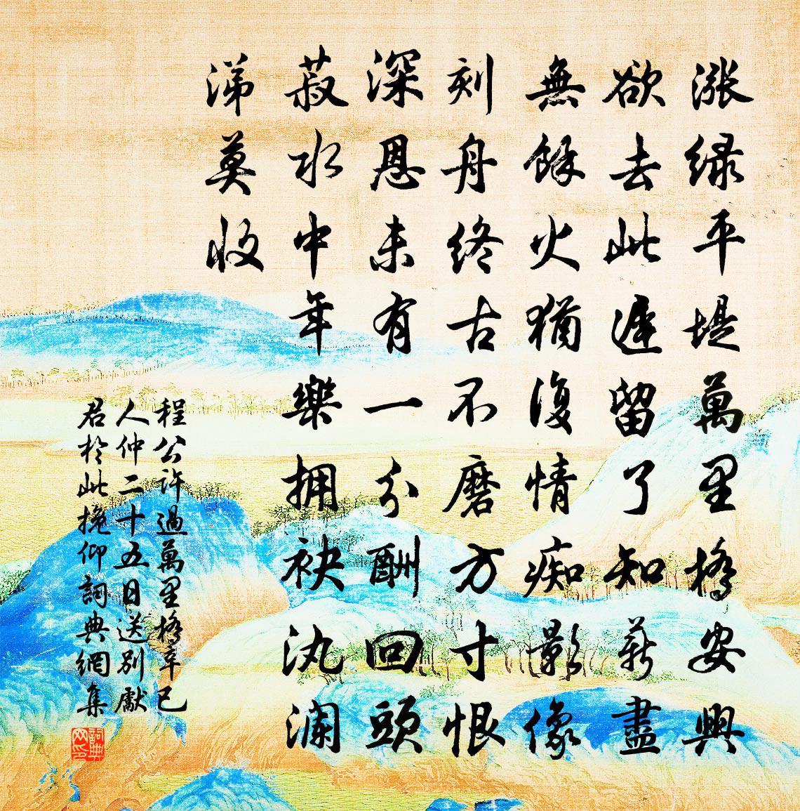 詩詞名句歷史字典書法欣賞書法字典國語詞典說文解字康熙字典古漢語字典標 題 作 者 詩 句 過萬里橋辛已人仲二十五日送別先君於此挽仰作者:程公許 朝代:宋代原文漲綠平堤萬里橋,安興欲去此遲留。了知薪盡無餘火,猶復情痴影像刻舟。終古不磨方寸恨,深恩未有一分酬。回頭菽水中年樂,擁袂汍瀾涕莫收。詩詞問答問:《過萬里橋辛已人仲二十五日送別先君於此挽仰》的作者是誰?答:程公許問:該詩寫於哪個朝代?答:宋代書法欣賞過萬里橋辛已人仲二十五日送別先君於此挽仰書法作品詩文賞析【原題】:過萬里橋辛已人仲二十五日送別先君於此挽仰四年不勝感愴詩詞推薦汲井溉田民亦勞止歌以相之程珌〔宋代〕短綆長瓶高下飛,老農雨汗紅淋漓。夜來雨意已垂垂,一事不成風又吹。柳梢青(茶)李處全〔宋代〕九天圓月。香塵碎玉,素濤翻雪。石乳香甘,松風湯嫩,一時三絕。清宵好盡歡娛,奈明日、扶頭怎說。整頓頹山句曾惇〔宋代〕家貧只舊醅,不辦樽中醁。但煮官焙香,炊飯膾魚腹。寄王祥季昆翟龕〔宋代〕右軍孫子總奇才,一別俄驚秋又來。冠佩正宜朝鳳闕,釣竿未許老鰲台。雲昏野寺疏鍾斷,潮落寒汀野鶴回。咫尺憶荔枝薛濤〔唐代〕傳聞象郡隔南荒,絳實豐肌不可忘。近有青衣連楚水,素漿還得類瓊漿。陳順之靈壁石硯山樓鑰〔宋代〕名畫法書環四壁,中有米家真寶石。群峰森聳外澗流,他物雖奇敢爭席。舊屬半山老仙人,佛印乞之如乞鄰。阿章入梅陸游〔宋代〕今年面入梅日,面雲腳垂到面地。芬香小麥面,展轉北面睡。甲夜聞雨聲,起拜造物賜。三登於此卜,一飽可坐致和王仲儀楸花十二韻梅堯臣〔宋代〕春陽發草木,美好一同時。桃李雜山櫻,紅白開繁枝。楸英獨步媚,淡紫相參差。大葉與勁乾,簇萼密自宜。圖出舟行往吊故人戴復古〔宋代〕喬木風聲壯,大江天影圓。悲秋時把酒,愛月夜行船。未及到河上,先愁過竹邊。倚篷思往事,聞笛為悽然。同朱五題盧使君義井高適〔唐代〕高義唯良牧,深仁自下車。寧知鑿井處,還是飲冰餘。地即泉源久,人當汲引初。體清能鑒物,色洞每含虛。上善掃榻葉茵〔宋代〕掃榻臥終日,香銷百念除。不愁渾厭酒,無事剩鈔書。粉淺庭前筍,青齊雨後蔬。自嫌猶有累,添水種金魚。和王應夫見貽六首曹勛〔宋代〕聯事當年在海隅,再遵南尾笑言攄。尚懷擁鼻胡床語,每寄論心尺素書。松籟舞風鷹隼後, * 附火雪霜初。應憐贈無諍和尚四首王邁〔宋代〕稽首叢林無諍師,我因有諍落便宜。問師無諍中三昧,笑指岩前沒字碑。止庵葉茵〔宋代〕時事艱難路險巇,得來名利亦何為。趙州茶罷速歸去,莫待鐘鳴漏盡時。秋居幽興王禹偁〔宋代〕秋光雖寂澹,幽興入詩家。籬暗螿啼菊,園荒蟻上茄。圍棋知日影,理髮見霜華。向曉兒童喜,溪僧遺晚瓜。閨思梅堯臣〔宋代〕望日赤如橘,游梁音信稀。愁心常似醉,春絮等閒飛。江鮆看將爛,芹牙吐尚微。何時憑燕子,寄取錦書歸。朝中措李祁〔宋代〕郎官湖上探春回。初見照江梅。過盡竹溪流水,無人知道花開。佳人何處,江南夢遠,殊未歸來。喚取小叢教看,桐李嶠〔唐代〕孤秀嶧陽岑,亭亭出眾林。春光雜鳳影,秋月弄圭陰。高映龍門迥,雙依玉井深。不因將入爨,誰謂作鳴琴。鯨川八景蓮塘雨聲家鉉翁〔宋代〕贏得荷風伴晚涼,夜闌急雨到陂塘。茅檐似減三分暑,鼻觀俄然失卻香。賦園中所有十首蘇轍〔宋代〕寒地竹不生,雖生常若病。斸根種幽砌,開葉何已猛。嬋娟冰雪姿,散亂風日影。繁華見孤淡,一個敵千頃。飲人名句推薦人心險于山川,難於知天。莊子《莊子·雜篇·列禦寇》 盡叫得鵑聲碎,卻教人空斷腸。阿魯威《湘妃怨·夜來雨橫與風狂》 風雨送春歸,飛雪迎春到。 * 《卜運算元·詠梅》 歌舞尊前,繁華鏡里,暗換青青發。薩都剌《念奴嬌·登石頭城次東坡韻》 愁看飛雪聞雞唱,獨向長空背雁行。羅鄴《早發》 童子柳陰眠正著,一牛吃過柳陰西。楊萬里《桑茶坑道中》 生民之本,要當稼稽而食,桑麻以衣。顏之推《顏氏家訓·治家篇》 倚杖柴門外,臨風聽暮蟬。王維《輞川閒居贈裴秀才迪》 千里稻花應秀色,五更桐葉最佳音。曾幾《蘇秀道中》 一枝紅杏出牆頭,牆外行人正獨愁。吳融《途中見杏花》