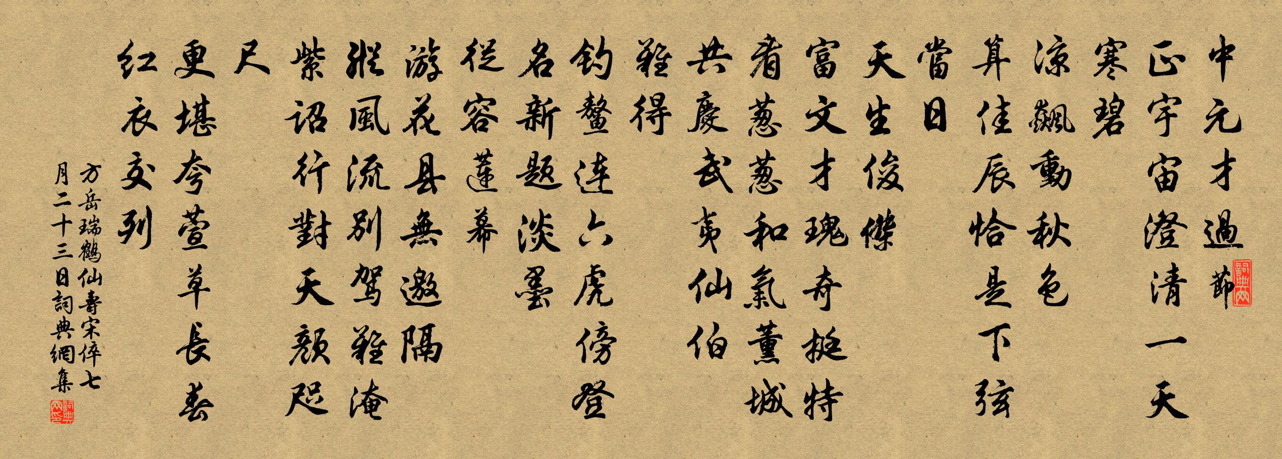 詩詞名句歷史字典書法欣賞書法字典國語詞典說文解字康熙字典古漢語字典標 題 作 者 詩 句 瑞鶴仙(壽宋倅·七月二十三日)作者:方岳 朝代:宋代原文中元才過節。正宇宙澄清,一天寒碧。涼飆動秋色。算佳辰恰是,下弦當日。天生俊傑。富文才、瑰奇挺特。看蔥蔥,和氣薰城,共慶武夷仙伯。難得。釣鰲連六,虎傍登名,新題淡墨。從容蓮幕。游花縣,無邀隔。縱風流別駕,難淹紫詔,行對天顏咫尺。更堪夸,萱草長春,紅衣交列。詩詞問答問:《瑞鶴仙(壽宋倅·七月二十三日)》的作者是誰?答:方岳問:該詩寫於哪個朝代?答:宋代問:該詩是什麼體裁?答:詞書法欣賞瑞鶴仙(壽宋倅·七月二十三日)書法作品詩詞推薦近清明二首張耒〔宋代〕冉冉春向老,昏昏日復斜。鮮歡常止酒,不睡更烹茶。幡起煙中剎,雞鳴林外家。陳王鬥雞道,風柳不勝斜。禪人並化主寫真求贊釋正覺〔宋代〕道隨緣而不變,源赴汲而不枯。禪悅之食兮飽其腹,法空之認兮跏其趺。青原自喜有麟角,黃檗誰嫌捋虎鬚。予自長沙還植蘭竹於東西軒調官京師逾年而歸楊時〔宋代〕柴桑衰晚愛吾廬,三徑歸來手自鋤。但得叔卿長飽飯,不妨孝若老談書。蘭因采佩枝先瘁,竹為凌霜葉自疏。留骨杜鵑花漫興張獻翼〔明代〕花花葉葉正含芳,麗景朝朝夜夜長。何事江南春去盡,子規聲里駐年光。窊樽韓維〔宋代〕閒坐閒行水際,自吟自嘯雲根。過盡春風秋月,無人共醉窊樽。劉貢父見余歌詞數首,以詩見戲,聊次其韻蘇軾〔宋代〕十載飄然未可期,那堪重作看花詩。門前惡語誰傳去,醉後狂歌自不知。刺舌君今猶未戒,灸眉吾亦更何辭。相從蕭阜水仙花釋文珦〔宋代〕江妃楚楚大江湄,玉冷金寒醉不歸。待得天風吹夢醒,露香清透綠雲衣。偈公六十五首釋鹹傑〔宋代〕一切數句非數句,與吾靈覺何交涉。毒蛇鑽入你鼻孔,蝦蟆咬破你眼睛。敬答李先生溫庭筠〔唐代〕七里灘聲舜廟前,杏花初盛草芊芊。綠昏晴氣春風岸,紅漾輕綸野水天。不為傷離成極望,更因行樂惜流年。一瓢句劉筠〔宋代〕酒供硯滴濡毫冷,火守更籌添漏長。絕句李流謙〔宋代〕霜乾木脫氣堅明,病骨驚寒亦強行。折得梅花全未吐,不慶於我尚含情。文宣王及其弟子贊宋高宗〔宋代〕惟禽之問,從容其鯉。求以異聞,詩禮云爾。請一得三,誠退而喜。且知將聖,不私其子。蘭花王邁〔宋代〕見山堂里小春寒,觴政詩囊甚有歡。重客分明知小李,美人自在寫猗蘭。直須博都去紉佩,只欠香來劣可餐。菊磵漁父吳鎮〔元代〕五嶺風光絕四鄰。滿川鳧雁是交親。雲觸岸,浪搖身。青草煙深不見冥冥寒食雨劉一止〔宋代〕冥冥寒食雨,客意向誰親?泉亂如爭壑,花寒欲傍人。生涯長剌促,老氣尚輪囷。不負年年債,清詩斷送春。括水調歌林正大〔宋代〕欲狀巴陵勝,千古岳之陽。洞庭在目,遠銜山色俯長江。浩浩橫無涯際,爽氣北通巫峽,南望極瀟湘。騷人與遷客偈頌七十一首釋了惠〔宋代〕兩手指天地,周行步更多。可憐黃面老,螃蟹落湯鍋。有感項安世〔宋代〕幾許心期百未價,更將疏發對蒼茫。江聲直上鯨波去,山色回看虎踞長。亂後碧蕪荒楚甸,雲間孤塔見維揚。承平欹枕宋祁〔宋代〕欹枕風窗雪絮繁,夢回紅日轉南軒。棲遲自樂周人什,偃息終非魏國藩。書習練裙聊弄翰,吟隨池草欲 * 。疏慵贈演說人釋慧遠〔宋代〕西湖演士妙天機,舌轉風雷口角飛。奪騎未聞沙寒冷,斬關先覺陣雲低。前賢后聖從君數,水遠山長我自知。皓首名句推薦福在積善,禍在積惡。黃石公《素書·安禮》 愔愔坊陌人家,定巢燕子,歸來舊處。周邦彥《瑞龍吟·大石春景》 牛困人飢日已高,市南門外泥中歇。白居易《賣炭翁》 假作真時真亦假,無為有處有還無。曹雪芹《紅樓夢·第一回》 莫辭盞酒十分勸,只恐風花一片飛。程顥《郊行即事》 應憐屐齒印蒼苔,小扣柴扉久不開。葉紹翁《遊園不值》 情共天涯秋黯,朱橋鎖深巷。吳文英《解蹀躞·醉雲又兼醒雨》 見善則遷,有過則改。佚名《易傳·象傳下·益》 鴛鴦俱是白頭時,江南渭北三千里。賀鑄《惜余春·急雨收春》 獨倚危欄,神遊無際,天地猶嫌隘。朱栴《念奴嬌·雪霽夜月中登樓望賀蘭山作》