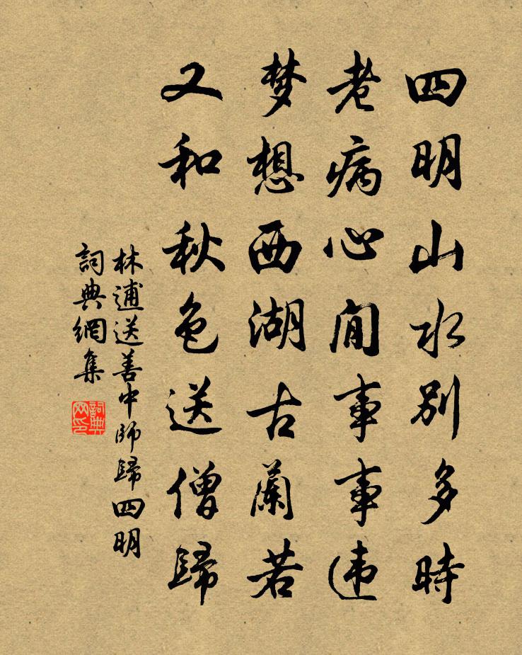 詩詞名句歷史字典書法欣賞書法字典國語詞典說文解字康熙字典古漢語字典標 題 作 者 詩 句 送善中師歸四明作者:林逋 朝代:宋代送善中師歸四明原文四明山水別多時,老病心閒事事違。夢想西湖古蘭若,又和秋色送僧歸。詩詞問答問:送善中師歸四明的作者是誰?答:林逋問:送善中師歸四明寫於哪個朝代?答:宋代林逋送善中師歸四明書法欣賞送善中師歸四明書法作品詩詞推薦偈傾一百三十三首釋法薰〔宋代〕吾常於此切,密意在汝邊。麟龍不為瑞,鶴龜自成仙。漢州塔二首郭印〔宋代〕相隨步屧轉穹隆,萬室鱗鱗指顧中。自笑情懷非曠士,誰知筋力已衰翁。吟餘尚惜西山日,立久翻憂北戶風。從此立春帖子太上皇后閣周必大〔宋代〕化國春偏好,慈闈日自長。仙韶喧法曲,齊勸萬年觴。寧化白水磜甲子春黃大受〔宋代〕雪瀑從天下,余流亦建瓴。雙崖秋氣逼,九地殷雷聲。虎穴山川險,蛟涎草木腥。負{左齒右差}由此徑,異日不送錢穆父出守越州絕句二首蘇軾〔宋代〕若耶溪水雲門寺,賀監荷花空自開。我恨今猶在泥滓,勸君莫棹酒船回。夜坐戲作陸游〔宋代〕颼颼松韻生魚眼,洶洶雲濤涌兔毫。促膝細論同此味,絕勝痛飲讀離騷。寄沈仲居進三國志劉過〔宋代〕萬死中原百戰爭,流芳遺臭各垂名。思量陳壽已饒舌,又費先生一管城。偈頌三十六首釋如珙〔宋代〕糞堆頭上,無人覷著。萬法紛紜,自起自滅。元日胡仲弓〔宋代〕元日山堂羅俎豆,潛知木主亦悲辛。土瓜溪筍非鄉物,臠肉村醪擬降神。盡日閒門無賀客,侵晨官道有行人。喜將贈僧文可往黃州建東坡寺樓鑰〔宋代〕一坡久矣郡城東,居士來游地望崇。問舍求田煩作計,拈槌豎佛看談空。共分龐老沈江寶,要奉儋州禿鬢翁。去作韓魏公生日強至〔宋代〕三秋開爽氣,七月降元精。致主鈞樞遍,尊賢袞鉞輕。顯庸歸社稷,陰相在神明。漳水流無竭,年年伴壽觥。禪人並化主寫真求贊釋正覺〔宋代〕聞名不如見面,都盧是個一件。風埃鬧處常閒,行市貴時卻賤。圓珠不撥轉,精金久磨鍊。觸犯機鋒兮青天流電。偈頌一百一十七首釋紹曇〔宋代〕三月青春彈指過,九旬朱夏又從頭。茶抽雀舌郎忙摘,麥弄蝦須逐旋收。熾然說法,聲撼林丘。挽張佛子王柏〔宋代〕嘉慶圖傳世所稀,夫何佛子遽西歸。平生施予心無為,時事艱難眾有依。德誼百年猶積累,詩書五世漸光輝。兒童送髯高謁方岩周文璞〔宋代〕客舍窘積雨,出門今始晴。藥苗隨野飯,燕子看山行。大道白日晚,閒汀綠芷生。方岩相見了,為謝草堂兄。遊俠篇(一作俠客行)陳子良〔唐代〕洛陽麗春色,遊俠騁輕肥。水逐車輪轉,塵隨馬足飛。雲影遙臨蓋,花氣近薰衣。東郊鬥雞罷,南皮射雉歸。日暮宿雲溪觀,賦得秋燈引送客楊衡〔唐代〕雲房寄宿秋夜客,一燈熒熒照虛壁。蟲聲呼客客未眠,幾人語話清景側。不可離別愁紛多,秋燈秋燈奈別何。潁川賞花二首陳襄〔宋代〕間入郊園駐隼旟,百花紅紫萬千株。如何春意多風雨,不惜漫天錦繡鋪。題袁學士像王致〔宋代〕平生有志惜分陰,經濟功夫著力深。一日高飛成遠舉,幾回懷古作豪吟。春風頻夢丹墀月,夏日長思玉館琴。天下閒居十首陳造〔宋代〕雪雲脫壞漏朝陽,風物橫前引興長。紅糝紫蕤今次第,遷鶯來燕費商量。名句推薦盡道隋亡為此河,至今千里賴通波。皮日休《汴河懷古二首》 言必信,行必果。孔子弟子《論語·子路篇》 不效艾符趨習俗,但祈蒲酒話昇平。殷堯藩《端午日》 唯器與名,不可以假人左丘明《左傳·成公·成公二年》 鹿車何日駕,歸去潁東田。歐陽修《秋懷》 雲中亂拍祿山舞,風過重巒下笑聲。杜牧《過華清宮絕句三首》 離多最是,東西流水,終解兩相逢。晏幾道《少年游·離多最是》 玉手佳人,笑把琵琶理。顧德輝《蝶戀花·春江暖漲桃花水》 窮巷多怪,曲學多辯。商鞅《商君書·更法》 恨舊愁新。有淚無言對晚春。淮上女《減字木蘭花·淮山隱隱》
