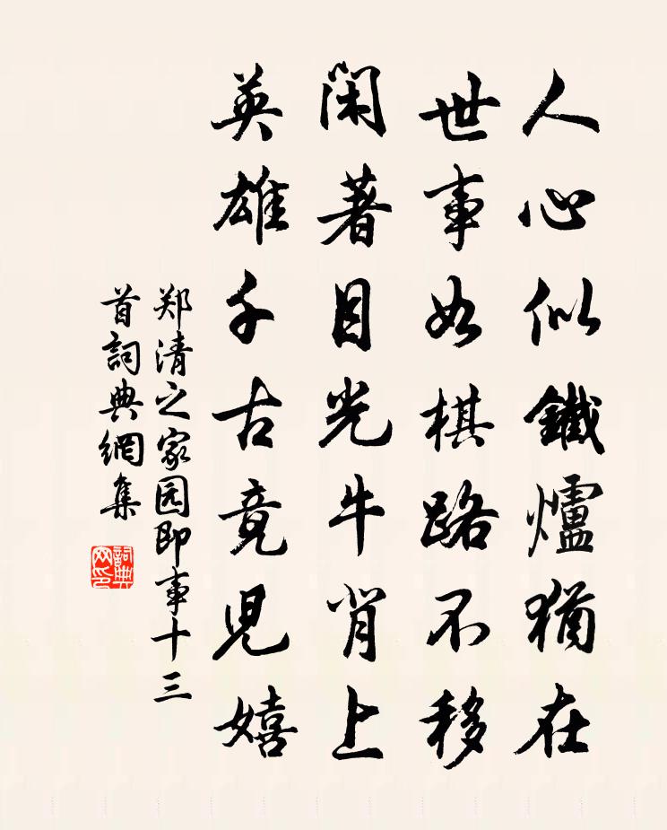 詩詞名句歷史字典書法欣賞書法字典國語詞典說文解字康熙字典古漢語字典標 題 作 者 詩 句 家園即事十三首作者:鄭清之 朝代:宋代家園即事十三首原文人心似鐵爐猶在,世事如棋路不移。閒著目光牛背上,英雄千古竟兒嬉。詩詞問答問:家園即事十三首的作者是誰?答:鄭清之問:家園即事十三首寫於哪個朝代?答:宋代鄭清之家園即事十三首書法欣賞家園即事十三首書法作品詩詞推薦醜奴兒/採桑子趙長卿〔宋代〕牡丹已過酴醿謝,飛盡繁花。濃翠啼鴉。綠水橋邊賣酒家。年時攜手尋春去,滿引流霞。往事堪嚓。猶喜潘郎鬢未邵伯埭下寄高郵陳郎中徐鉉〔唐代〕故人相別動經年,候館相逢倍慘然。雇我飲冰難輟棹,感君扶病為開筵。河灣水淺翹愁鷺,柳岸風微噪暮蟬。欲識句梁棟〔宋代〕千株守紅死,一點反魂歸。別後寄題漢嘉月榭范成大〔宋代〕隱吏詩情卜築幽,同年惜別勸淹留。試傾萬景湖亭酒,來看半輪江月秋。川路雖長猶共此,夜船空載且歸休。丘岩從王都尉覓千葉梅雲已落盡戲作嘲吹笛侍兒黃庭堅〔宋代〕若為可耐昭華得,脫帽看發已微霜。催盡落梅春已半,更吹三弄乞風光。紅樓夢十二曲——恨無常曹雪芹〔清代〕喜榮華正好,恨無常又到,眼睜睜把萬事全拋,盪悠悠芳魂銷耗。望家鄉路遠山高。故向爹娘夢裡相尋告:兒命已次韻成父舟中趙蕃〔宋代〕久客日復日,窮冬冰復冰。知還憐倦鳥,側翅恥飢鷹。搔發傷今老,沿塘記昔曾。舒憂足行卷,教諂謝書縢。三岩石楊修〔宋代〕蘿蔓藤花歲自添,露痕還似雨痕沾。莫將廢苑為間地,猶可岩岩作具瞻。鷓鴣天(贈外孫夔)仲並〔宋代〕間世麒麟降自天。光輝列宿燦初躔。他年身致夔龍列,少日心存翰墨邊。簪彩筆,照金蓮。詞華當使思如泉。未論新春感事八首終篇因以自解陸游〔宋代〕玻璃江上柳如絲,行樂家家要及時。只怪今朝空巷出,使君人日宴蟆頤。行香子王哲〔元代〕四鼓才平,木德行香。青龍上,坐個嬌娘。口賁赤氣,身掛朱裳。更戴瓊花,餐瓊蕊,飲瓊漿。往來諧歡, * 相龍掛陸游〔宋代〕成都六月天大風,髮屋動地聲勢雄。黑雲崔嵬行風中,凜如鬼神塞虛空,霹靂迸火射地紅。上帝有命起伏龍,龍尾謝葉處士寫照樓鑰〔宋代〕老我舊曾官日邊,隨眾年除仍歲遷。母子日夜念鄉國,但欲共耕綿上田。葉君寫照妙一世,畫我形模在山水。有如尾犯·夜雨滴空階柳永〔宋代〕夜雨滴空階,孤館夢回,情緒蕭索。一片閒愁,想丹青難貌。秋漸老、蛩聲正苦,夜將闌、燈花旋落。最無端處,趙路分輓詞三首林亦之〔宋代〕三月餘干花草春,天遙莫問謫仙墳。長簫不要吹哀吹,愁殺江東日暮雲。立春范成大〔宋代〕候管灰初動,條風已發春。萬靈歸化育,一氣驗平均。農事牛先示,人情蠖欲伸。憂哉漢疏廣,樽酒過嘉辰。雜詠一百首鄭司農劉克莊〔宋代〕新箋傳後學,古訓發先儒。不擬狂年少,燈前罵老奴。謝人惠茶梅堯臣〔宋代〕山色已驚溪上雷,火前那及兩旗開。采芽幾日始能就,碾月一罌初寄來。以酪為奴名價重,將雲比腳味甘回。更勞句張遜初〔宋代〕可惜年年明月夜,漁家只作等閒看。三月二十日東山雲蜿蜒而上眾指日龍也已而大晁公溯〔宋代〕東山龍起風雨來,勢雖暴甚天無雷。蜿蜒氣上黑雲合,喧豗浪打蒼崖回。千林通體有膏澤,四郊畫時無塵埃。舊聞名句推薦關山正飛雪,烽火斷無煙。王維《隴西行》 萬里不惜死,一朝得成功。高適《塞下曲》 青山欲共高人語。聯翩萬馬來無數。辛棄疾《菩薩蠻·金陵賞心亭為葉丞相賦》 奢侈者鮮有不敗李大師、李延壽《南史·列傳·卷四十五》 武帝宮中人去盡,年年春色為誰來。岑參《登古鄴城》 流光容易把人拋,紅了櫻桃,綠了芭蕉。蔣捷《一剪梅·舟過吳江》 吠犬雜鳴雞,燈火熒熒歸路迷。納蘭性德《南鄉子·秋暮村居》 亭亭山上松,瑟瑟谷中風。劉楨《贈從弟》 關山多雨雪,風水損毛衣。李遠《詠雁》 學之染人,甚於丹青。房玄齡《晉書·列傳·第五十二章》