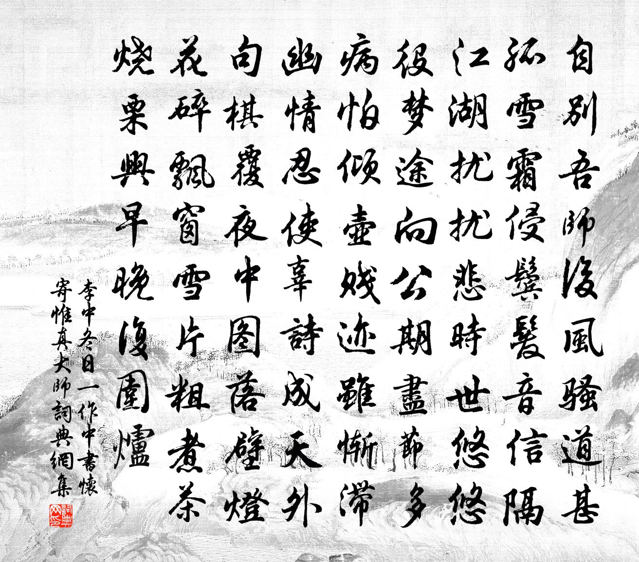詩詞名句歷史字典書法欣賞書法字典國語詞典說文解字康熙字典古漢語字典標 題 作 者 詩 句 冬日(一作中)書懷寄惟真大師作者:李中 朝代:唐代原文自別吾師後,風騷道甚孤。雪霜侵鬢髮,音信隔江湖。擾擾悲時世,悠悠役夢途。向公期盡節,多病怕傾壺。賤跡雖慚滯,幽情忍使辜。詩成天外句,棋覆夜中圖。落壁燈花碎,飄窗雪片粗。煮茶燒栗興,早晚復圍爐。詩詞問答問:《冬日(一作中)書懷寄惟真大師》的作者是誰?答:李中問:該詩寫於哪個朝代?答:唐代書法欣賞冬日(一作中)書懷寄惟真大師書法作品注釋全唐詩:卷750-42詩詞推薦三塔渰圩下二首岳珂〔宋代〕深不堪桴淺不浮,百艘鱗戢賈胡留。如泥乘橇禹行水,以力嬰天豐{戛去戈加喬}蕩舟。生息便疑吹野馬,陂陀正送趙諫議知徐州梅堯臣〔宋代〕鹿車幾兩馬幾匹,軫建朱幡騎彀弓。雨過短亭雲斷續,鶯啼高柳路西東。呂梁水注千尋險,大澤龍歸萬古空。莫問諸公和雷字韻茶詩四絕句外復有繼作輒續二篇蘇頌〔宋代〕團膏才就貢綱催,度嶺逾江萬里來。共看雲甌輕攪雪,還如春架動研雷。廬山有勝處曰臥龍南康朱使君始築茅繪諸葛武張栻〔宋代〕廬山仙靈宅,佳處固非一。頗聞臥龍勝,幽常諒難匹。懸瀑瀉琮碀,石壁兩崒嵂。草木被光輝,波瀾動回沒。今年霸國祠施樞〔宋代〕瓶笙驚晝睡,此意有誰知。蛙井成何事,鴻圖豈易窺。念奴嬌 中秋月次姚孝寧韻張玉娘〔元代〕冰輪駕海,破寒煙、萬點蒼山凝綠。清逼嫦娥秋殿靜,桂樹香飄金粟。萬頃琉璃,一天素練,光徹飛瓊屋。楚雲無尋魯城北范居士失道落蒼耳中見范置酒摘蒼耳作李白〔唐代〕雁度秋色遠,日靜無雲時。客心不自得,浩漫將何之。忽憶范野人,閒園養幽姿。茫然起逸興,但恐行來遲。城壕濯纓亭趙處澹〔宋代〕兩派清溪合,回波到此間。危峰衡古石,幽洞隔塵寰。雲影高低樹,嵐光遠近山。先賢遺蹟在,盍挽舊風還。富沙水後次壁間韻胡仲弓〔宋代〕聚落成墟空白煙,亂鴉飛繞夕陽邊。大江東去有遺恨,流水西來無渡船。青女魂游花委地,王孫腸斷草連天。一樽貧居趙汝績〔宋代〕適愛貧居好,全憐鷗鷺鄉。布衾魂夢穩,蔬食齒牙香。俗事吟邊少,時光靜里長。向南多隙地,無力創書台。佳人兩章寄許東溪樂雷發〔宋代〕衡之江,清且漪。我有佳人,在江之湄。朝餐菭蘠兮夕饌江蘺,欲往從之兮我馬虺隤。安得為琴高,沿波與君隨。以湯餅招韓伯周王岩起二提舉鄭深道曾宏甫二曾幾〔宋代〕鏡湖淮瀆舊刺史,廬阜赤城新使君。敢持湯餅一取飽,更用尊酒重論文。玉川遣奴致雙鯉,吏部呼兒書八分。不如月夜懷子肅昆仲趙蕃〔宋代〕眼邊風月佳如此,把卷題詩卻未工。剩喜俗塵如世隔,更憐清趣與誰同。荷侵水檻公懷我,檜合茅檐我念公。想與送汲助教醫博釋子淳〔宋代〕未到毗耶城,不識維摩病。有客兮良醫,妙術通神聖。金鍼鍼起髑髏吟,此曲千年誰與並。賈節庵冒夏暑越修塗過我苕霅情誼甚厚令聞古牟巘五〔宋代〕自言勤教督,燈火與之對。淵明定不孤,門戶期汝大。尋菊花潭主人不遇孟浩然〔唐代〕行至菊花潭,村西日已斜。主人登高去,雞犬空在家。春近山中即事陸游〔宋代〕乞得松楠手自栽,結茅聊喜避風埃。百年孰與夢長短,萬事只如雲去來。雪後梅花初半吐,身閒樽酒盍頻開。錦官安樂窩中自貽邵雍〔宋代〕物如善得終為美,事到巧圖安有公。不作風波於世上,自無冰炭到胸中。災殃秋葉霜前墜,富貴春華雨後紅。造化致語口號陸游〔宋代〕涼月參差白露漙,請看賓主罄清歡。麟符玉節交相映,鳳竹鸞絲殊未闌。百穀方登倉庚足,七州無事裡閭安。樽前送定維那釋宗演〔宋代〕興化當年為克賓,棒頭敲出玉麒麟。遯庵放過定禪者,只要渠儂眼自明。名句推薦神龜雖壽,猶有竟時。曹操《龜雖壽》 父耕原上田,子劚山下荒。聶夷中《田家》 言則稱於湯文,行則譬於狗豨,傷矣哉。墨子《墨子·46章 耕柱》 鳥飛千白點,日沒半紅輪。白居易《彭蠡湖晚歸》 平生不做皺眉事,世上應無切齒人。佚名《增廣賢文·上集》 所志在功名,離別何足嘆。陸龜蒙《別離》 當路誰相假,知音世所稀孟浩然《留別王侍御維/留別王維》 國無九年之蓄曰不足,無六年之蓄曰急,無三年之蓄曰國非其國也。戴聖《禮記·王制》 漢將歸來虜塞空,旌旗初下玉關東。戎昱《塞下曲》 東風灑雨露,會入天地春。李白《送郄昂謫巴中》