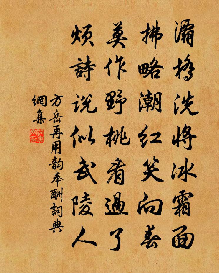詩詞名句歷史字典書法欣賞書法字典國語詞典說文解字康熙字典古漢語字典標 題 作 者 詩 句 再用韻奉酬作者:方岳 朝代:宋代再用韻奉酬原文灞橋洗將冰霜面,拂略潮紅笑向春。莫作野桃看過了,煩詩說似武陵人。詩詞問答問:再用韻奉酬的作者是誰?答:方岳問:再用韻奉酬寫於哪個朝代?答:宋代方岳再用韻奉酬書法欣賞再用韻奉酬書法作品詩詞推薦過靜老吳則禮〔宋代〕老夫無住相,大是箇中人。聊作宰官相,偶名居士身。拍手與化笑,同床憐吾真。端來趁齋鼓,共坐不曾嗔。武陵春晁端禮〔宋代〕湖上風光寒食近,準擬醉花枝。不忍東風爛熳時。紅淚濕胭脂。情知今後游從少,鸞鏡懶重窺。金鳳銜花舊繡衣。鄰叟言於石〔宋代〕客行歸故鄉,依依一鄰叟。把酒向我言,重嘆生不偶。大男年二十,前年方娶婦。府帖點鄉兵,井邑備攻守。萬騎寄上叔父夷仲三首黃庭堅〔宋代〕關寒塞雪欲嗣音,燕雁拂天河鯉沈。百書不如一見面,幾日歸來兩慰心。弓刀陌上望行色,兒女燈前語夜深。更懷橫碧軒曾幾〔宋代〕道山心已灰,但有愛山癖。移家過溪住,政為數峰碧。空濛梅子雨,了不見顏色。朝來忽獻狀,欣若對佳客。晴窗題新淦劉貞女傳郭彥章〔宋代〕百年節義仗英豪,一死翻憐女子高。不敢高歌題卷上,轉喉恐觸舊官曹。冬夜山中尋友(一作僧)李頻〔唐代〕何人山雪夜,相訪不相思。若得長閒日,應無暫到時。葉寒凋欲盡,泉凍落還遲。即此天明去,重來未有期。孟夏思渭村舊居寄舍弟白居易〔唐代〕嘖嘖雀引雛,稍稍筍成竹。時物感人情,憶我故鄉曲。故園渭水上,十載事樵牧。手種榆柳成,陰陰覆牆屋。兔隱贈回道士滕宗諒〔宋代〕華州回道士,來到岳陽城。別我游何處,秋空一劍橫。杏蘇軾〔宋代〕開花送余寒,結子及新火。關中幸無梅,汝強充鼎和。滿宮花·花正芳張泌〔唐代〕花正芳,樓似綺,寂寞上陽宮裡。鈿籠金鎖睡鴛鴦,簾冷露華珠翠。嬌艷輕盈香雪膩,細雨黃鶯雙起。東風惆悵欲留別南徐故人周賀〔唐代〕三年蒙見待,此夕是前程。未斷卻來約,且伸臨去情。潮回灘鳥下,月上客船明。他日南徐道,緣君又重行。秋獲後即事陸游〔宋代〕秋獲春耕力尚余,雨中襏襫種寒蔬。築居正可茨生草,出市何妨借蹇驢。老境朝晡數匙飯,腐儒生死一編書。敲門思平泉樹石雜詠一十首重台芙蓉李德裕〔唐代〕芙蓉含露時,秀色波中溢。玉女襲朱裳,重重映皓質。晨霞耀丹景,片片明秋日。蘭澤多眾芳,妍姿不相匹。題麗句亭葛紹體〔宋代〕玉謝風流盟未寒,枝藤杯酒翠微間。松花半落春山暮,雲滿一溪春水閒。贈姜邦傑潘檉〔宋代〕詩人擁節古來稀,今見梅山際盛時。傳世篇章紅錦爛,去天門戶碧油垂。風霜氣老同陳柏,亭館花開對蜀葵。應記題畫廿四首唐寅〔明代〕山亭寥落接人稀,泥補柴門葉補衣。不起竹床頭似雪,已無心去問襌機。題漢州西湖薛能〔唐代〕西湖天下名,可以濯吾纓。況是攜家賞,從妨半驛程。嘗茶春味渴,斷酒晚懷清。盡得幽人趣,猶嫌守吏迎。重餐贈別元十八協律六首(桂林伯,桂管觀察使裴行立也)韓愈〔唐代〕知識久去眼,吾行其既遠。瞢瞢莫訾省,默默但寢飯。子兮何為者,冠珮立憲憲。何氏之從學,蘭蕙已滿畹。於何偈頌一百三十六首釋惟一〔宋代〕鼓報四更,地搖六震。火焰為三世諸佛說法,三世諸佛立地聽。虛空有盡,大道無窮。窮則變,變則通。信手拈將名句推薦冰泮寒塘水綠,雨余百草皆生。韋應物《三台》 清明又近也,卻天涯為客。曹組《憶少年·年時酒伴》 布穀飛飛勸早耕,舂鋤撲撲趁春睛。姚鼐《山行·布穀飛飛勸早耕》 清淚浥羅巾,各自消魂,一江離恨恰平分。陸游《浪淘沙·丹陽浮玉亭席上作》 天時人事日相催,冬至陽生春又來。杜甫《小至》 酒意詩情誰與共?淚融殘粉花鈿重。李清照《蝶戀花·暖雨晴風初破凍》 春晚綠野秀,岩高白雲屯。謝靈運《入彭蠡湖口》 非鬼亦非仙,一曲桃花水辛棄疾《生查子·獨游雨岩》 黃埃散漫風蕭索,雲棧縈紆登劍閣。白居易《長恨歌》 揮手自茲去,蕭蕭班馬鳴。李白《送友人》