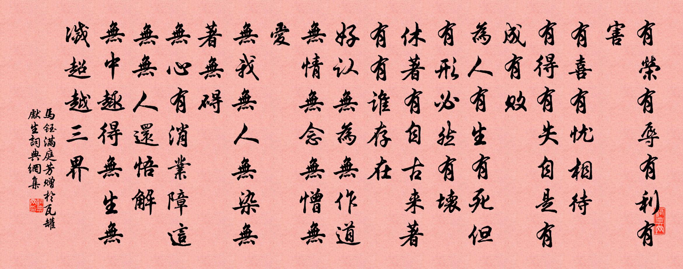 詩詞名句歷史字典書法欣賞書法字典國語詞典說文解字康熙字典古漢語字典標 題 作 者 詩 句 滿庭芳 贈於瓦罐先生作者:馬鈺 朝代:元代滿庭芳 贈於瓦罐先生原文有榮有辱,有利有害。有喜有憂相待。有得有失,自是有成有敗。為人有生有死,但有形、必然有壞。休著有,自古來著,有有誰存在。好認無為無作,道無情無念,無憎無愛。無我無人無染,無著無礙。無心有消業障,這無無、人還悟解。無中趣,得無生無滅,超越三界。詩詞問答問:滿庭芳 贈於瓦罐先生的作者是誰?答:馬鈺問:滿庭芳 贈於瓦罐先生寫於哪個朝代?答:元代問:滿庭芳 贈於瓦罐先生是什麼體裁?答:詞馬鈺滿庭芳 贈於瓦罐先生書法欣賞滿庭芳 贈於瓦罐先生書法作品詩詞推薦偶成曹彥約〔宋代〕可笑禪流錯用心,或思或罷兩追尋。窮年費煞精神後,陷入泥塗輾轉深。踏莎行(和趙國興知錄韻)辛棄疾〔宋代〕吾道悠悠,憂心悄悄。最無聊處秋光到。西風林外有啼鴉,斜陽山下多衰草。長憶商山,當年四老。塵埃也走鹹陽西江月尹志平〔元代〕淺見有知有識,深通無悟無迷。瞭然頓覺入希夷。此是男兒正智。達道豈離方寸,明心何在天西。終朝閒坐細尋思滿庭芳 贈長安徐先生馬鈺〔元代〕一明玄理,二曜交宮。三才四象究窮。通五彩霞光,來往清雨ㄨㄨ。六欲七情滌盡,八衢流、運轉迴風。九竅內,寄楊次雲岸長老吳芾〔宋代〕高僧良士總貪閒,雖我同庚不往還。詩罷誰知勤治圃,齋余無事只潛山。亦聞相約來傾蓋,久待如何未叩關。湖上頌古一百首釋智愚〔宋代〕雪老門高兒女盛,又能情重貴天倫。把家幹蠱雖相似,也有貪杯落草人。偈頌二百零五首釋正覺〔宋代〕人平不語,水平不流。嘉州大象,陝府鐵牛。莫怪扶桑最先照,大都家住海門洲。雪中用黃太史韻馮時行〔宋代〕密雪誰人巧擬鹽,初飛仍帶雨廉纖。夜吹玉笛滿浮酒,曉看遙山高捲簾。方積銀杯翻過馬,欲銷冰箸插疏檐。不堪題李山人白居易〔唐代〕廚無煙火室無妻,籬落蕭條屋舍低。每日將何療饑渴?井華雲粉一刀圭。偈頌四十一首釋慧暉〔宋代〕寒夜無炭衰老衣,涼機透骨古堂微。霜辛雪苦慕先律,雨宿風餐圓後奇。句釋惠崇〔宋代〕雲陰移漢塞,石色入秦天。孟府送猿有頌次韻謝之釋心月〔宋代〕居從岩洞友熊羆,養在侯門送石溪。要識將軍成物意,往來莫作聽猿啼。菩提廢寺周弼〔宋代〕野寺孤僧住,當春亦掩扉。曉鍾三板去,昏杵一盂歸。古屋垂山榧,幽窗養石韋。未容行客憩,荒樹雨鳩飛。謀創領要亭汪熙〔宋代〕生平酷愛山,好山寧相遠。知吾入山意,幽致競牽挽。信步杖藜輕,升高腰腳健。小雨著黃落,索索聲相溷。僧窗九華觀宴餞崔十七叔判官赴義武幕兼呈書記蕭校書權德輿〔唐代〕炎光三伏晝,洞府宜幽步。宿雨潤芝田,鮮風搖桂樹。陰陰台殿敞,靡靡軒車駐。晚酌臨水清,晨裝出關路。偏榮題舊藁徐瑞〔宋代〕書向愁邊著,詩添病後吟。不成千古事,空費一生心。華發江湖晚,青燈風雲深。鍾期那可鑄,齋網斷紋琴。獻淮南李相公趙嘏〔唐代〕傅岩高靜見台星,廟略當時討不庭。萬里有雲歸碧落,百川無浪到滄溟。軍中老將傳兵術,江上諸侯受政經。聞道慶建州葉守劉克莊〔宋代〕袖中凝香未必非,建人惟恐我公歸。安知世有孤寒士,側聽黃麻侍袞衣。賀太常黃少卿呂聲之〔宋代〕自從朝奏一封還,便整歸裝問故山。剩得清名千載重,何妨晚節十年閒。慣尋夜雪逵溪路,卻謝春風漢殿班。國史寄題開福院白蓮堂張景脩〔宋代〕玉色荷花自是仙,道人更慕遠公賢。此生欲結東林社,求取新詩十八篇。名句推薦亦有白骨歸鹹陽,營家各與題本鄉。王建《渡遼水》 峨嵋山下少人行,旌旗無光日色薄。白居易《長恨歌》 公子南橋應盡興,將軍西第幾留賓。杜審言《春日京中有懷》 蘭帳玉人睡覺,怪春衣、雪沾瓊綴。章楶《水龍吟·燕忙鶯懶芳殘》 日光下澈,影布石上,佁然不動;柳宗元《小石潭記》 夜寒微透薄羅裳,無限思量。秦觀《畫堂春·春情》 故人何在,煙水茫茫。柳永《玉蝴蝶·望處雨收雲斷》 同聲相應,同氣相求。佚名《易傳·乾文言》 紫艷半開籬菊靜,紅衣落盡渚蓮愁。趙嘏《長安晚秋 / 秋望 / 秋夕》 二月春花厭落梅。仙源歸路碧桃催。晏幾道《浣溪沙·二月春花厭落梅》