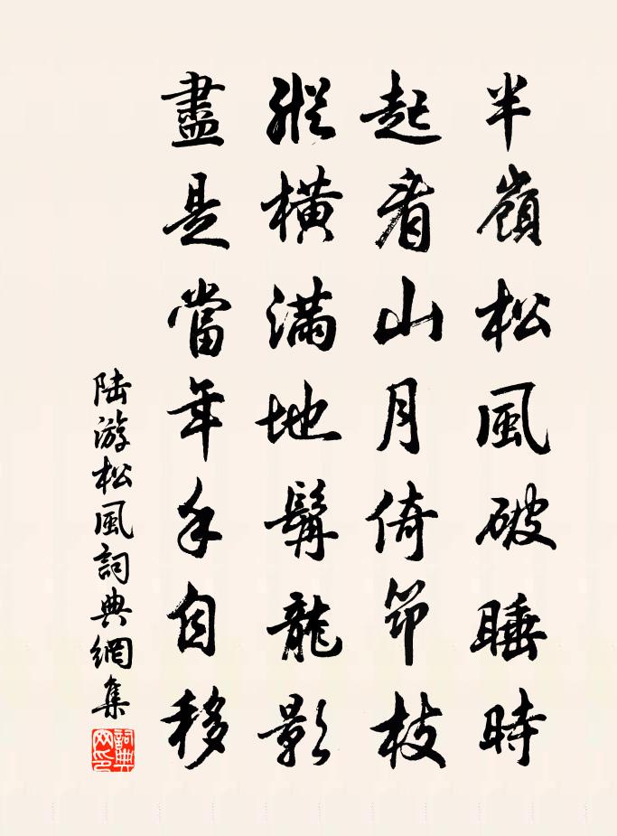 詩詞名句歷史字典書法欣賞書法字典國語詞典說文解字康熙字典古漢語字典標 題 作 者 詩 句 松風作者:陸游 朝代:宋代松風原文半嶺松風破睡時,起看山月倚筇枝;縱橫滿地髯龍影,儘是當年手自移。詩詞問答問:松風的作者是誰?答:陸游問:松風寫於哪個朝代?答:宋代問:陸游的名句有哪些?答:陸游名句大全陸游松風書法欣賞松風書法作品詩詞推薦山亭柳·贈歌者晏殊〔宋代〕家住西秦。 * 藝隨身。花柳上、斗尖新。偶學念奴聲調,有時高遏行雲。蜀錦纏頭無數,不負辛勤。數年來往鹹雜曲歌辭江上曲李嘉佑〔唐代〕江上澹澹芙蓉花,江口蛾眉獨浣紗。可憐應是陽台女,坐對鸕鶿嬌不語。掩面羞看北地人,回首忽作空山雨。蒼梧送廣東潘帥移鎮湖南十口號曾豐〔宋代〕廣州初怨失吾侯,逕入中都為借留。上詔廣人好歸去,朕心先已許潭州。寄題雲門寺梵月無側房(時人相傳是寶月道人後身也)皎然〔唐代〕越山千萬雲門絕,西僧貌古還名月。清朝掃石行道歸,林下眠禪看松雪。彩雲軒蔡元厲〔宋代〕洞府神仙此是家, * 曾駐五雲車。峰前三尺寒泉水,猶有白蓮開舊花。九日賞菊陳與義〔宋代〕黃花不負秋,與秋作光輝。夜霜猶作惡,朝日為解圍。今晨豈重九,節意入幽菲。孤芳擅天地,眾卉亦已微。殷勤仆與公采戶曹奉議有先世之契又舊從其伯仲游李彌遜〔宋代〕縛此窄窄晝常關,剝啄髯參興盡還。不聽高譚如屑玉,強酬好句似登山。論交此地逢三益,識面它時孰兩難。更憶醉落魄/一斛珠沈瀛〔宋代〕致知格物。初學工夫參聖域。天高地遠無窮極。欲造精微,莫若守惟一。純全天理明如日。都緣人慾來相惑。且將題涪翁亭黃然〔宋代〕清音妙絕東坡老,方響名高太史公。水繞烏尤談笑外,江連洪雅畫圖中。盧郎中雲夫寄示送盤穀子詩兩章,歌以和之韓愈〔唐代〕昔尋李願向盤谷,正見高崖巨壁爭開張。是時新晴天井溢,誰把長劍倚太行。衝風吹破落天外,飛雨白日灑洛陽。元日得雨袁說友〔宋代〕知時膏澤下新正,便覺欣欣物意生。細雨寒梢半檐滴,單床孤夢五更聲。兩年元日嗟萍梗,萬里殊鄉付酒觥。不似孫使君約觀燈以病不果往以詩見強次韻和酬毛滂〔宋代〕羅綺山前捲旆風,夜遊車馬畫中。落梅已恨青春減,投轄那憂碧酒空。座上精明唯定國,眼中耐久只元同。勤呼為秋雲王安石〔宋代〕秋雲放雨靜山林,萬壑崩湍共一音。欲記荒寒無善畫,賴傳悲壯有能琴。玉蝴蝶(和劉清安)尹濟翁〔宋代〕幾許暮春清思,未知芍藥,先擬荼蘼。老卻東風,春去不與人期。似情多、何曾荀倩,便夢斷、不為崔徽。且銜杯閘上 其一王冕〔元代〕舒嘯孤懷壯,天風盪杳冥。草枯秦地白,雲盡魯山青。聞道尊莊子,沽杯候野亭。平生辛苦事,須信此行經。端午內中帖子詞皇帝閣王珪〔唐代〕御醑璩杯白,仙風羽扇清。靈符不須進,漢壘已銷兵。西江月姬翼〔元代〕巨細洪纖在在,飛潛動植芸芸。乾坤升降不停輪。借問誰為轉運。妙理周行獨立,真君莫測冥存。一針一草盡渾淪林景雲參學薛嵎〔宋代〕一門四世同堂樂,門外傳呼釋褐歸。自此高車訪游舊,屏將呵從叩漁扉。三冬晴暖春寒在,千里詩書野意違。又說再次韻酬俞君任陳造〔宋代〕闖首亨衢屬壯年,即今奔騖恐徒然。時情合退羊腸步,宦路難加馬腹鞭。朱紫浪驚流俗眼,風騷要拍古人肩。歸休題金山郭璞墓釋崇岳〔宋代〕要識先生真實地,龍門浪里碧崔嵬。時人著眼這國立,親切何如到一回。名句推薦留連戲蝶時時舞,自在嬌鶯恰恰啼。杜甫《江畔獨步尋花·其六》 沉憂能傷人,綠鬢成霜蓬。李白《怨歌行》 布衣得暖真為福,千金平安即是春。佚名《增廣賢文·下集》 楚水巴山江雨多,巴人能唱本鄉歌。劉禹錫《竹枝詞二首·其二》 看似尋常最奇崛,成如容易卻艱辛。王安石《題張司業詩》 柳絲長,桃葉小。深院斷無人到。晏幾道《更漏子·柳絲長》 不盡眼中青,是愁來時節張元乾《石州慢·寒水依痕》 應無所住而生其心。鳩摩羅什譯《金剛經·莊嚴淨土》 微風起,清芬醞藉,不減酴醿。李清照《多麗·詠白菊》 紙灰飛作白蝴蝶,淚血染成紅杜鵑。高翥《清明日對酒》