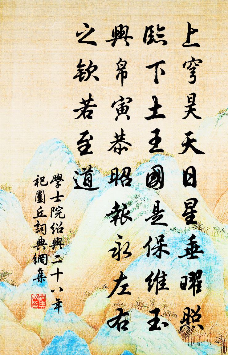 詩詞名句歷史字典書法欣賞書法字典國語詞典說文解字康熙字典古漢語字典標 題 作 者 詩 句 紹興二十八年祀圜丘作者:學士院 朝代:宋代紹興二十八年祀圜丘原文上穹昊天,日星垂曜。照臨下土,王國是保。維玉興帛,寅恭昭報。永左右之,欽若至道。詩詞問答問:紹興二十八年祀圜丘的作者是誰?答:學士院問:紹興二十八年祀圜丘寫於哪個朝代?答:宋代學士院紹興二十八年祀圜丘書法欣賞紹興二十八年祀圜丘書法作品詩詞推薦王寶謨輓詩魏了翁〔宋代〕滬江鮫夜泣,柳廟鶴秋飛。零露傷蘭穎,淒風撼王徽。焄蒿恍兮惚,精爽是邪非。豈必存亡問,吾知全以歸。夜閒(此後並悼亡)元稹〔唐代〕感極都無夢,魂銷轉易驚。風簾半鉤落,秋月滿床明。悵望臨階坐,沉吟繞樹行。孤琴在幽匣,時迸斷弦聲。竹章雲心〔宋代〕萬朵奇雲繞屋飛,雲心修竹綠猗猗。孤高不為風霜折,正直只應天地知。四海久無龍化處,千年幾具雁來時。晉林三姝媚·煙光搖縹瓦史達祖〔宋代〕煙光搖縹瓦。望晴檐多風,柳花如灑。錦瑟橫床,想淚痕塵影,鳳弦常下。倦出犀帷,頻夢見、王孫驕馬。諱道相送居厚弟二首劉克莊〔宋代〕少日魚同隊,中年雁失群。寧師楚勝舍,不羨洛機雲。春夢謝池草,冰銜漢合人。向來麾節處,盡說小馮君。早春陸龜蒙〔唐代〕雨冷唯添暑,煙初不著春。數枝花纇小,愁殺扈芳人。下橫山,灘頭望金華山四首楊萬里〔宋代〕道是蘭溪水較寬,蘭溪欲到怪生難。後船隻羨前船快,不覺前船閣在灘。南樓懷古五首周弼〔宋代〕幸際清時息五兵,舌頑無處說縱橫。蟻封一夢難分別,蝸角千年強鬥爭。丹壁郵亭新蜀道,白樓烽戍古邾城。自知句王隨〔宋代〕松檜陰中閒覆局,芰荷香里靜垂鉤。對菊懷古史鑄〔宋代〕靖節先生菊滿園,其名獨有九華存。東籬若許塵蹤到,佳品須當盡討論。春風李鹹用〔唐代〕青帝使和氣,吹噓萬國中。發生寧有異,先後自難同。輦草不消力,岩花應費功。年年三十騎,飄入玉蟾宮。暇日邀王天任諸公游南坡天任有詩因次韻虞儔〔宋代〕我詩苦艱澁,蹇步太行巔。筆乾硯欲裂,何地覓湧泉。巧匠愧傍觀,袖手不能前。敝帚徒自珍,捧心豈成妍。辟舍傳言玉女(許永之以水仙、瑞香、黃香梅、幽蘭同坐,名生四和,即席賦此)楊無咎〔宋代〕小院春長,整整繡簾低軸。異葩幽艷,滿千瓶百斛。珠鈿翠佩,塵襪錦籠環簇。日烘風和,奈何芬馥。鳳髓龍津,石門岩壁黃鑒〔宋代〕峭壁矗雲三峽里,急湍翻雪五湖邊。何年造物施神力,移到褒中小有天。邢氏園池上作趙蕃〔宋代〕可意於茲夕,乃能來此風。稻畦初吠蛤,草岸已鳴蟲。三徑思茅屋,歸艎憶釣筒。淵明寧隱者,魯望豈漁翁。和子瞻新居欲成二首蘇轍〔宋代〕老罷子卿還屬國,功成定遠恨陽關。漂流豈必風波際,顛沛何妨枕席間。伏臘便應隨俚俗,室廬聞似勝家山。因緣送僧游山熊孺登〔唐代〕雲身自在山山去,何處靈山不是歸。日暮寒林投古寺,雪花飛滿水田衣。獨坐敬亭山李白〔唐代〕合沓牽數峰,奔地鎮平楚。中間最高頂,髣髴接天語。睢陽五老圖司馬光〔宋代〕圖謀已就樂時間,曉向田園喜脫冠。心志不灰猶有策,星長還在尚無桓。朝陽鳴鳳身輕暖,赴壑剛蛇齒健寒。俯表崔遠送瘙利詩帖贊岳珂〔宋代〕唐而乾寧,果何時。作書及詩,且恬以嬉。燁胥之不知,而拳拳於一緇。吁其可悲。名句推薦戎衣不脫隨霜雪,汗馬驂單長被鐵。李昂《從軍行》 城邊有古樹,日夕連秋聲。李白《沙丘城下寄杜甫》 寧可枝頭抱香死,何曾吹落北風中。鄭思肖《畫菊》 人閒桂花落,夜靜春山空。王維《鳥鳴澗》 生資之高在忠信,非關機巧;學業之美在德行,不僅文章。王永彬《圍爐夜話·第十則》 風吹芳蘭折,日沒鳥雀喧。李白《送裴十八圖南歸嵩山二首》 以五十步笑百步。孟子《孟子·梁惠王章句上·第三節》 善善不進,惡惡不退;賢者隱蔽,不肖在位;國受其害。黃石公《三略·上略》 殷勤昨夜三更雨,又得浮生一日涼。蘇軾《鷓鴣天·林斷山明竹隱牆》 娶妻無媒毋須恨,書中自有顏如玉。趙恆《勸學詩》