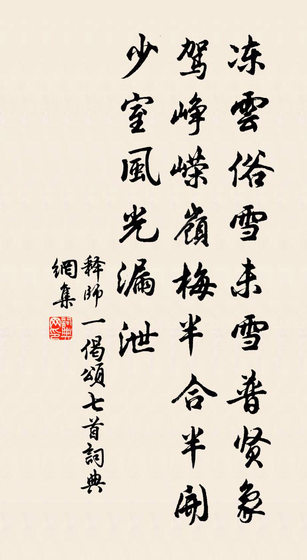 詩詞名句歷史字典書法欣賞書法字典國語詞典說文解字康熙字典古漢語字典標 題 作 者 詩 句 偈頌七首作者:釋師一 朝代:宋代偈頌七首原文凍雲俗雪未雪,普賢象駕崢嶸。嶺梅半合半開,少室風光漏泄。詩詞問答問:偈頌七首的作者是誰?答:釋師一問:偈頌七首寫於哪個朝代?答:宋代釋師一偈頌七首書法欣賞偈頌七首書法作品詩詞推薦和李公擇赴歷下道中雜詠十二首 梁山泊〈次蘇轍〔宋代〕近通沂泗麻鹽熟,遠控江淮粳稻秋。粗免塵泥污車腳,莫嫌菱蔓繞船頭。謀夫欲就桑田變,客意終便畫舫游。愁思五知堂梅堯臣〔宋代〕履道坊中白家宅,五橋莊北晉公堂。昔年二老曾相樂,今日五知名獨光。舉事是非都不問,接花寺節暫能忙。清尊水調歌頭(壽丘提刑)方岳〔宋代〕甓社有明月,夜半吐光寒。淮南草木飛動,秀出鬥牛間。自有秦沙以後,試問少游而下,誰捲入毫端。補袞仲山甫已亥雜詩 196龔自珍〔清代〕一十三度溪花紅,一百八下西溪鍾。卿家滄桑卿命短,渠儂不關關我儂。次韻袁升之游雲寺鴻慶院山茶之什蒲瀛〔宋代〕對境那能問色空,山茶花發映蓮宮。攻餘瑟瑟風搖綠,刑盡猩猩日曬紅。大雪迷漫元鬥異,千林搖落不雷同。何須黃鶴洞中仙 繼重陽韻馬鈺〔元代〕清將功夫做。自是生玄露。密灑靈苗溉紫芝,漸覺氣神住。謹謹須當訴。決定參隨去。物外勤修大藥成,同上蓬萊採珠行元稹〔唐代〕海波無底珠沉海,採珠之人判死采。萬人判死一得珠,斛量買婢人何在。年年採珠珠避人。今年採珠由海神。海神卷耳解張載〔宋代〕閨閫誠難與國防,默嗟徒御困高岡。觥罍欲解痡瘏恨,采耳元因備酒漿。頌古十首釋端裕〔宋代〕波斯捧出海南香,白眼崑崙與論量。賈客不諳彈舌語,只看兩個鼻頭長。己未新歲陸游〔宋代〕餞歲愁雖劇,迎年喜亦深。桃符帶草寫,椒酒過花斟。車馬久無跡,兒孫聊慰心。更欣春意早,處處有鳴禽。與王仲密諸君泛湖強至〔宋代〕十月清霜後,孤舟顥氣間。酒邊頹白日,棹底倒青山。境勝歡憂泯,吟頻物象慳。吾儕一笑後,魚鳥伴誰閒。悼止齋王先生 其二王冕〔元代〕文採風流今已矣,夫何能見紫芝眉?中天氣黯星河慘,南國春寒草木悲。政事堂堂傳兩省,論談娓娓動諸司。老成次青溪後二章為別衛宗武〔宋代〕今古多紛攘,宇宙彌氛埃。故友晨星然,往往淪劫灰。幸得莫逆交,子輿從子來。道義本契合,心跡無疑猜。不徒歲晏思歸五首宋庠〔宋代〕世有功名羨,人將躁靜殊。冥鴻專避弋,斗鶡喜捐軀。駕敗誰矜巧,山移卻信愚。白雲無誚我,歸意本區區。寒食日寄楊東川白居易〔唐代〕不知楊六逢寒食,作底歡娛過此辰?兜率寺高宜望月,嘉陵江近好遊春。蠻旗似火行隨馬,蜀妓如花坐繞身。不使江州周寺丞泳夷亭蘇轍〔宋代〕行過廬山不得上,湓江城邊一惆悵。羨君山下有夷亭,千岩萬壑長相向。山中李生好讀書,出山作郡山前居。手開寄龍巖張節翁丁高林〔宋代〕歸向龍巖岩下房,又添移竹種松忙。江湖萬事孤燈夜,風月千篇滿鏡霜。日暮烏棲梧葉落,天晴雁過菊花香。誠知酬金部王郎中省中春日見寄盧綸〔唐代〕南宮樹色曉森森,雖有春光未有陰。鶴侶正疑芳景引,玉人那為簿書沈。山含瑞氣偏當日,鶯逐輕風不在林。更有贄奉使總領大卿林宗放〔宋代〕昔賢兩手並擎天,鰲極功成勢晏然。宗廟鼎彝刊祖烈,相門衣缽付家傳。藍田種玉連連好,滄海遺珠顆顆圓。六合夢亡友劉太白同游彰敬寺白居易〔唐代〕三千里外臥江州,十五年前哭老劉。昨夜夢中彰敬寺,死生魂魄暫同游。名句推薦送君九月交河北,雪裡題詩淚滿衣。岑參《送崔子還京》 此夜星繁河正白,人傳織女牽牛客。沈佺期《七夕曝衣篇》 極目離離,遍地濛濛,官橋野塘。陳維崧《沁園春·詠菜花》 秋風蕭瑟,洪波湧起。曹操《觀滄海 / 碣石篇》 織婦何太忙,蠶經三臥行欲老。元稹《織婦詞》 垂柳依依惹暮煙,素魄娟娟當繡軒。王元鼎《憑欄人·閨怨》 山河破碎風飄絮,身世浮沉雨打萍。文天祥《過零丁洋》 三杯兩盞淡酒,怎敵他、晚來風急?李清照《聲聲慢·尋尋覓覓》 秦時明月漢時關,萬里長征人未還。王昌齡《出塞二首·其一》 不見襄陽登覽,磨滅遊人無數,遺恨黯難收。陸游《水調歌頭·多景樓》
