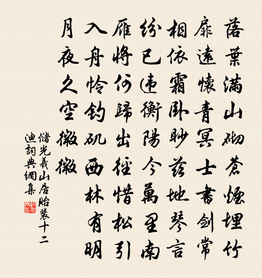 詩詞名句歷史字典書法欣賞書法字典國語詞典說文解字康熙字典古漢語字典標 題 作 者 詩 句 山居貽裴十二迪作者:儲光羲 朝代:唐代山居貽裴十二迪原文落葉滿山砌,蒼煙埋竹扉。遠懷青冥士,書劍常相依。霜臥眇茲地,琴言紛已違。衡陽今萬里,南雁將何歸。出徑惜松引,入舟憐釣磯。西林有明月,夜久空微微。詩詞問答問:山居貽裴十二迪的作者是誰?答:儲光羲問:山居貽裴十二迪寫於哪個朝代?答:唐代問:山居貽裴十二迪是什麼體裁?答:五古儲光羲山居貽裴十二迪書法欣賞山居貽裴十二迪書法作品注釋全唐詩:卷136_37詩詞推薦滿庭霜(宴黃仲秉鎮江守)葛郯〔宋代〕紅葉飛時,青山缺處,雲橫秋影斜陽。鳳凰旌節,何事到吾鄉。要見大江東去,寒光靜、水與天長。人爭看,恩袍正月二十五日以小疾在告作三絕是日苦寒張耒〔宋代〕春色三分有尚多,且饒芳草占高坡。門前柳色如彭澤,爭奈陶君止酒何次韻君用寄茶方岳〔宋代〕茅捨生苔費夢思,竹爐烹雪復何時。北山怕有移文在,謹勿便令猿鶴知。箜篌張祜〔唐代〕星漢夜牢牢,深簾調更高。亂流公莫度,沉骨嫗空嗥。向月輕輪甲,迎風重紉條。不堪聞別引,滄海恨波濤。邊思李益〔唐代〕腰懸錦帶佩吳鉤,走馬曾防玉塞秋。莫笑關西將家子,只將詩思入涼州。貽羅竹谷楊長孺〔宋代〕與世長多忤,持身轉覺孤。夤緣新齒舌,收拾老頭顱。我已訶瀧吏,君誰誦子虛。同歸燈火讀,家裡石渠書。奉和幸禮部尚書竇希玠宅應制(一作陪幸五王宅)李乂〔唐代〕家住千門側,亭臨二水傍。貴游開北地,宸眷幸西鄉。曳履迎中谷,鳴絲出後堂。浦疑觀萬象,峰似駐三光。草向翠微堂陸游〔宋代〕萬頃青山只一溪,此中聊欲效真棲。尋深巧被閒雲到,破靜時聞幽鳥啼。羞有卑功追管晏,慚無高節比夷齊。困眠山中秋興沈說〔宋代〕山戶少曾扃,居貧易得清。秋衣和月臥,溪茗雜雲烹。學字書紅葉,看騷些落英。從他頭早白,心事本和平。周濤權宰大冶以湖光亭詩見寄因和之金君卿〔宋代〕面揖清光萬頃陂,滿簾秋色曙陰微。迴環遠岫煙中辯,片段閒雲鏡里飛。富冶地饒民訟簡,洞庭風便客舟稀。知君作盆池養科斗數十戲作陸游〔宋代〕小小盆池不畜魚,題詩聊記破苔初。未聽兩部鼓吹樂,且看一編科斗書。檀溪尋故人(一題作檀溪尋古)孟浩然〔唐代〕花伴成龍竹,池分躍馬溪。田園人不見,疑向洞中棲。送唐彥英李若水〔宋代〕一鞭行色黃榆路,望斷遙天垂地處。嗚嗚流水如有情,瀉我離愁向東去。踏莎行元好問〔金代〕月掛瓊鉤,日添鄉線。綺花翻良重重卷。風口環佩曉珊珊,畫堂羯鼓催開宴。翠縷香凝,玉膏酒灩。仙翁莫訴玻璃耿天騭惠梨次韻奉酬三首王安石〔宋代〕陳跡難尋天柱源,疏封投老誤明恩。國人慾識公歸處,楊柳蕭蕭白下門。陪趙公子游蔣山即席次李五峰韻陳旅〔元代〕弭棹丹陽郭,鳴鞭白下山。晴原煙翳翳,幽樹鳥關關。石液玻璃碧,雲根瑪瑙殷。佛岩開細菊,僧逕入從菅。雨洗子用惠魚四軸以詩謝之王炎〔宋代〕四幅溪藤任卷舒,管城幻出化龍魚。風雷定似梭飛走,莫誤呼兒覓素書。詠菊白居易〔唐代〕一夜新霜著瓦輕,芭蕉新折敗荷傾。耐寒唯有東籬菊,金粟初開曉更清。定風波王吉昌〔元代〕悟結清涼浩劫因。生涯淡薄出囂塵。物物般般心上離,思純。克勤虛谷養元神。接物和光循德柄,無方應變任天真賀王起(一作賀王侍郎典貢放榜)廣宣〔唐代〕從辭鳳閣掌絲綸,便向青雲領貢賓。再辟文場無枉路,兩開金榜絕冤人。眼看龍化門前水,手放鶯飛谷口春。明日名句推薦窮且益堅,不墜青雲之志。王勃《滕王閣序》 正見空江明月來,雲水蒼茫失江路。歐陽修《晚泊岳陽》 如何同枝葉,各自有枯榮李白《樹中草》 氣軟來風易,枝繁度鳥遲。李爽《芳樹》 殘霞夕照西湖好,花塢苹汀,十頃波平,野岸無人舟自橫。歐陽修《採桑子·殘霞夕照西湖好》 醉里挑燈看劍,夢回吹角連營。辛棄疾《破陣子·為陳同甫賦壯詞以寄之》 旌旆夾兩山,黃河當中流。李白《經亂離後天恩流夜郎憶舊遊書懷贈江夏韋太守良宰》 必得之事,不足賴也;必諾之言,不足信也。管仲《管子·形勢》 慎終如始,則無敗事。老子《老子·德經·第六十四章》 布衣菜飯,可樂終身,不必作遠遊計也。沈復《浮生六記·閨房記樂》
