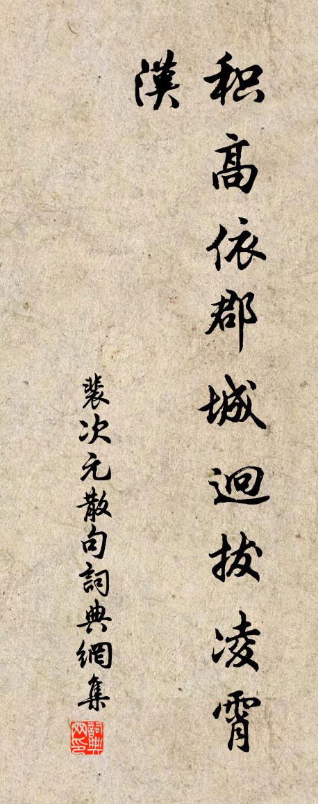 詩詞名句歷史字典書法欣賞書法字典國語詞典說文解字康熙字典古漢語字典標 題 作 者 詩 句 句作者:裴次元 朝代:唐代句原文積高依郡城,迥拔凌霄漢。詩詞問答問:句的作者是誰?答:裴次元問:句寫於哪個朝代?答:唐代問:句是什麼體裁?答:句裴次元句書法欣賞句書法作品注釋全唐詩:卷466-26詩詞推薦皇帝在建邸請升堂偈釋宗杲〔宋代〕豁開頂門眼,照徹大千界。既作法中王,於法得自在。寄趙庶明推官石介〔宋代〕四十年來贊太平,君王耳畔管簫聲。定襄地域俄連震,萊牧男兒忽議兵。明日邊烽高百尺,同時御府出三旌。將軍予客三池王正卿以四絕見寄姿其韻李流謙〔宋代〕佳人望斷日平西,可意相逢眼底稀。漫說攜家終是客,開愁唯有醉淋衣。句朱貞白〔宋代〕倒排雙陸子,稀插碧牙籌。既似柿牛妳,又如鈴馬兜。鼓搥並{左扌右暴}箭,直是有來田。呈尤運使袤延之五首趙蕃〔宋代〕往者江次對,不妄出薦口。門無雜遝賓,麟角鱉肋九。斯文獨許公,是謂言可否。幾年闕通謁,今乃獲拜手。過臥龍先生幽居李新〔宋代〕手調鼎劑作清涼,不秘千金肘後方。閒數嶺雲松自翠,臥聽梅雨藥初香。三山夢斷黃粱熟,一逕莓封白日長。我欲劉器之陰山七騎圖孔武仲〔宋代〕北風颯颯邊雲黃,飛沙噎日天慘蒼。駕鵝鳴哀雁不翔,七騎正出陰山旁。山傍陰塵歲無陽,鳥飛墮翼人立僵。犯寒晚秋西省寄上李韓二舍人司空曙〔唐代〕晝漏傳清唱,天恩禁旅秋。雁親承露掌,砧隔曝衣樓。賜膳中人送,餘香侍女收。仍聞勞上直,晚步鳳池頭。撫州對事後送外生宋垓歸饒州覲侍呈上姊夫戴叔倫〔唐代〕淮汴初喪亂,蔣山烽火起。與君隨親族,奔迸辭故里。京口附商客,海門正狂風。憂心不敢住,夜發驚浪中。雲開八月十六日夜月唐彥謙〔唐代〕斷腸佳賞固難期,昨夜銷魂更不疑。丹桂影空蟾有露,綠槐陰在鵲無枝。賴將吟詠聊惆悵,早是疏頑耐別離。堪恨侄阿鍾覓字與詩姚勉〔宋代〕阿鍾五歲已大奇,從我覓字與覓詩。栗梨不愛愛紙筆,此意豈是尋常兒。吟詩寫字非難事,字畫是心詩是志。器量四絕贈馬浩然法師張道陵葛立方〔宋代〕靈桃入手亦艱勤,正一門中僅策勛。未說趙升王長在,鵠鳴衣缽已輸君。寄題徐仲晦須友堂二首劉克莊〔宋代〕西山仙去各離群,窮達區區不足雲。僅有尹譙守伊洛,更無房魏說河汾。虎皮子盍闓新義,蠹簡予方輯舊聞。何日和孫明府懷舊山雍陶〔唐代〕五柳先生本在山,偶然為客落人間。秋來見月多歸思,自起開籠放白鷳。舟次武陵寄天竺僧無晝許渾〔唐代〕谿長山幾重,十里萬株松。秋日下丹檻,暮雲歸碧峰。樹棲新放鶴,潭隱舊降龍。還在孤舟宿,臥聞 * 鍾。重經故人舊居釋紹嵩〔宋代〕五字研成舉世傳,醉吟朝夕在樊川。江南海北三千里,雨散雲飛二十年。壁上塵黏蒲葉扇,鏡中人入洞庭煙。倦遊山中感興三首文天祥〔宋代〕桃花何夭夭,楊柳何依依。去年白鳥集,今年黃鵠飛。昔為江上潮,今為山中雲。江上潮有聲,山中雲無情。一年歸燕杜牧〔唐代〕畫堂歌舞喧喧地,社去社來人不看。長是江樓使君伴,黃昏猶待倚欄乾。送吳待制帥襄陽二首尤袤〔宋代〕方持紫橐侍西清,忽領雄藩向暑行。誰謂風流貴公子,甘為辛苦一書生。詞源筆下三千牘,武庫胸中十萬兵。從此伏虎嶺殘雪趙文〔宋代〕晴得一霜晴更穩,飽飯不怕伏虎嶺。山高積雪凍猶在,昨日空驚雪畫本。日烘高樹玉槎牙,時有冰花墮無影。紛紛名句推薦長風蕭蕭渡水來,歸雁連連映天沒。盧思道《從軍行》 從善如順流,去惡如探湯。房玄齡《晉書·列傳·第五十七章》 時人不識農家苦,將謂田中谷自生。顏仁郁《農家》 使君宏放,談笑洗盡古今愁。陸游《水調歌頭·多景樓》 君子戒慎乎其所不睹,恐懼乎其所不聞。子思《中庸·第一章》 廄馬散連山,軍容威絕域。李白《君子有所思行》 黑髮不知勤學早,白首方悔讀書遲。顏真卿《勸學詩》 桂林風景異,秋似洛陽春。宋之問《始安秋日》 學者不患才之不贍,而患志之不立。徐幹《中論·上卷·治學》 良藥苦口利於病,忠言逆耳利於行。宋濂、王褘《元史·列傳·卷五十五》