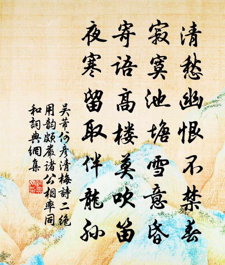 詩詞名句歷史字典書法欣賞書法字典國語詞典說文解字康熙字典古漢語字典標 題 作 者 詩 句 何彥清梅詩二絕用韻頗嚴諸公相率同和作者:吳芾 朝代:宋代原文清愁幽恨不禁春,寂寞池塘雪意昏。寄語高樓莫吹笛,夜寒留取伴龍孫。詩詞問答問:《何彥清梅詩二絕用韻頗嚴諸公相率同和》的作者是誰?答:吳芾問:該詩寫於哪個朝代?答:宋代書法欣賞何彥清梅詩二絕用韻頗嚴諸公相率同和書法作品詩詞推薦冬至後三日與羅楚入倅廳兩松下梅花盛開取酒朱翌〔宋代〕老松鱗甲待拿雲,俯視梅花意亦親。粉色上參冬嶺秀,虬枝下挽越溪真。乘閒到此能終日,與我來游盡可人。今代詠雪岩羅禧〔宋代〕山回百折路難躋,遠望樓台煙樹迷。滿地白雲封洞口,一輪紅日照天梯。龜蛇伏氣時難老,鸞鶴歸來夜倦飛。萬壑白雲峰楊蟠〔宋代〕萬頃田間雨,多從頂上生。野人猶不足,常擬鑿為平。戲投竹葉急流中郭印〔宋代〕戲投筠葉赴湍流,顛倒縱橫不自由。我亦江湖飄一葦,千波萬浪信沉浮。寄鍾常侍羅隱〔唐代〕一從朱履步金台,櫱苦冰寒奉上台。峻節不由人學得,遠途終是自將來。風高漸展摩天翼,乾聳方呈構廈材。應笑都下無憂館小樓春盡旅懷二首楊萬里〔宋代〕不關老去願春遲,只恨春歸我未歸。最是楊花歁客子,向人一一作西飛。挽禮侍中舍朔齋劉公三首劉克莊〔宋代〕元佑相君才六世,端平朝士不多人。冰翁仙去傳佳婿,鐵漢亡來有後身。誰向淹中起綿蕝,何曾閣下掌絲綸。未知題三洞喻良能〔宋代〕千古巢仙地,嵌空本自然。一看三嘆息,十步九留連。似入華陽洞,疑通小有天。何時洗塵垢,來作枕流眠。卯時酒白居易〔唐代〕佛法贊醍醐,仙方夸沆瀣。未如卯時酒,神速功力倍。一杯置掌上,三咽入腹內。煦若春貫腸,暄如日炙背。豈獨句高似孫〔宋代〕東西都漢猶司馬,三百年唐只次山。七月既望晚觀菱壕楊萬里〔宋代〕官壕水落兩三痕,正是秋初雨後天。菱荇中間開一路,曉來誰過采菱船。踏沙行晏幾道〔宋代〕宿雨收塵,朝霞破暝,風光暗許花期定。玉人呵手試妝時,粉香簾幕陰陰靜。斜雁朱弦,孤鸞綠鏡,傷春誤了尋芳木稼方岳〔宋代〕春日電光飛霹靂,元日奇寒雪盈尺。銷瓊融玉夜色凝,贔屓穹林矗僵立。鮫人淚滴珊瑚枝,通身擎出青琉璃。霜皮奉使道中作歐陽修〔宋代〕客夢方在家,角聲已催曉;匆匆行人起,共怨角聲早。馬蹄終日踐冰霜,未到思回空斷腸。少貪夢裡還家樂,早起予初謫嶺南過田氏水閣東南一峰豐下銳上俚人蘇軾〔宋代〕倚天巉絕玉浮屠,肯與彭郎作小姑。獨秀江南知有意,要三二別四三壺。朝中措王武子〔宋代〕畫眉人去掩蘭房。金鴨懶薰香。有恨只彈珠淚,無人與說衷腸。玉顏雲鬢,春花夜月,辜負韶光。閒看枕屏風上,三月六日再用韻二首方回〔宋代〕百杯不亂善食酒,如手拜玉肘生柳。貌醉心醒戒亢悔,一斟一酌乾用九。猶龍世豈無斯人,漁網可致皆常鱗。蜾蠃送鄭推官赴分州司馬光〔宋代〕形便豳公國,旗旄擁將壇。秦雲低落日,塞樹 * 。草檄無留思,投壺不廢歡。還應笑黃卷,寂寂守儒官。虎牙行(虎牙在荊門之北,江水峻急)杜甫〔唐代〕秋風欻吸吹南國,天地慘慘無顏色。洞庭揚波江漢回,虎牙銅柱皆傾側。巫峽陰岑朔漠氣,峰巒窈窕谿谷黑。杜鵑次韻十絕染須樓鑰〔宋代〕染須欲學少年時,笑殺當年榮啟期。公道世間惟此耳,年來猶幸不相欺。名句推薦風摧寒棕響,月入霜閨悲。李白《獨不見》 牛困人飢日已高,市南門外泥中歇。白居易《賣炭翁》 夜來能有幾多寒,已瘦了、梨花一半。黃升《鵲橋仙·春情》 是他春帶愁來,春歸何處。辛棄疾《祝英台近·晚春》 談歡則字與笑並,論戚則聲共泣偕劉勰《文心雕龍·誇飾》 二十四橋仍在,波心蕩、冷月無聲。姜夔《揚州慢·淮左名都》 反者道之動;弱者道之用。老子《老子·德經·第四十章》 欲將輕騎逐,大雪滿弓刀。盧綸《和張僕射塞下曲·其三》 運往無淹物,年逝覺已催。謝靈運《歲暮》 過五關,斬六將馮夢龍《喻世明言·卷三十一》