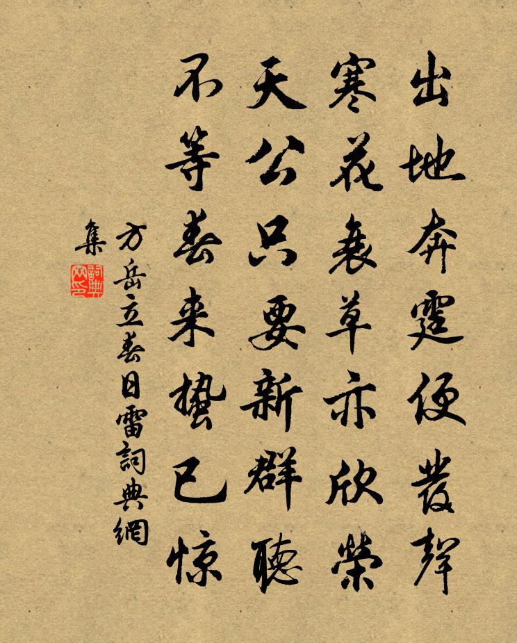 詩詞名句歷史字典書法欣賞書法字典國語詞典說文解字康熙字典古漢語字典標 題 作 者 詩 句 立春日雷作者:方岳 朝代:宋代立春日雷原文出地奔霆便發聲,寒花衰草亦欣榮。天公只要新群聽,不等春來蟄已驚。詩詞問答問:立春日雷的作者是誰?答:方岳問:立春日雷寫於哪個朝代?答:宋代方岳立春日雷書法欣賞立春日雷書法作品詩詞推薦紀事二十四首梁啓超〔清代〕眼中直欲無男子,意氣居然我丈夫。二萬萬人齊下拜,女權先到火奴奴。游龍山靜勝寺張說〔唐代〕每上襄陽樓,遙望龍山樹。郁茀吐岡嶺,微蒙在煙霧。下車歲已成,飾馬閒餘步。苦霜裛野草,愛日揚江煦。雲對少保席間道襄州朋舊項安世〔宋代〕持杯相向各言衰,憶得襄州未老時。曉踏青山尋秀句,夜簪紅藥聽新詞。只言坐上皆豪逸,誰信人間有別離。頭白送蔡秀才之漳浦釋善珍〔宋代〕夜冷螢窗書倦看,解鞍南去路漫漫。霜乾處士梅花圃,日照先生苜蓿盤。乞米剩堪供鶴料,釣鰲重怕壞魚竿。何當題屈翁山詩札、石濤石溪八大山人山水鄭燮〔清代〕國破家亡鬢總皤,一囊詩畫作頭陀。橫塗豎抹千千幅,墨點無多淚點多!題王宗哲六柳堂張憲武〔宋代〕六柳先生以道鳴,歸家高伴子真耕。方瞳綠鬢君知否,一片靈台畫不成。和酬孫少述曾鞏〔宋代〕自信簞瓢樂,寧羞猿鶴驚。論高知峻節,交淡見純誠。自昔心無間,相逢眼更明。何當薦有道,坐想軟輸迎。再寄元真宮讀書強至〔宋代〕讀書曾寄此軒頭,官路歸來十二秋。文酒故人無一在,蓬蒿荒徑有餘愁。差池歲月辜金印,憔悴乾坤復布裘。卻掃過秦樓曾棟〔宋代〕曙色開晴,輕颸敷暖,日影才經檐角。倦來芳徑,且倚闌乾,觸地新愁粘著。長日如年,可堪恨雨絲絲,夢去漠漠頌古二十五首釋崇岳〔宋代〕出水何如未出水,蓮花荷葉有來田。定光金地遙招手,智者江陵暗點頭。偶見吟邵雍〔宋代〕世上多附炎,炎歇人自去。君子善處約,約久情自固。炎歇勢不回,情固人不去。路人或如親,親人卻如路。廣陵行韋應物〔唐代〕雄藩鎮楚郊,地勢郁岧嶢。雙旌擁萬戟,中有霍嫖姚。海雲助兵氣,寶貨益軍饒。嚴城動寒角,晚騎踏霜橋。翕習送裘父侄還鄉二首曾協〔宋代〕氣吐長虹一世豪,尚憐花草助風騷。正須重碧澆胸次,不遣輕霜上鬢毛。浪說清時敞東閣,誰捐好語到西曹。江神惜奴嬌王之道〔宋代〕甚麽因緣,恰得一年相聚。和閏月、更無剩數。說著分飛,背面偷彈玉箸。好去。記取許時言語。舊愛新人,後夜祭公諫征犬戎佚名〔先秦〕穆王將征犬戎,祭公謀父諫曰:“不可。先王耀德不觀兵。夫兵,戢而時動,動則威;觀則玩,玩則無震。是故周念奴嬌葉夢得〔宋代〕故山漸近,念淵明歸意,翛然論誰。歸去來兮秋已老,松菊三徑猶存。稚子歡迎,飄飄風袂,依約舊衡門。琴書蕭次韻書事朱翌〔宋代〕當年司馬溫公力,今日宣仁聖烈尊。哲後在天何慍喜,要令元老雪沉冤。感皇恩 漫興王寂〔元代〕天地一浮萍,人生如寄。畫餅功名竟何益。百年渾醉,三萬六千而已。過了一日也、無一日。韶顏暗改,良辰易失三龕張耒〔宋代〕萬穴列岩壁,三龕獨雄夸。封山鑿其骨,開像儼且呀。悲哉輕人功,不計歲月賒。像成竟何補,國破荒蓬麻。悠悠餞送高大著出鎮嚴陵劉克莊〔宋代〕抗疏鳴陽易,翻身出晝難。無家歸蜀道,有敕管嚴灘。席藁臣言戇,分茅聖度寬。空令同館士,極目認帆竿。名句推薦郵亭無人處,聽檐聲不斷,困眠初熟。周邦彥《大酺·越調春雨》 不看僧面看佛面。吳承恩《西遊記·第三十一回》 今日重來訪,不見知音人。馮夢龍《警世通言·卷一》 有不虞之譽,有求全之毀。孟子《孟子·離婁章句上·第二十一節》 尚憶先朝多樂事,孝皇曾為兩宮開。王守仁《元夕二首》 異鄉物態與人殊,惟有東風舊相識歐陽修《春日西湖寄謝法曹歌》 問君何能爾?心遠地自偏。陶淵明《飲酒·其五》 年年歲歲花相似,歲歲年年人不同。劉希夷《代悲白頭翁 / 白頭吟 / 有所思》 明妃留在兩眉愁,萬古春山顰不盡元好問《玉樓春·驚沙獵獵風成陣》 照野瀰瀰淺浪,橫空隱隱層霄。蘇軾《西江月·頃在黃州》