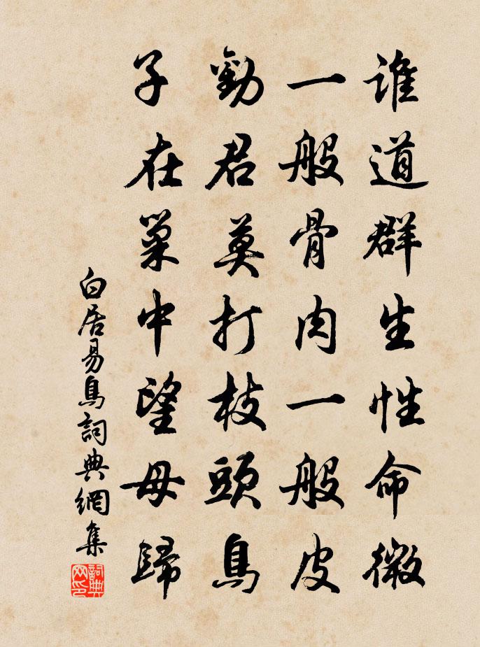 如果說自然界的定義是生靈皆平等,那么人類社會的規則強化萬物為三六九等。白詩人聽高僧說,惡雖小不可為,善雖小必為。他曾經以為生命的不平等,終於轉化為自然界的萬物平等。說的是鳥,其實喻義著現實社會,皇家貴族性命高嗎?貧窮百姓生命微乎?都是一樣的皮肉,都有母子情深,詩人希望社會充滿愛和歡樂,那是烏托邦還是桃花源?朱門桃李雙爭艷,貧家薄衫難遮寒。勸君莫有窮富論,一般骨肉一般情。