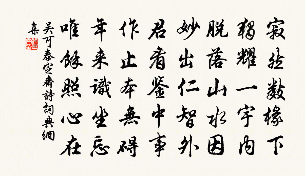 詩詞名句歷史字典書法欣賞書法字典國語詞典說文解字康熙字典古漢語字典標 題 作 者 詩 句 泰定齋詩作者:吳可 朝代:宋代泰定齋詩原文寂然數椽下,獨耀一宇內。脫落山水因,妙出仁智外。君看鑒中事,作止本無礙。年來識坐忘,唯余照心在。詩詞問答問:泰定齋詩的作者是誰?答:吳可問:泰定齋詩寫於哪個朝代?答:宋代吳可泰定齋詩書法欣賞泰定齋詩書法作品詩詞推薦記蕭大山父子樂雷發〔宋代〕仙桂靈椿各典刑,飄飄姿韻激天鯨。家傳八葉鹽梅種,詩接三蘇父子名。四海盡將看縣譜,一堂那許與文盟。塵埃水龍吟蕭元之〔宋代〕人生何必求名,身閒便是名高處。臥雲衣袂,何因自染,修塗塵土。世路羊腸,人情狙賦,翻雲覆雨。把從前舊夢轎中假寐李曾伯〔宋代〕孤枕欠曉夢,短輿償午眠。籃搖小兒臥,龕定老僧禪。少瞑溪山眼,良勞僕從肩。醒來斜日暮,亟喚玉驄鞭。感事朱槔〔宋代〕元規負康濟,徒手嬰群雄。兵從歷陽來,無地逃奸鋒。誰乎死社稷,千載一卞公。英風與義氣,建立萬江東。秋胡行徐集孫〔宋代〕五年行邁兮歸遲遲,採桑山陰兮奉親慈。冰霜自潔兮清節持,有客遺金兮志不移。橐有金兮盍專為母馳,心悅桑女和虞智父登清谿閣許志仁〔宋代〕葉脫林梢處處秋,壯懷易感更登樓。日伴鍾阜煙凝碧,霜落秦淮水慢流。人似沖宣思故國,詩如杜老到夔州。十年九月晦日作陸游〔宋代〕山路清寒近探梅,振衣高處興悠哉!飛鴻杳杳江天闊,一片愁從萬里來。雜曲歌辭宜城歌劉禹錫〔唐代〕野水繞空城,行塵起孤驛。花台側生樹,石碣陽鐫額。靡靡度行人,溫風吹宿麥。知十月六日,席上與同座客陸宅之、夏士文及主楊維楨〔元代〕新潑葡萄琥珀濃,酒逢知己量千鍾。犀盤箸落眠金鹿,雁柱弦鳴應玉龍。紫蟹研膏紅似橘,青蝦剝尾綠如蔥。彩雲歸朝歡 和蘇堅伯固蘇軾〔宋代〕我夢扁舟浮震澤。雪浪搖空千頃白。覺來滿眼是廬山,倚天無數開青壁。此生長接淅。與君同是江南客。夢中游,題蕭令山則文編二首劉克莊〔宋代〕咄咄人皆怪老夫,奈何此客去難呼。招溫處士為羅否,待穆先生設醴無。我有青芻堪秣馬,君言白髮久占烏。人生緣識宋太宗〔宋代〕懸鑒高明鬼亦愁,方知研醜更玄幽。恆持大道真空理,清靜煙波可自由。湖亭酌王史君紀事並呈看花諸君子吳泳〔宋代〕紅雨斑斑點嫩苔,朱輪軋軋碾輕埃。園公不作橘中隱,康節肯從花外來。鶯囀樹林添道韻,鷗分江色獻詩材。籃輿過秦樓利登〔宋代〕眉黛山分,索取靨合,鬱郁夜堂初見。芙蓉寄隱,豆蔻傳香,便許翠鬟偷剪。迎夜易羞,欲晨先怯,風流楚楚未慣題梅齋鄧肅〔宋代〕江邊蘆葦風颼颼,東君一點破寒愁。窗間疏影橫春瘦,枕上冷香尋夢幽。夜半竹折驚殘雪,醉起捲簾千山月。肺腑中秋對月有感強至〔宋代〕西風入夜掃微雲,皓魄來無一點塵。樓閣通宵雙玉戶,水天隨處兩冰輪。光搖樽酒清宜客,影落關河思煞人。我向【中呂】粉蝶兒_思情霧鬢雲張鳴善〔元代〕思情霧鬢雲鬟,楚宮腰素妝打扮,恰便似玉天仙謫降人間。殢人嬌,良人種,誤遭一難。雖然與風月同班,比其自和伯氏懷人韻蔡沈〔宋代〕懷人復懷人,懷憂不能寫。滄浪有舟楫,使欲從東下。春寒雨淋淋,舟楫不可尋。臨流一惆悵,直下萬里深。漁者貫休〔唐代〕風惡波狂身似閒,滿頭霜雪背青山。相逢略問家何在,回指蘆花滿舍間。謝通講師五偈釋正覺〔宋代〕得得客來窺大方,松間目擊揖歸堂。秋橫兩眼瞳人碧,雲擁三衣梔子香。奪席胸襟君隗礧,愕鄰鬚髮我滄浪。竹床名句推薦九日黃花酒,登高會昔聞。岑參《奉陪封大夫九日登高》 面譽者不忠,飾貌者不情戴聖《大戴禮記·文王官人第七十二》 十四萬人齊解甲,更無一個是男兒!花蕊夫人《述國亡詩》 鐵衣霜露重,戰馬歲年深。戎昱《塞下曲·其六》 心欲小而志欲大,智欲員而行欲方劉安及其門客《淮南子·主術訓》 問別來、解相思否。吳文英《惜秋華·七夕前一日送人歸鹽官》 何時倚虛幌,雙照淚痕乾。杜甫《月夜》 愛子心無盡,歸家喜及辰。蔣士銓《歲暮到家》 少婦今春意,良人昨夜情。沈佺期《雜詩三首·其三》 慘慘柴門風雪夜,此時有子不如無。黃景仁《別老母》
