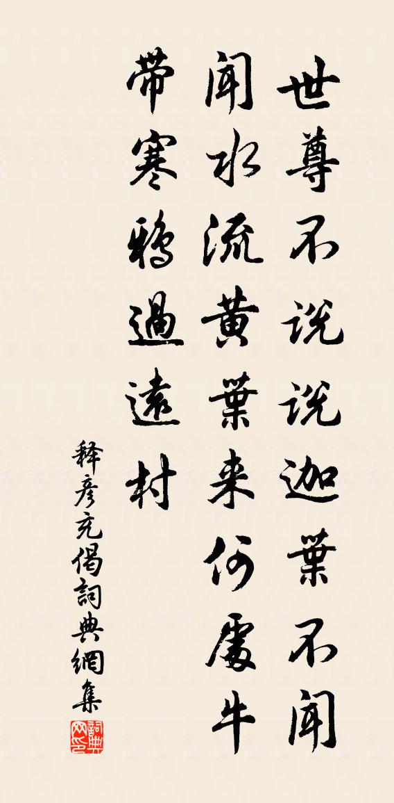 詩詞名句歷史字典書法欣賞書法字典國語詞典說文解字康熙字典古漢語字典標 題 作 者 詩 句 偈作者:釋彥充 朝代:宋代偈原文世尊不說說,迦葉不聞聞。水流黃葉來何處,牛帶寒鴉過遠村。詩詞問答問:偈的作者是誰?答:釋彥充問:偈寫於哪個朝代?答:宋代釋彥充偈書法欣賞偈書法作品詩詞推薦郎官湖春日四首李祁〔宋代〕兩山收雨暗平沙,遮斷溪梅隔水花。留得煙林作圖畫,依稀鬆磴有人家。中原晁公溯〔宋代〕中原北望連虎牢。遺老略皆死草茅。腥臊千秋萬歲殿,塵埃四通五達郊。無人雄心肯出塞,何日戰骨與封崤。三軍題汪水雲詩十首羅志仁〔宋代〕綠幕紅簾沒柁船,船頭日日撲花錢。笙歌水面盈盈去,過眼笙歌正可憐。鵲劉克莊〔宋代〕久不聞烏鵲,朝來噪不休。殊鄉無喜事,應為買歸舟。秋日陝州道中作顧非熊〔唐代〕孤客秋風裡,驅車入陝西。關河午時路,村落一聲雞。樹勢標秦遠,天形到岳低。誰知我名姓,來往自棲棲。上張丞相十首張元乾〔宋代〕袞繡春秋富,旂常事業新。三遷推孟母,一德表商臣。任重能知止,功成合保身。儻容陪几杖,同訪赤松人。戲贈史次仲李廌〔宋代〕世俗匪吾謀,嘉篇常見投。舊交皆炫曜,夫子獨淹留。禮樂尚虛器,衣冠何自囚。秪應涼冷後,蕭颯更清秋。次韻翁士特題行閒軒李彌遜〔宋代〕寒音珊珊落回溪,修竹似與長風期。虛聲帆影住來地,幽絕自有閒人知。嘏辭先秦無名〔先秦〕皇屍命工祝。承致多福無疆。於女孝孫。來女孝孫。使女受祿於天。宜稼于田。眉壽萬年。笏替引之。和吳中復江瀆泛舟謝景初〔宋代〕雨飛暑館變秋堂,息駕林祠意緒長。筍脫萬苞風韻玉,蓮開百畝水浮香。揪盤力戰棋忘味,筠簟清吟扇遞涼。心惜點絳唇 梨花劉秉忠〔元代〕立盡黃昏,襪塵不到凌波處。雪香凝樹。懶作陽台雨。一水相系,脈脈難為語。情何許。向人如訴。寂寞臨江渚。甲申歲作楊冠卿〔宋代〕渺渺冰雪盡,欣欣花柳蘇。江澄炫初日,沙潤茁新蔞。久客亦勞止,我行猶載驅。乾坤如許大,何處著吾廬。煙雨樓對荷作乾隆〔清代〕花盛原因開以遲,樓陰一片綺紈披。屈為信理固宜是,淡弗華高乃在茲。鹿苑不妨恣游奕,鴛湖豈必較參差。設如湘口夜泊,南去零陵十里矣。營水來自營道,范成大〔宋代〕我從清湘發源來,直送湘流入營水。故人亭前合江處,暮夜檣竿矗沙尾。卻從湘口望湘南,城郭山川恍難紀。萬壑和子山種花文同〔宋代〕曾宴瓊林爛熳紅,寶津樓下看春風。今朝忽向君家見,猶憶當年醉眼中。六月十日偕夏卿兄季野孟明仲文季直弟游香山喻良能〔宋代〕夏木陰陰翠竹疏,相攜蕭寺饌伊蒲。他年細味禪房句,便是香山六老圖。題古寺劉滄〔唐代〕古寺蕭條偶宿期,更深霜壓竹枝低。長天月影高窗過,疏樹寒鴉半夜啼。池水竭來龍已去,老松枯處鶴猶棲。傷心賢者之孝二百四十首鄧彪林同〔宋代〕讓國異母弟,如彪正自奇。今人有同產,煮豆且燃萁。題朱賞門紹興卜者〔宋代〕澗水涓涓繞洞崖,洞邊時有小桃開。四邊環合疑無路,為問東風何處來。鞠歌行謝靈運〔南北朝〕德不孤兮必有鄰。唱和之契冥相因。譬如虬虎兮來風雲。亦如形聲影響陳。心歡賞兮歲易淪。隱玉藏彩疇識真。叔名句推薦十里西疇熟稻香,槿花籬落竹絲長,垂垂山果掛青黃。范成大《浣溪沙·江村道中》 湘淚淺深滋竹色,楚歌重疊怨蘭叢。李商隱《潭州》 撥雪尋春,燒燈續晝。毛滂《踏莎行·元夕》 放眼暮江千頃,中有離愁萬斛,無處落征鴻。楊炎正《水調歌頭·把酒對斜日》 獨往獨來,獨出獨入,孰能礙之?列子及其弟子《列子·力命》 月既不解飲,影徒隨我身。李白《月下獨酌四首·其一》 停車數行日,勸酒問回期。王建《送人游塞》 今古長如白練飛,一條界破青山色。徐凝《廬山瀑布》 平生塞北江南,歸來華發蒼顏。辛棄疾《清平樂·獨宿博山王氏庵》 蔡女菱歌移錦纜,燕姬春望上瓊鉤。上官儀《詠畫障》