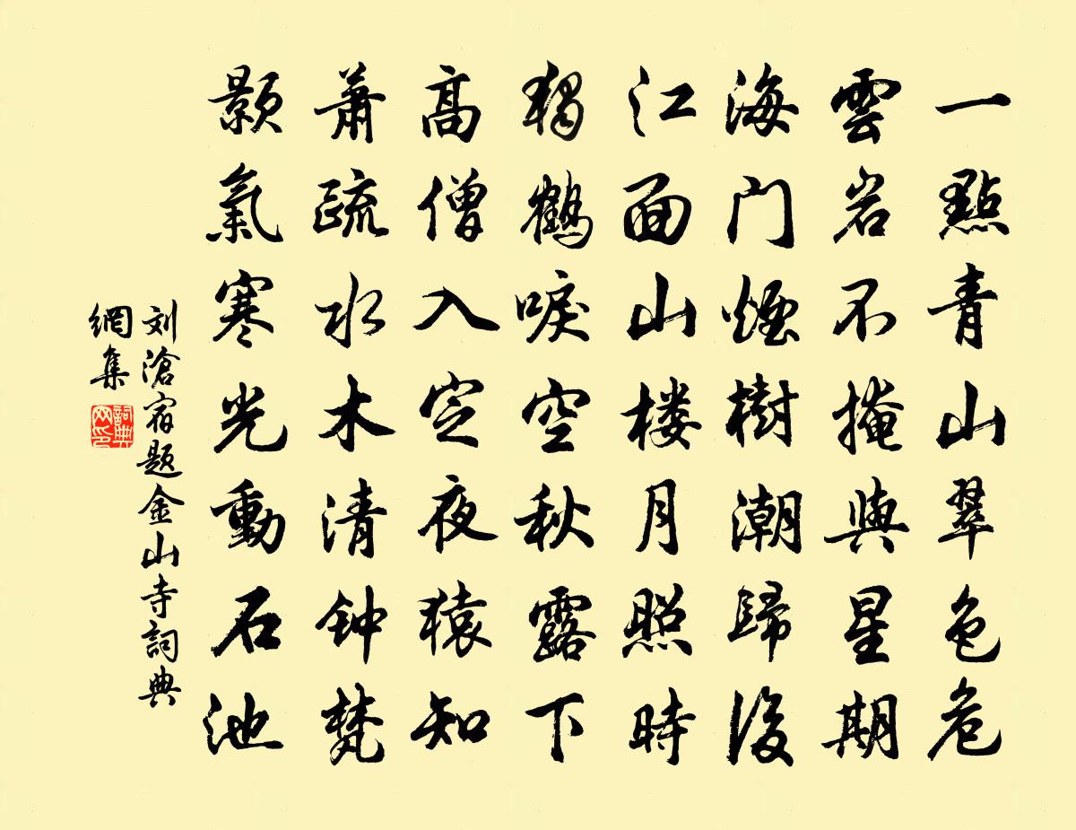 詩詞名句歷史字典書法欣賞書法字典國語詞典說文解字康熙字典古漢語字典標 題 作 者 詩 句 宿題金山寺作者:劉滄 朝代:唐代宿題金山寺原文一點青山翠色危,雲岩不掩與星期。海門煙樹潮歸後,江面山樓月照時。獨鶴唳空秋露下,高僧入定夜猿知。蕭疏水木清鍾梵,顥氣寒光動石池。詩詞問答問:宿題金山寺的作者是誰?答:劉滄問:宿題金山寺寫於哪個朝代?答:唐代問:宿題金山寺是什麼體裁?答:七律劉滄宿題金山寺書法欣賞宿題金山寺書法作品注釋全唐詩:卷586-70詩詞推薦嵩山十志十首。雲錦淙盧鴻一〔唐代〕雲錦淙者,蓋激溜沖攢,傾石叢倚,鳴湍疊濯,噴若雷風,詭輝分麗,煥若雲錦。可以瑩發靈矚,幽玩忘歸。及匪端午帖子太上皇后閣周必大〔宋代〕揮筆將如解慍何,層冰列鑒謾峨峨。要知心地清無暑,端為全鍾四氣和。同從兄季弟游香山追和東坡端午游諸寺韻喻良能〔宋代〕前車惟伯氏,後乘載阿連。相攜青蓮界,共開白社筵。黃梅雨初歇,紅榴花正妍,淨境聊莞爾,妙興真悠然。偈言五貺詩太湖硯皮日休〔唐代〕求於花石間,怪狀乃天然。中瑩五寸劍,外差千疊蓮。月融還似洗,雲濕便堪研。寄與先生後,應添內外篇。山暝孤猿吟張耒〔宋代〕平野何岑寂,空山晚易陰。微雲數峰暝,幽谷一猿吟。風果飢遇少,霜枝冷不禁。引吭當落日,激響度前林。最惻首春同枌友攜樽過野渡訪梅即席衛宗武〔宋代〕訪梅尋友款幽居,俄見棲鴉已畢逋。霽日幸同終日笑,春花有似此花無。銜杯林下嫌來晚,索句檐前只恐晡。菲作過吳淞江毛滂〔宋代〕參軍身外只圖書,獨與吳江分不疏。歸去他年當辟穀,嬾隨波浪覓鱸魚。句施元長〔宋代〕我觀招提境,古檜何蒼奇。白蟻巢其根,青虬齧其枝。和范公授胡宏〔宋代〕貧病離居莫厭侵,滿床黃卷靜披尋。情通不礙天機妙,行到方知學海深。宇宙一身雖小小,乾坤萬象總森森。分明空城雀陳陶〔唐代〕古城蒙蒙花覆水,昔日住人今住鬼。野雀荒台遺子孫,千年飲啄枯桑根。不隨海燕柏梁去,應無玉環銜報恩。近村天台道中高似孫〔宋代〕落花入溪口,山山皆可佳。橫矼碧水急,後峰白雲霾。野藥綴殷子,危松換新釵。魚輕爭湊石,蘭瘦深依涯。此處閿鄉寓居十首釣竿吳融〔唐代〕曾拋釣渚入秦關,今卻持竿傍碧灘。認得舊溪兼舊意,恰如羊祜識金環。武擔山孫應時〔宋代〕小飲不成醉,清談多所欣。秋聲搖落日,野色亂寒雲。心事長千載,腰圍更幾分。西風叢桂發,倚檻得相聞。閒房釋文珦〔宋代〕閒房近竺岑,四面是清陰。涉物皆成趣,無因廢得吟。蛇蟠枯樹腹,雀乳古亭心。倘或遊人見,猶疑隱欠深。鷓鴣引 韓氏別墅王惲〔元代〕竹映方台翠滿湖。煙霏荷露淨郊居。棣花輝映春風被,雲錦香翻碧玉壺。吟倚杖,臥看書。一家風景輞川圖。酒杯送天台李明府貫一歸越林表民〔宋代〕赤城譚舊令,為政且鳴琴。澗瀑知清操,山雲識苦吟。自甘微賤拙,誰信勒碑深。歸路春風近,煙花繞禁林。三清閣吳愈〔宋代〕廬山之勝,秀出斗旁。參于衡岳,鎮東南方。民人所瞻,神天攸宅。齎夢之祥,乃興自昔。惟天聰明,矜此下民。次韻王尉贈別方岳〔宋代〕十載春泥濺客衣,江湖半已入吾詩。事今豈得文章力,心亦難求世俗知。山意向人如有語,鷗盟於我合歸誰。月明小重山陳成之〔宋代〕恨入眉尖熨不開。日高猶未肯,傍妝檯。玉郎嘶騎不歸來。梁間燕,猶自及時回。粉淚污香腮。纖腰成瘦損,有人圓池顧逢〔宋代〕一片水環璧,分明鏡可窺。游魚吹白沫,浴鷺撲清漪。有月有星夜,無雲無雨時。倚欄相對處,如看渾天儀。名句推薦日長籬落無人過,惟有蜻蜓蛺蝶飛。范成大《四時田園雜興·其二》 年年雪裡。常插梅花醉。李清照《清平樂·年年雪裡》 清風徐來,水波不興。蘇軾《前赤壁賦》 齊唱憲王春樂府,金梁橋外月如霜。李夢陽《汴京元夕》 昔在零陵厭,神器若無依。何遜《行經孫氏陵》 霜風漸欲作重陽,熠熠溪邊野菊香。蘇軾《捕蝗至浮雲嶺山行疲苶有懷子由弟二首·其二》 書劍時將晚,丘園日已暮。孟浩然《田園作》 一味學吃虧,是處事良方。王永彬《圍爐夜話·第五四則》 仁則榮,不仁則辱。孟子《孟子·公孫丑章句上·第四節》 其交也以道,其接也以禮孟子《孟子·萬章章句下·第四節》