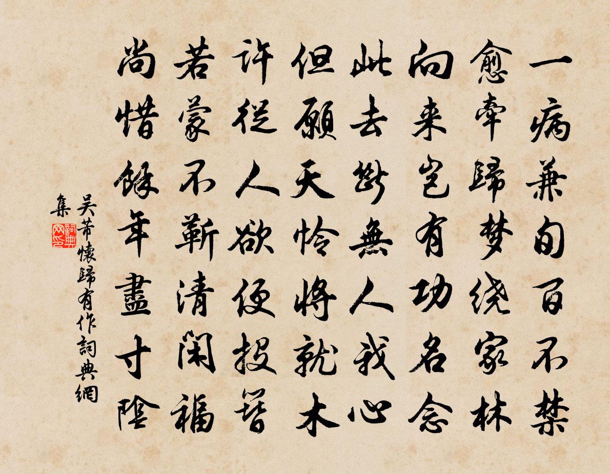 詩詞名句歷史字典書法欣賞書法字典國語詞典說文解字康熙字典古漢語字典標 題 作 者 詩 句 懷歸有作作者:吳芾 朝代:宋代懷歸有作原文一病兼旬百不禁,愈牽歸夢繞家林。向來豈有功名念,此去斷無人我心。但願天憐將就木,許從人慾便投簪。若蒙不靳清閒福,尚惜餘年盡寸陰。詩詞問答問:懷歸有作的作者是誰?答:吳芾問:懷歸有作寫於哪個朝代?答:宋代吳芾懷歸有作書法欣賞懷歸有作書法作品詩詞推薦看鏡艾性夫〔宋代〕自摩寒鏡看頭顱,短髮蕭蕭不受梳。天地風霜吾輩老,江湖煙雨故人疏。道窮分命真如紙,世亂功名不要書。縱有和令狐舍人酬峰上人題山欄孤竹楊巨源〔唐代〕滿院冰姿粉籜殘,一莖青翠近簾端。離叢自欲親香火,抱節何妨共歲寒。能讓繁聲任真籟,解將孤影對芳蘭。范雲游山西村陸游〔宋代〕莫笑農家臘酒渾,豐年留客足雞豚。山重水複疑無路,柳暗花明又一村。簫鼓追隨春社近,衣冠簡樸古風存。從今永叔寄詩八首並祭子漸文一首因采八詩之意警梅堯臣〔宋代〕昔聞退之與東野,相與結交賤微時。孟不改貧韓漸貴,二人情契都不移。韓無驕矜孟無靦,直以道義為己知。我今許提乾湖上下築戴復古〔宋代〕才氣有如許,功名不可無。樂從閒歲月,養就大規模。雅志難諧俗,幽居喜並湖。君看蓮下藕,不與葉同枯。斷橋春望王鎡〔宋代〕拾翠車閒輦路塵,山南山北杜鵑春。誰家庭院東風裡,飛出桃花不見人。書窗劉克莊〔宋代〕跳丸屋角去如馳,蠹簡窗間卷復披。元老豈無揮玉麈,大儒曾有奮金樵。釣牽鰲極靈根動,斧入牛山傑木衰。白首何山張蘊〔宋代〕山因人得姓,人去佛來居。鄰有天章墓,碑無玉局書。幽蹊通古郭,荒磵入春畲。客子吟須冷,高峰夕照余。衢州別李秀才方乾〔唐代〕千山紅樹萬山雲,把酒相看日又曛。一曲驪歌兩行淚,更知何處再逢君。拄笏亭晚望范成大〔宋代〕林泉隨處有清涼,山繞闌乾客自忙。溪雨不飛虹尚飲,亂蟬高柳滿斜陽。瑞岩眾行者請贊釋妙倫〔宋代〕米里有蟲,麥里有曲。非是老盧,何曾覷見。見不見,八角磨盤空里轉。次韻鄭介夫二首蘇軾〔宋代〕一生憂患萃殘年,心似驚蠶未易眠。海上偶來期汗漫,葦間猶得見延緣。良醫自要經三折,老將何妨敗兩甄。收取三章黃庭堅〔宋代〕湯湯流水,可以休兮。嗟行之人,則濯足兮。再次韻四首黃庭堅〔宋代〕延和西路古槐陰,不隔朝宗夙夜心。公有胸中五色線,平生補袞用功深。對雪六首強至〔宋代〕幾尺江東雪,同時戶北風。全家愁坐外,寄命苦吟中。已分書帷冷,偏憎酒盞空。漫將豐歲兆,去問白頭翁。聞蛩林景熙〔宋代〕悽苦難成調,秋風入細弦。草根語深夜,燈下感流年。落葉已滿徑,征人猶在邊。寒衣何日寄,思婦不成眠。和張倅湖上十絕姜特立〔宋代〕群彥俱堪議相氈,小詩聊爾出穠纖。梅山老子何多幸,收得連珠歸玉奩。自洪府舟行直書其事宋之問〔唐代〕仲春辭國門,畏途橫萬里。越淮乘楚嶂,造江泛吳汜。嚴程無休隙,日夜涉風水。昔聞垂堂言,將誡千金子。問余浪淘沙魏了翁〔宋代〕鶴外倚樓看。雲颭晴天。天高雞犬礙雲關。掉臂雙仙留不徹,還任人間。客佩振珊珊。來賀平安。年年直待卷燈還送黃生還臨安王銍〔宋代〕舊事恍如前後身,龍門四紀更情親。茅廬驚嘆見斯客,天馬超騰感似人。三逕草荒殘歲雨,一枝梅作渡江春。莫言名句推薦全一人者德之輕,拯天下者功之重房玄齡《晉書·帝紀·第三章》 拔一毛而利天下,不為也。孟子《孟子·盡心章句上·第二十六節》 想得玉人情,也合思量我。孫光憲《生查子·窗雨阻佳期》 日月盈昃,辰宿列張。周興嗣《千字文·全文》 事雖小,勿擅為。苟擅為,子道虧。李毓秀《弟子規·入則孝》 春日游,杏花吹滿頭。韋莊《思帝鄉·春日游》 楊柳乍如絲,故園春盡時。納蘭性德《菩薩蠻·問君何事輕離別》 王濬樓船下益州,金陵王氣黯然收。劉禹錫《西塞山懷古》 北客翩然,壯心偏感,年華將暮。朱敦儒《水龍吟·放船千里凌波去》 少婦今春意,良人昨夜情。沈佺期《雜詩三首·其三》