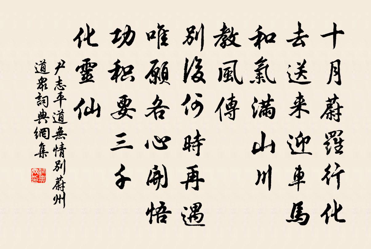 詩詞名句歷史字典書法欣賞書法字典國語詞典說文解字康熙字典古漢語字典標 題 作 者 詩 句 道無情 別蔚州道眾作者:尹志平 朝代:元代道無情 別蔚州道眾原文十月蔚羅行化。去送來迎車馬。和氣滿山川。教風傳。別後何時再遇。唯願各心開悟。功積要三千。化靈仙。詩詞問答問:道無情 別蔚州道眾的作者是誰?答:尹志平問:道無情 別蔚州道眾寫於哪個朝代?答:元代問:道無情 別蔚州道眾是什麼體裁?答:詞尹志平道無情 別蔚州道眾書法欣賞道無情 別蔚州道眾書法作品詩詞推薦和景純栽松韓維〔宋代〕芳根出澗底,秀木依牆東。莫顧一時好,當觀三世空。送外門朱秀才見訪都下卻歸安陸舊隱宋庠〔宋代〕白髮游梁晚,青山念楚歸。魂銷雖得別,戰勝卻成肥。障日都門蓋,迎煙磵路衣。試尋南圃樹,今長几多園。題鄭防畫夾五首黃庭堅〔宋代〕能作山川遠勢,白頭惟有郭熙。卻寫李成驟雨,惜無六幅鵝溪。浣溪沙方千里〔宋代〕面面虛堂水照空。天然一朵玉芙蓉。千嬌百媚語惺憁。未散嬌雲輕鬢,欲融輕雪乍凝胸。石榴裙衩為誰紅。時敘火後,意不釋然,作詩解之范成大〔宋代〕潘郎曉衾夢蘧蘧,舞馬竟與融風俱。前驅炎官後熱屬,席捲不貸淵明廬。君家十年四立壁,震風凌雨啼妻孥。平生南湖賦冬青花四首張鎡〔宋代〕酷烈深憐格外香,樹邊苔氣與蒼涼。莫教糝徑渾如雪,快向青陰置竹床。寄清新二禪師頌黃庭堅〔宋代〕石公來斲鼻端塵,無手人來斧鑿親。白牯狸奴心即佛,銅睛虎眼主中賓。自攜瓶去沽村酒,幻者衫來作主人。萬里郴州張舜民〔宋代〕橘井蘇仙宅,茶經陸羽泉。萬峰團雉堞,二水匯城輭。浣溪沙(餞別陳漢卿於張叔信後堂,席上用叔信韻)管鑒〔宋代〕金殿晨趨玉佩蒼。君才久合侍龍章。花磚學士紫薇郎。小試一麾行促詔,暫留千騎且飛觴。夜堂歌暖借春光。韓尚書南澗公之從弟德文為東廣常平上幕丙寅曾豐〔宋代〕山鄉仍水國,玉露更金風。置印龜{左冉右龜}上,揚鞭馬首東。勤渠蓮幕客,款曲繡衣翁。言我坐詩累,至今依趙再可以通一所作梅雀求題章甫〔宋代〕老去詩情在,逢春只欲狂。飛來枝上雀,似亦愛幽香。城南蔣莊四首李長民〔宋代〕今旦商飈起,蕭然雲氣秋。稚蛩工促織。老蔓擬牽牛。莫賦潘安閣,聊登王粲樓。家園歸未得,孤夢繞松楸。侯革以詩風示次韻晁公溯〔宋代〕少陵有幽事,止共阮生論。把酒與賢樂,為邦漸主恩。欻傾賓客坐,知出聘君門。勝識中郎面,區區對虎賁。小詩遺人謁邑令曹勛〔宋代〕林生牢落嘆萍蓬,詞采飄飄甑屢空。聞道河陽花滿縣,欲從大手借春風。偈六十三首釋道寧〔宋代〕未透祖師關,時光如箭急。白髮皓然生,新年又五日。喜長新王益柔〔宋代〕秋雲朔吹曉徘徊。雪照樓台。梁王宴召有鄒枚。相如獨逞雄才。明燭薰爐香暖,深勸金杯。庭前粉艷有寒梅。一枝偈頌一百五十首釋心月〔宋代〕未見此老人已前,上是天下是地。既是此老人之後,山是山水是水。一別五十年,恩怨通身是。沒量大人,抬腳不步虛詞五首徐鉉〔唐代〕天帝黃金闕,真人紫歸書。霓裳紛蔽景,羽服迥臨虛。白鶴能為使,班麟解駕車。靈符終願借,轉共世情疏,龍池禱雨虞儔〔宋代〕御府金奩出寶薰,爇來池上定知聞。龍應覆手能為雨,岫豈無心漫出雲。秧插高田猶未遍,泉流幽澗恐難分。奉常頌古一百二十一首釋宗杲〔宋代〕日是禍門,電激雷奔。娑竭出海,震動乾坤。名句推薦聖人之為國也,觀俗立法則治,察國事本則宜。商鞅《商君書·算地》 為山九仞,功虧一簣。佚名《尚書·周書·旅獒》 復值接輿醉,狂歌五柳前。王維《輞川閒居贈裴秀才迪》 知君仙骨無寒暑。蘇軾《木蘭花令·次馬中玉韻》 寶奩明月不欺人,明日歸來君試看。嚴仁《玉樓春·春思》 記得別伊時,桃花柳萬絲。納蘭性德《菩薩蠻·新寒中酒敲窗雨》 對菊難逢元亮酒,登樓愧乏仲宣才。秋瑾《九日感賦》 三冬暫就儒生學,千耦還從父老耕。陸游《觀村童戲溪上》 旋開旋落旋成空,白髮多情人更惜。司空圖《酒泉子·買得杏花》 百年成之不足,一旦壞之有餘。佚名《增廣賢文·上集》