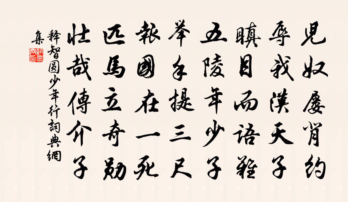 詩詞名句歷史字典書法欣賞書法字典國語詞典說文解字康熙字典古漢語字典標 題 作 者 詩 句 少年行作者:釋智圓 朝代:宋代少年行原文兒奴屢背約,辱我漢天子。瞋目而語難,五陵年少子。舉手提三尺,報國在一死。匹馬立奇勳,壯哉傳介子。詩詞問答問:少年行的作者是誰?答:釋智圓問:少年行寫於哪個朝代?答:宋代釋智圓少年行書法欣賞少年行書法作品詩詞推薦和崔珙望子嶺觀梅李復〔宋代〕高枝疏淡小花頭,開向殘春破客愁。點墨空山尉寒晚,卻如何遜在揚州。頌古一百則釋正覺〔宋代〕不入世,未循緣,劫壺空處有家傳。白苹風細秋江暮,古岸船歸一帶煙。春風張鎡〔宋代〕春風日日過東牆,睡起人閒蝶自忙。吹盡玫瑰能底惜,只緣銷去一年香。登樓杜甫〔唐代〕花近高樓傷客心,萬方多難此登臨。錦江春色來天地,玉壘浮雲變古今。北極朝廷終不改,西山寇盜莫相侵。可憐端午帖子詞蘇軾〔宋代〕西檻新來玉宇風,侍臣茗碗得雍容。庭槐似識天顏喜,舞破清陰作兩龍。寄沈迂叟胡仲弓〔宋代〕雁飛不到瘴江邊,別去而今又一年。放下客愁非為酒,抬高詩價莫論錢。從來富貴皆尤物,休把行藏問老天。世味畫堂春(上老母壽)張孝祥〔宋代〕蟠桃一熟九千年。仙家春色無邊。書堂日暖卷非煙。晝永風妍。看取蔬封湯沐,何妨頻棹觥船。方瞳綠髮對儒仙。奉和春日出苑矚目應令賈曾〔唐代〕銅龍曉辟問安回,金輅春遊博望開。渭北晴光搖草樹,終南佳氣入樓台。招賢已得商山老,托乘還征鄴下才。臣在佳人停板圖唐寅〔明代〕仙娥記曲世無雙,下直歸來日滿窗。隨手托牙鏤板在,低頭不語暗尋腔。席上贈劉夢得牛僧孺〔唐代〕粉署為郎四十春,今來名輩更無人。休論世上升沉事,且斗樽前見在身。珠玉會應成咳唾,山川猶覺露精神。莫嫌大晟府擬撰釋奠十四首佚名〔宋代〕大哉聖王,實王生德。作樂以崇,時祀無矣。清酤惟聲,嘉牲孔碩。薦羞神明,庶幾昭格。朝中措佚名〔宋代〕郎星初度一旬前。瑞雪早蹁躚。金節耆祥稱壽,一妃宣勸迎年。錦天繡地,薰香手禱,福祿如川。只恐催呈魏笏,好事近·秋曉上蓮峰陸游〔宋代〕秋曉上蓮峰,高躡倚天青壁。誰與放翁為伴,有天壇輕策。鏗然忽變赤龍飛,雷雨四山黑。談笑做成豐歲,笑禪龕和鄒思道寄詠西湖熊瑞〔宋代〕畫橋楊柳不勝愁,萬縷千條俛碧流。問著翠華霜日事,人人只道好杭州。雨晴小步陳必復〔宋代〕蠶月家家靜,村流處處深。草分兩岸色,竹覆半池陰。少飲亦微醉,獨行還自吟。兒童怪相問,爭識野夫心。觀邸報張自明〔宋代〕西風颯颯雨瀟瀟,小小人家短短橋。獨倚闌乾數鵝匹,一聲孤雁在雲霄。擬行路難鮑照〔南北朝〕洛陽名工鑄為金博山,千斫復萬鏤,上刻秦女攜手仙。承君清夜之歡娛,列置幃里明燭前。外發龍鱗之丹彩,內含出永豐縣西石橋上聞子規二首楊萬里〔宋代〕怨笛哀箏總不如,一聲聲徹九天虛。若逢雨夜如何聽,幸得花時莫管渠。山中春思獨孤及〔唐代〕獺祭川水大,人家春日長。獨謠晝不暮,搔首慚年芳。靡草知節換,含葩向新陽。不嫌三徑深,為我生池塘。亭午重憶一首李白〔唐代〕欲向江東去,定將誰舉杯。稽山無賀老,卻棹酒船回。名句推薦一叫一迴腸一斷,三春三月憶三巴。李白《宣城見杜鵑花 / 子規》 野客預知農事好,三冬瑞雪未全消。戴復古《除夜》 不見又思量,見了還依舊。李之儀《謝池春·殘寒銷盡》 朔風如解意,容易莫摧殘。崔道融《梅花》 冰肌玉骨,自清涼無汗。蘇軾《洞仙歌·冰肌玉骨》 山一程,水一程,身向榆關那畔行,夜深千帳燈。納蘭性德《長相思·山一程》 天意眷我中興,吾皇神武,踵曾孫周發。黃中輔《念奴嬌·炎精中否》 讀書破萬卷,下筆如有神。杜甫《奉贈韋左丞丈二十二韻》 不登高山,不知天之高也;不臨深溪,不知地之厚也荀子《荀子·勸學》 幾度思歸還把酒,拂雲堆上祝明妃。杜牧《題木蘭廟》