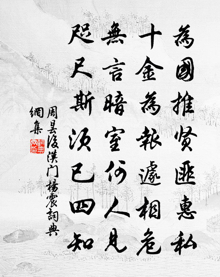 詩詞名句歷史字典書法欣賞書法字典國語詞典說文解字康熙字典古漢語字典標 題 作 者 詩 句 後漢門楊震作者:周曇 朝代:唐代後漢門楊震原文為國推賢匪惠私,十金為報遽相危。無言暗室何人見,咫尺斯須已四知。詩詞問答問:後漢門楊震的作者是誰?答:周曇問:後漢門楊震寫於哪個朝代?答:唐代周曇後漢門楊震書法欣賞後漢門楊震書法作品注釋全唐詩:卷729-33詩詞推薦送彥與孫兄赴廷對劉宰〔宋代〕捷書夜到古朱方,之子登名甲乙行。偉行向來高月旦,遺經端合破天荒。公孫對策風雲會,董子留名日月光。趨向聽范玄長吟施肩吾〔唐代〕聲聲扣出碧琅玕,能使秋猿欲叫難。詩興未窮心更遠,手垂青拂向雲看。伏翼西洞送夏方慶陳羽〔唐代〕洞裡春晴花正開,看花出洞幾時回。殷勤好去武陵客,莫引世人相逐來。緣識宋太宗〔宋代〕群生宗法界,秘密十方尊。大教緣心識,周通一念存。冬日宴郭監林亭盧綸〔唐代〕玉勒聚如雲,森森鸞鶴群。據梧花罽接,沃盥石泉分。華味慚初識,新聲喜盡聞。此山招老賤,敢不謝夫君。八月二十日與館中同舍游西湖作葛立方〔宋代〕跨馬綠楊堤,左右臨無地。鞭影墮清泚,烏帽入花翠。老龍拿半空,九里作青吹。聞聲類擊竹,心與景相值。許由眉州作陸游〔宋代〕扁舟久不泛蟆津,常恐黃塵解污人。爛醉破除千日懣,狂吟判斷四州春。汀洲漸嘆苹花老,風露初嘗荔子新。便欲寧鄉有感與仁仲彥達同行胡寅〔宋代〕太和薰宇宙,王旅不親征。雁北同兄弟,鶯遷得友生。正便春入望,莫厭雨稽程。何限山花發,遙看為擬名。月夜有懷二宋兄廖行之〔宋代〕雲容冉冉碧於衫,蟾影騰騰穩勝驂。萬壑涼聲生木末,一天秋色滿江南。聞雞漫起狂夫舞,捫虱誰從隱士談。坐想南園荔子熟名曰魏紫蓋是陳家紫種以先公賜封陳宓〔宋代〕先世栽來四十年,南園魏紫始名傳。丁香乍翠蘭芬烈,龍腦初開玉色鮮。可踵蔡家名翰苑,誰夸烏石擅山前。追思和李校書新題樂府十二首上陽白髮人元稹〔唐代〕天寶年中花鳥使,撩花狎鳥含春思。滿懷墨詔求嬪御,走上高樓半酣醉。醉酣直入卿士家,閨闈不得偷迴避,良人過陰陵張祜〔唐代〕壯士悽惶到山下,行人惆悵上山頭。生前此路已迷失,寂寞孤魂何處游。偈頌一百零一首釋慧性〔宋代〕不知立處高多少,回頭四顧白雲低。等閒移步毗顱頂,拽轉南辰安向西。淮南送李司空朝覲羅隱〔唐代〕聖君宵旰望時雍,丹詔西來雨露濃。宣父道高休嘆鳳,武侯才大本吟龍。九州似鼎終須負,萬物為銅只待熔。臘後木犀花開折贈縣宰代簡虞儔〔宋代〕緗黃襞積間琉璃,病眼看花喜欲迷。半樹斕斑藏霧豹,一秋清絕辟塵犀。誰分仙種來蟾窟,知有生香洗麝臍。天女三吊吟四首方回〔宋代〕偶聞一人死,惻怛吁以驚。千人萬人死,能不愴厥情。長平幾性命,銳頭付一坑。亡者抱永痛,勝喜功名成。功名寄河東按察待制施正臣宋祁〔宋代〕並門迢遞駕朱輪,紫橐宮毫晦隙塵。幾眼帶移貪事國,半生桐老苦傷春。比來置酒觴何屬,自此驚秋發恐新。鰲署送林師道似之赴寧都尉二首王邁〔宋代〕及物官無小,平生志所存。一條冰出壑,五色棒懸門。皂蓋邦魁彥,繡衣鄉達尊。儻能念寒畯,梅市得春溫。送周府尹三首方回〔宋代〕詩家周賀與方乾,三載同吟七里灘。晚節我惟甘豹隱,妙年公合快鵬摶。昔叨舊尹迎新尹,今愧前官送後官。朔野答故人白居易〔唐代〕故人對酒嘆,嘆我在天涯。見我昔榮遇,念我今磋跎。問我為司馬,官意復如何?答雲且勿嘆,聽我為君歌。我本名句推薦可堪更近乾龍節,眼中淚盡空啼血向子諲《秦樓月·芳菲歇》 枕上潛垂淚,花間暗斷腸。魚玄機《贈鄰女 / 寄李億員外》 算翠屏應是,兩眉餘恨倚黃昏。孔夷《南浦·旅懷》 人珍我棄、人棄我取沈復《浮生六記·浪遊記快》 故山知好在,孤客自悲涼。蘇軾《臨江仙·送王緘》 少婦今春意,良人昨夜情。沈佺期《雜詩三首·其三》 雖慚老圃秋容淡,且看黃花晚節香。韓琦《九日水閣》 最喜小兒亡賴,溪頭臥剝蓮蓬。辛棄疾《清平樂·村居》 桃花一簇開無主,可愛深紅愛淺紅?杜甫《江畔獨步尋花·其五》 鳥宿池邊樹,僧敲月下門。賈島《題李凝幽居》