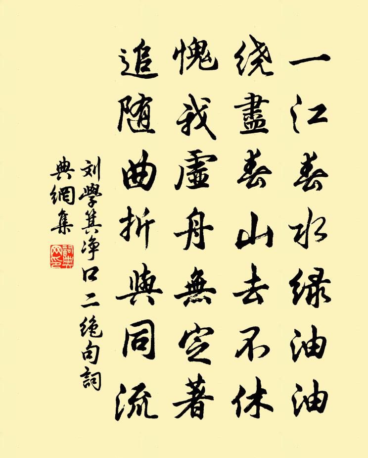 詩詞名句歷史字典書法欣賞書法字典國語詞典說文解字康熙字典古漢語字典標 題 作 者 詩 句 淨口二絕句作者:劉學箕 朝代:宋代淨口二絕句原文一江春水綠油油,繞盡春山去不休。愧我虛舟無定著,追隨曲折與同流。詩詞問答問:淨口二絕句的作者是誰?答:劉學箕問:淨口二絕句寫於哪個朝代?答:宋代劉學箕淨口二絕句書法欣賞淨口二絕句書法作品詩詞推薦還丹可成詩聯句皎然〔唐代〕羽化自仙骨,延年資養生。 ——皎然金經啟靈秘,玉液流至精。 ——潘述八石思共煉,九丹知可成。 ——湯滿庭芳魯訔〔宋代〕坐嘯蓬宮,移旌天府,往來三島十洲。況瑞靄當年,初下瓊樓。自是長生伴侶,那堪更河潤神州。人爭嘆,威名福游慈雲分韻得是字陳著〔宋代〕僧關可人心,況此晴色美。蹈蘚滑路多,訪菊香處是。引飲吞山光,清嘯落松子。我有即事詩,就掃石壁紀。金剛隨機無盡頌知見不生分第三十一釋印肅〔宋代〕真見實不見,當台鏡中面。元是本來人,不著求方便。省墓葉茵〔宋代〕隴上松杉手自移,至今苔蘚半寒枝。夢中不記重泉隔,猶學兒童戲采時。余自白陽馳謁宜都周夢得長宮飲於清江亭愛其陳襄〔宋代〕丹山西去水東流,亭在山南隔蓼州。船系白楊歸不得,清江如畫主人留。送孟湘虞部赴闕祖無擇〔宋代〕科名拾芥職三虞,落落雄才與眾殊。為政人驚今遂霸,論兵自比古孫吳。倚廬已見因心著,結綬還陪辯色趨。不似臨江仙王哲〔元代〕白簡書金訣*,他名姓亡魂。驚神駭各思存。蒙追薦,你受生門。戶別開玄妙,做人同和天尊。光一點永無昏。輝夜月趙蕃〔宋代〕曉枕厭蠅聲,昏蟬復亂鳴。耳根喧自合,心地寂常生。習氣存詩句,平生愛月明。鍾情在我輩,安得到無情。七交七首河南府張推官歐陽修〔宋代〕堯夫大雅哲,稟德實溫粹。霜笉秀含潤,玉海湛無際。平明坐大府,官事盈案幾。高談遣放紛,外物不能累。非惟題雲海亭王諶〔宋代〕二十年前曾到此,重來又是晚春時。蘆因水長全然短,山被雲遮分外奇。漁艇添成古圖畫,雁行點破碧瑠璃。布衣集工部句題暖谷杜汪〔宋代〕作尉窮谷僻,官高何足論。溫溫有風味,憶昔李公存。荊州即事藥名詩八首黃庭堅〔宋代〕垂空青幕六,一一排風開。石友常思我,預知子能來。聽箏李端〔唐代〕鳴箏金粟柱,素手玉房前。欲得周郎顧,時時誤拂弦。何山張蘊〔宋代〕山因人得姓,人去佛來居。鄰有天章墓,碑無玉局書。幽蹊通古郭,荒磵入春畲。客子吟須冷,高峰夕照余。能仁院前有石像丈余蓋作大像時樣也陸游〔宋代〕江閣欲開千尺像,雲龕先定此規模。斜陽徙倚空三嘆,嘗試成功自古無。有懷介然偶作因記之吳則禮〔宋代〕介然平生三隻襪,意行跛跛復挈挈。上懶把椎拂拿卻,過淮來昔伴僧伽。龜堂獨坐遣悶陸游〔宋代〕發已凋疏齒已搖,高談誰與慰無聊?苦心雖嘔何由出,病骨非讒亦自銷。玉雪細塵烹瑞草,煙脂小把斸靈苗。賀公三次韻寄戴祖禹戴表元〔宋代〕同分剡溪派,自喜小王書。野服調驍馬,濃香薰蠹魚。歲時趨闕里,早晚上公車。與我真兄弟,風流但不如。偈頌一百二十三首釋崇岳〔宋代〕五祖老人好語,只為探頭太過。香山有個方便,也要諸人共知。透得金剛圈,細嚼鐵餕餡。一飽忘百飢,始信不相名句推薦絳雪生涼,碧霞籠夜,小立中庭蕪地。吳文英《拜星月慢·林鐘羽姜石帚以盆蓮數十置中庭宴客其中》 洛陽親友如相問,一片冰心在玉壺。王昌齡《芙蓉樓送辛漸》 泥上偶然留指爪,鴻飛那復計東西。蘇軾《和子由澠池懷舊》 離別家鄉歲月多,近來人事半消磨。賀知章《回鄉偶書二首》 聖人恃道化而不恃智巧。列子及其弟子《列子·說符》 誰知江上酒,還與故人傾。周紫芝《臨江仙·送光州曾使君》 狎浪兒童,橫江士女,笑指漁翁一葉輕。吳偉業《沁園春·觀潮》 杯酒相延,今夕不應慳。陳著《江城子·中秋早雨晚晴》 雲中亂拍祿山舞,風過重巒下笑聲。杜牧《過華清宮絕句三首》 當家才知鹽米貴,養子方知父母恩。佚名《增廣賢文·上集》
