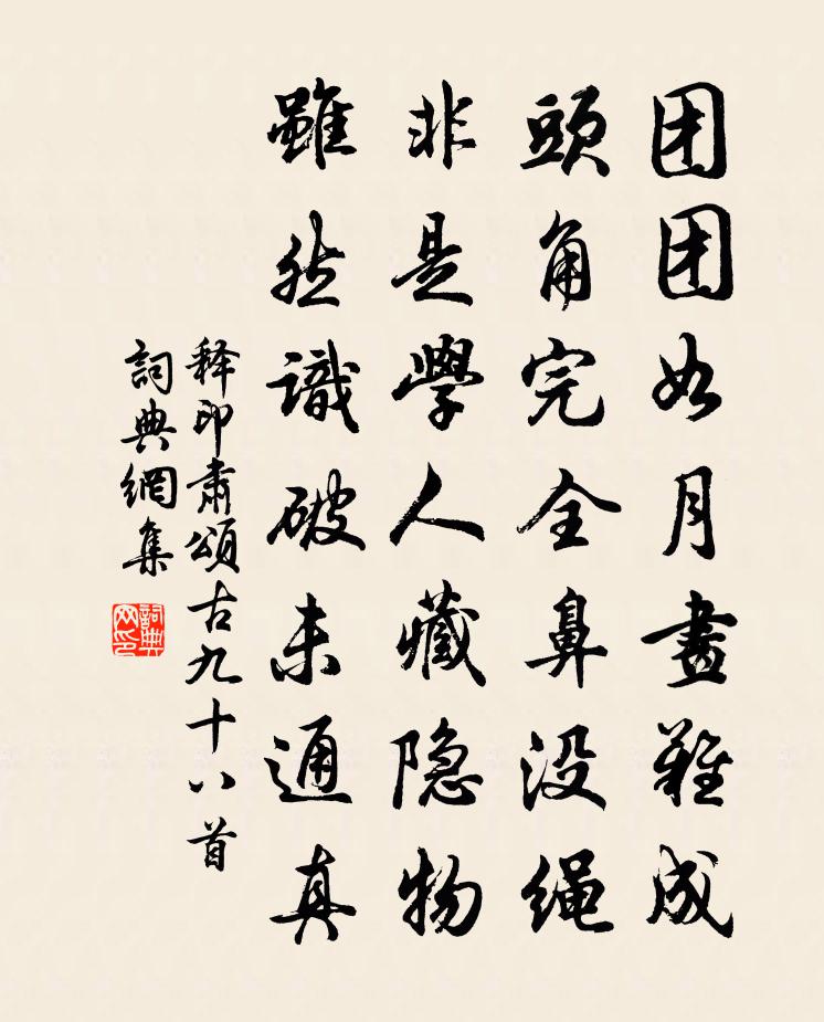 詩詞名句歷史字典書法欣賞書法字典國語詞典說文解字康熙字典古漢語字典標 題 作 者 詩 句 頌古九十八首作者:釋印肅 朝代:宋代頌古九十八首原文團團如月畫難成,頭角完全鼻沒繩。非是學人藏隱物,雖然識破未通真。詩詞問答問:頌古九十八首的作者是誰?答:釋印肅問:頌古九十八首寫於哪個朝代?答:宋代釋印肅頌古九十八首書法欣賞頌古九十八首書法作品詩詞推薦送瞿生還拜親晏殊〔宋代〕門標楊氏闕,家有漢皇書。射策淹前志,鳴榔省舊居。仙山人罕到,幽境畫難如。雲竇開賓館,芝田足歲儲。修詞遊仙二首秦觀〔宋代〕雲車自天來,駕言游混茫。手持太一節,身佩使者章。龍處傍夭矯,馬龜伏以翔。朝元紫微上,所睹浩難量。實網寄潤州龐籍范仲淹〔宋代〕北固高樓海氣寒,使君應此憑欄乾。春山雨後青無限,借與淮南洗眼看。寄司空曙戴叔倫〔唐代〕細雨柴門生遠愁,向來詩句若為酬。林花落處頻中酒,海燕飛時獨倚樓。北郭晚晴山更遠,南塘春盡水爭流。可能道林寺居寄嶽麓禪師二首齊己〔唐代〕門前石路徹中峰,樹影泉聲在半空。尋去未應勞上下,往來殊已倦西東。髭根盡白孤雲並,心跡全忘片月同。長憶芍藥呈韓文章甫〔宋代〕妖氛深蔽洛陽縣,我生不識姚花面。揚州風物舊曾游,佳種年深亦多變。去冬淮上起邊塵,不謂見花當此辰。眼明移飲治城樓方岳〔宋代〕亭皋渺渺葉聲乾,更與西風一倚欄。鸚鵡杯深遺恨在,麒麟冢沒莫煙寒。山如有約欲排闥,詩不中書屢免冠。採菊醉落魄/一斛珠王沂孫〔宋代〕揉碎花心,吟碎淡黃雪。望江南/憶江南王琪〔宋代〕江南雪,輕素剪雲端。瓊樹忽驚春意早,梅花偏覺曉香寒。冷影褫清歡。蟾玉迥,清夜好重看。謝女聯詩衾翠幕,又贈一絕錢惟演〔宋代〕唾露金銷月似霜,雲屏玉簟剩清光。不如誰有高唐夢,翠被華燈徹曙香。和馬粹老四明雜詩聊記里俗耳十首舒坦〔宋代〕巷陌隨橋曲,閭閻占水窮。郡樓孤嶺對,市港兩潮通。春暖雞鳴{上奧下山},秋寒鴨信風。家家人富足,擊壤與留吳田霜崖吳居士宅予仲女許其孫姻方回〔宋代〕眾山環如規,中有一川水。山腴翠樹圓,水潔玉石峙。居人近百家,耕余習文史。此翁獨能詩,早充賓貢士。平生次韻趙達夫問疾方回〔宋代〕煩君遣信問何如,霖雨無人叩陋居。孰信著綿當夏半,自驚伏枕已旬余。百年未辦書傳後,一壑猶欣服返初。處約脫葉項安世〔宋代〕綠陰時節葉急飛,投分青蕪更不疑。橫被蛛絲禁得住,舞風一片獨多時。嚴州道間得順風俗雲七里瀧篙師雲風便才七里趙蕃〔宋代〕桐江多奔湍,牽挽厭勞正。舊雲七里瀧,實乃七十里。篙師為予言,風便輒易爾。回思前日驚,留滯固可喜。溪神泗州東城晚望秦觀〔宋代〕渺渺孤城白水環,舳艫人語夕霏間。林梢一抹青如畫,應是淮流轉處山。偈頌一百零二首釋紹曇〔宋代〕萬戟森嚴細柳營,信威獨許漢將軍。誰知袖隱屠龍手,卻把蒿枝箭策勛。和周繇校書先輩省中寓直林寬〔唐代〕古木重門掩,幽深只欠溪。此中真吏隱,何必更岩棲。名姓鐫幢記,經書逐庫題。字隨飛蠹缺,階與落星齊。伴直憫旱楊萬里〔宋代〕鳴鳩喚雨知喚晴,水車夜啼聲徹明。乖龍嬾睡未渠醒,阿香推熱呼不應。下田半濕高全圻,幼秧欲焦老差碧。書生薄媚(第十攧)董穎〔宋代〕種陳謀,謂吳兵正熾。越勇難施。破吳策,唯妖姬。有傾城妙麗。名稱西子。歲方笄。算夫差惑此。須致顛危。范名句推薦浮天水送無窮樹,帶雨雲埋一半山。辛棄疾《鷓鴣天·送人》 酒盈杯,書滿架,名利不將心掛。李珣《漁歌子·荻花秋》 言極則怒,怒則說者危。呂不韋《呂氏春秋·論·貴直論》 光陰可惜,譬諸逝水。顏之推《顏氏家訓·勉學篇》 玉璫緘札何由達,萬里雲羅一雁飛。李商隱《春雨》 不似春風逞紅艷,鏡前空墜玉人釵。司空圖《華下對菊》 生死有命,富貴在天。佚名《增廣賢文·上集》 去年今日此門中,人面桃花相映紅。崔護《題都城南莊》 明月樓高休獨倚。酒入愁腸,化作相思淚。范仲淹《蘇幕遮·懷舊》 能脫身牢籠外,便是大英雄。王永彬《圍爐夜話·第二八則》