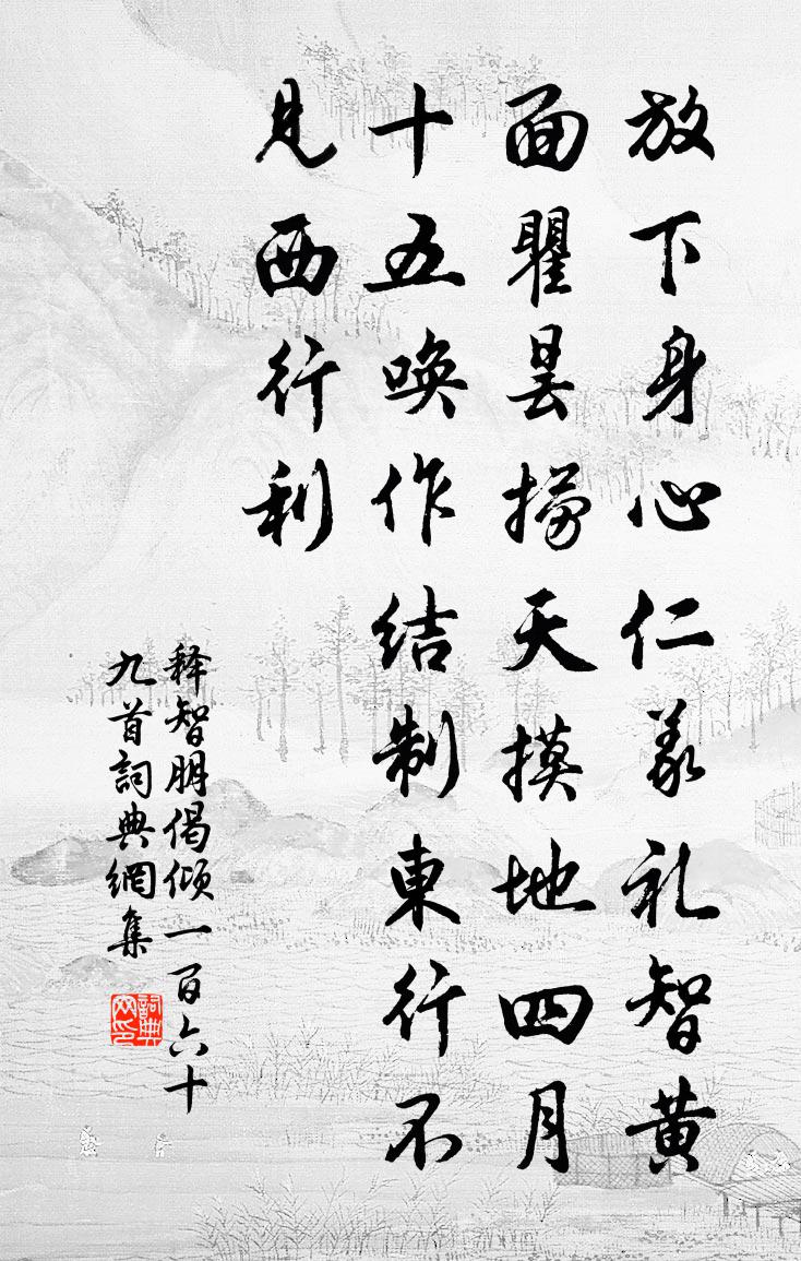 詩詞名句歷史字典書法欣賞書法字典國語詞典說文解字康熙字典古漢語字典標 題 作 者 詩 句 偈傾一百六十九首作者:釋智朋 朝代:宋代偈傾一百六十九首原文放下身心,仁義禮智。黃面瞿曇,撈天摸地。四月十五,喚作結制,東行不見西行利。詩詞問答問:偈傾一百六十九首的作者是誰?答:釋智朋問:偈傾一百六十九首寫於哪個朝代?答:宋代釋智朋偈傾一百六十九首書法欣賞偈傾一百六十九首書法作品詩詞推薦近節楊萬里〔宋代〕節里非無事,忙中自有閒。因風煩白鳥,折簡喚青山。詩卷一兩冊,齋房三四間。興來長得句,卻道在塵寰。同蔣教授單令訪竹里胡寅〔宋代〕遲日芳郊路,寒暄氣已分。共尋茅屋趣,一醉竹光雲。蘊藉潘懷縣,清修鄭廣文。衰遲亦何幸,並得友多聞。舊懸道中二首趙蕃〔宋代〕昨日風既止,今晨風未收。浮波羨幽鳥,喚雨怕鳴鳩。遺寺荒村里,貞祠古渡頭。登高謝能賦,物色漫分留。挽蹇都官李曾伯〔宋代〕風概推諸老,霜台偉壯遊。握蘭宜入從,剖竹乃為州。早為庭闈佚,晚猶鄉國憂。甘棠遺笏在,袞袞有公侯。【黃鐘】人月圓 春夜梁寅〔元代〕三春月勝三秋月,花下惜清陰,錦圍繡陣,香生革履,光動蘭襟。棠梨枝顫,乍驚棲鵲,夜久寒侵。明朝風雨,休卜運算元(二月晦,偕徐孟堅、滕審言、李季功游裴公亭作)郭應祥〔宋代〕城上著裴亭,亭下臨湘水。潑黛揉藍畫不成,暝色仍含紫。忙裡不知春,卻問今餘幾。相與偷將半日閒,共把塵襟和祝汝玉作舉子語之句楊萬里〔宋代〕玉奴何必減花奴,省識春風作畫圖。臨水隔花看走馬,翻身射鴈落雕弧。詞場君擅傾城色,詩社儂凋覓句須。摩壘送蔣德常宰鄱陽樓鑰〔宋代〕棋社頗寥落,聚舍多差參。矧如夫君賢,貴重雙南金。豈可無此君,周旋相與深。一別歸未久,征鞍又駸駸。老我菩薩蠻(次張秉道韻)舒亶〔宋代〕真珠酒滴琵琶送。行雲舊識巫山夢。空得醉中歸。老來心事非。江梅含日暖。照水花枝短。密葉似商量。向人春意汶陽道中文天祥〔宋代〕積雨面不肯霽,面行陸如涉面川。青氈面纊我後,白氈覆我前。我欲正衣冠,兩手如糾纏。飛沫流被面,代我泣涕言懷錢起〔唐代〕夜月霽未好,雲泉堪夢歸。如何建章漏,催著早朝衣。賦張寺丞樗寮釋道璨〔宋代〕樗寮先生千載士,草木有誰同臭味。外無刀斧斫削痕,中有冰霜不老氣。紅紫紛紛滿上林,我自無心趁桃李。蘇秦玄都觀李尊師喻鳧〔唐代〕蘚幘翠髯公,存思古觀空。曉壇檉葉露,晴圃柳花風。壽已將椿並,棋難見局終。何當與高鶴,飛去海光中。伏日偶作王禹偁〔宋代〕移床拖簟就南軒,門掩閒坊半樹蟬。多病形容唯有骨,食貧生計旋無錢。掖垣已忝年深直,朝謁終妨日晏眠。會解述懷於石〔宋代〕孔明臥隆中,世事若不聞。草廬兩三策,大義固已明。陶潛晉處士,束帶恥屈身。浩然歸去來,把酒惟長吟。潛魚過鳳山高氏以榴實薦酒張鎡〔宋代〕灣洄綠處昨雞聲,俯檻山宜柳外明。京洛泓塵衣半黑,邯鄲炊黍夢曾驚。榴皮就為翁題好,竹葉能邀我興成。辦此甲辰季冬殘臘大雪主人以糟玉面狸及尊酒為餉楊冠卿〔宋代〕南山白額虎,暴戾日以滋。納諸罟擭中,食肉寢其皮。文狸外柔順,玉面而豐肌。與世了無忤,奚亦遭危機。得非元夕方岳〔宋代〕莫道山家不掛燈,修身寶月一團冰。清寒照見諸人膽,卻問諸人見未曾。東皋王安石〔宋代〕東皋攬結知新歲,西崦攀翻憶去年。肘上柳生渾不管,眼前花發即欣然。雜感韋莊〔唐代〕莫悲建業荊榛滿,昔日繁華是帝京。莫愛廣陵台榭好,也曾蕪沒作荒城。魚龍爵馬皆如夢,風月煙花豈有情。行客名句推薦命室攜童弱,良日登遠遊陶淵明《酬劉柴桑》 人去空流水,花飛半掩門。秦觀《南歌子·香墨彎彎畫》 與君別。相思一夜梅花發。房舜卿《憶秦娥·與君別》 見出以知入,觀往以知來列子及其弟子《列子·說符》 逢郎欲語低頭笑,碧玉搔頭落水中。白居易《採蓮曲》 知君獨坐青軒下,此時結念同所懷。李白《早秋單父南樓酬竇公衡》 四十三年,望中猶記,烽火揚州路。辛棄疾《永遇樂·京口北固亭懷古》 君人者釋其刑德而使臣用之,則君反制於臣矣。韓非及後人《韓非子·二柄》 看萬山紅遍,層林盡染;漫江碧透,百舸爭流。 * 《沁園春·長沙》 悵臥新春白袷衣,白門寥落意多違。李商隱《春雨》