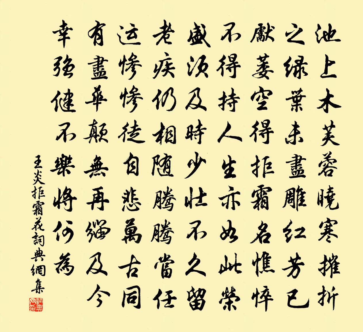 詩詞名句歷史字典書法欣賞書法字典國語詞典說文解字康熙字典古漢語字典標 題 作 者 詩 句 拒霜花作者:王炎 朝代:宋代拒霜花原文池上木芙蓉,曉寒摧折之。綠葉未盡雕,紅芳已先萎。空得拒霜名,憔悴不得持。人生亦如此,榮盛須及時。少壯不久留,老疾仍相隨。騰騰當任運,慘慘徒自悲。萬古同有盡,華顛無再緇。及今幸強健,不樂將何為。詩詞問答問:拒霜花的作者是誰?答:王炎問:拒霜花寫於哪個朝代?答:宋代王炎拒霜花書法欣賞拒霜花書法作品詩詞推薦千秋歲佚名〔宋代〕臘殘春近。江上梅開粉。一枝漏泄東君信。壽陽妝面靚,姑射冰姿瑩。似淺杏。清香試與分明認。只恐霜侵破,又答戶部員外賀遂涉戲贈趙謙光〔唐代〕錦帳隨情設,金爐任意熏。惟愁員外署,不應列星文。酬別道師許自然賀鑄〔宋代〕早慕浮雲恥系匏,泠然風馭起三茅。青菁可種無閒地,黃鶴歸來失舊巢。石鼎頗傳驚俗句,醉圖未免取僧嘲。何須最高樓(客有敗棋者,代賦梅)辛棄疾〔宋代〕花知否,花一似何郎。又似沈東陽。瘦稜稜地天然白,冷清清地許多香。笑東君,還又向,北枝忙。著一陣、霎時與歐陽伯威同飲遇卿江樓趙蕃〔宋代〕不上江樓又兩春,人間到處略知津。勞君置酒仍呼客,快語端能洗劫塵。效杜甫七歌在長洲縣作余懷〔清代〕有客有客字船子,平生赤腳踏海水。身經戰鬥少睡眠,功名富貴徒為爾。自比稷契何其愚,非薄湯武良有以。嗚呼蝶戀花·暖雨晴風初破凍李清照〔宋代〕暖雨晴風初破凍,柳眼梅腮,已覺春心動。酒意詩情誰與共?淚融殘粉花鈿重。乍試夾衫金縷縫,山枕斜欹,枕損江上寄情薛能〔唐代〕天際歸舟浩蕩中,我關王澤道何窮。未為時彥徒經國,尚有邊兵恥佐戎。釀黍氣香村欲社,斫桑春盡野無風。年來贈平首座王炎〔宋代〕家在青山下,投閒歲月多。杜門長卻掃。杖錫獨經過。學佛非無法,喔詩恐是魔。願言行古路,莫遣覆藤蘿。梁四諫議知鳳翔府楊億〔宋代〕幾日銀台閱副封,岐陽西顧委秦中。函關叱馭經天險,豳國聞雞接土風。雲幕杯盤三省近,星郵章奏九門通。下車次兩知縣韻四首陳造〔宋代〕暴醉琳腴飽棧羊,巡簷閒認小梅香。胡床曝背關情甚,古錦囊詩引興長。棕冠劉克莊〔宋代〕羽士過門賣,新翻樣愈奇。堅如龜屋制,精似鹿胎為。邛杖扶相稱,唐衣載最宜。笑他蟬冕客,憂畏白鬚眉。無夢令 繼重陽韻馬鈺〔元代〕師父說開顛倒。別是一般運造。外事削來無,便得裡頭尋討。大道。大道。清淨身有丹灶。宗門三印釋重顯〔宋代〕印水印泥印空,衲子不辨西東。撥開向上一竅,千聖齊立下風。秋遊六首邵雍〔宋代〕八月光陰未甚淒,松亭竹榭尤為宜。況當晝夜初停處,正是炎涼得所時。明月入懷如有意,好風迎面似相知。閒人登鹿門山懷古①孟浩然〔唐代〕清曉因興來,乘流越江峴。②沙禽近初識,浦樹遙莫辨。漸到鹿門山,山明翠微淺。岩潭多屈曲,舟楫屢迴轉。昔發柳河蘇頌〔宋代〕清晨驅馬兩崖間,霜重風高極險艱。前日使人沖雪去,今朝歸客踏冰還。道旁榛莽樵蘇少,野外污萊耒耨閒。還似廣化遇雨張耒〔宋代〕浮雲蔽高峰,台殿延晚色。風聲轉谷豪,雨腳射山白。東樓瞰虛明,龍甲排松柏。蕭森異人境,坐視動神魄。撞鐘緣識宋太宗〔宋代〕玄微達造化,得一不言三。利益眾生原,情迷謾口談。閒吟初冬真山民〔宋代〕一架琴書一筆床,杜門荏苒送年光。囊空儘可償詩債,腳倦猶能入醉鄉。即老菊花偏耐久,未開梅蕊已先香。眼邊名句推薦春夢醒來么?對春帆細雨,獨自吟喔。譚嗣同《望海潮·自題小影》 隱隱飛橋隔野煙,石磯西畔問漁船。張旭《桃花溪》 神女生涯原是夢,小姑居處本無郎。李商隱《無題·重幃深下莫愁堂》 玉樓金闕慵歸去,且插梅花醉洛陽朱敦儒《鷓鴣天·西都作》 黃葉古祠寒雨積,清山荒冢白雲多。于謙《岳忠武王祠》 他人有心,予忖度之。佚名《巧言》 春風又綠江南岸,明月何時照我還?王安石《泊船瓜洲》 柳庭風靜人眠晝,晝眠人靜風庭柳。蘇軾《菩薩蠻·回文夏閨怨》 丈夫非無淚,不灑離別間。陸龜蒙《別離》 吳絲蜀桐張高秋,空山凝雲頹不流李賀《李憑箜篌引》