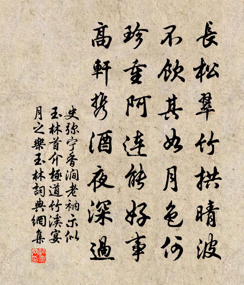 詩詞名句歷史字典書法欣賞書法字典國語詞典說文解字康熙字典古漢語字典標 題 作 者 詩 句 香澗老衲示似玉林首介極道竹溪宴月之樂玉林作者:史彌寧 朝代:宋代原文長松翠竹拱晴波,不飲其如月色何。珍重阿連能好事,高軒攜酒夜深過。詩詞問答問:《香澗老衲示似玉林首介極道竹溪宴月之樂玉林》的作者是誰?答:史彌寧問:該詩寫於哪個朝代?答:宋代書法欣賞香澗老衲示似玉林首介極道竹溪宴月之樂玉林書法作品詩文賞析【原題】:香澗老衲示似玉林首介極道竹溪宴月之樂玉林勉以屬和詩詞推薦送人南歸王操〔宋代〕相送當搖落,孤舟泛涉瀰。去帆看已遠,臨水立多時。別浦寒鴻下,空山夜鶴移。他年重會面,冷鬢共成絲。京師廢宅張耒〔宋代〕當道朱門白晝扃,高堂歌吹久無聲。古窗積雨昏殘畫,朽樹經陰長寄生。問下老人時灑掃,舊時來客嘆平生。艷姬民情吟邵雍〔宋代〕民情既樂,和氣為祥。民情既憂,戾氣為殃。祥為雨露,天下豐穰。殃為水旱,天下凶荒。悲新年盧仝〔唐代〕新年何事最堪悲,病客遙聽百舌兒。太歲只游桃李徑,春風肯管歲寒枝。樟亭觀濤佚名〔唐代〕濤來勢轉雄,獵獵駕長風。雷震雲霓里,山飛霜雪中。激流起平地,吹澇上侵空。翕闢乾坤異,盈虛日月同。艅艎辛亥上冢姜特立〔宋代〕寒閨守節少年時,志凜冰霜不可移。追遠積成千古恨,報恩寬作十年期。此生不愧先君死,後世應傳寡婦碑。蘭若重經昭陵杜甫〔唐代〕草昧英雄起,謳歌歷數歸。風塵三尺劍,社稷一戎衣。翼亮貞文德,丕承戢武威。聖圖天廣大,宗祀日光輝。陵寢次韻鄧慎思初入同文館孔武仲〔宋代〕十載江湖萬里行,偶來西館閱豪英。雲龍九闕晨書詔,燈火千門夜出城。瀟灑庭除當月色,重稠幕帟斷人聲。年家嘆張縡宋庠〔宋代〕嶠外歸來白髮新,胸中無物有經綸。局當轅下驊騮足,倚著門邊骯髒人。風雪又殘梁苑歲,煙蘿誰管楚山春。由來點絳唇舒亶〔宋代〕紫霧香濃,歲華風轉花隨輦。洞天雲暖。一片笙歌遠。水殿龍舟,憶侍瑤池宴。閒庭院。夢回春半。雪鬢無人見。送林教授行鄭清之〔宋代〕石鼎煎茶午夢醒,羊腸怕聽繞車聲。剡舟忽至驚安道,漢使新招別子卿。交誼從君知絕俗,凋年如我最關情。鸞凰九月初作陸游〔宋代〕富貴功名未足雲,平生一飯不忘君。喔詩高韻淒金石,把釣幽情渺水雲。落葉打窗秋已暮,歸鴉泊樹日將曛。欲知懷齊己曇域〔唐代〕鬢髯秋景兩蒼蒼,靜對茅齋一炷香。病後身心俱澹泊,老來朋友半凋傷。峨眉山色侵雲直,巫峽灘聲入夜長。猶喜城南即事張栻〔宋代〕枕邊風雨過今春,起步園林已綠陰。更向坡頭望湘浦,水雲無際繞遙岑。宣孺斫庭前蘆葦見山有薝蔔入坐中示詩次其韻李流謙〔宋代〕扶搖何啻九萬里,盍不往作蛟螭騰。笑我真為折腰尉,如君雅稱喔詩丞。輒班下寮愧連璧,屢愛新詩工琢冰。斫林暗香吳潛〔宋代〕及歌酒其下,今荒矣。園乃歐公記、君謨書,古今稱二絕。猶憶其詞云:高甍巨桷,水光日影,動搖而下上,其寬和趙郎中捕蝗見寄次韻蘇軾〔宋代〕麥穗人許長,穀苗牛可沒。天公獨何意,忍使蝗蟲發。驅攘著令典,農事安可忽。我仆既胼胝,我馬亦款矻。飛騰端午帖子皇帝閣周必大〔宋代〕三殿晨開錫宴初,太官順節進龜魚。微臣筆力慚燕許,謾賦群官上玉除。兒歸行孔武仲〔宋代〕兒歸兒不歸。朝為子母歡,暮為禽鳥飛。故居不得返,深林安可依。此身寂寞已如此,我母在家應憶子。子今豈不江南曲四首周文璞〔宋代〕雨認巫山氣,江通淫預情。相逢未多時,秋花開古城。名句推薦人逢喜事精神爽,悶上心來瞌睡多。吳承恩《西遊記·第三十五回》 不忍登高臨遠,望故鄉渺邈,歸思難收。柳永《八聲甘州·對瀟瀟暮雨灑江天》 雪似梅花,梅花似雪。呂本中《踏莎行·雪似梅花》 明眸皓齒誰復見,只有丹青余淚痕。蘇軾《虢國夫人夜遊圖》 不忘故鄉,仁也;不戀本土,達也。房玄齡《晉書·列傳·第三章》 主闇於上,臣詐於下,滅亡無日荀子《荀子·君道》 恨鐵不成鋼曹雪芹《紅樓夢·第九十六回》 正是浴蘭時節動。菖蒲酒美清尊共。歐陽修《漁家傲·五月榴花妖艷烘》 瀑布風前千尺影,疑瀉銀河一派。朱栴《念奴嬌·雪霽夜月中登樓望賀蘭山作》 佳游不可得,春風惜遠別。李白《登梅岡望金陵贈族侄高座寺僧中孚》