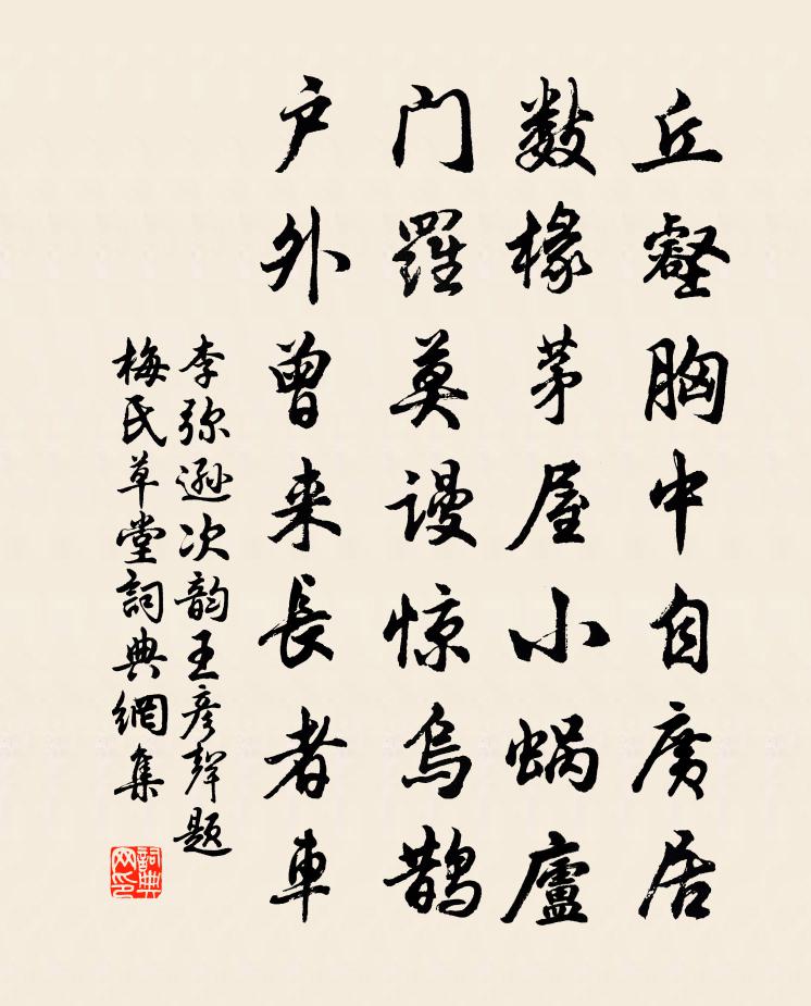 詩詞名句歷史字典書法欣賞書法字典國語詞典說文解字康熙字典古漢語字典標 題 作 者 詩 句 次韻王彥聲題梅氏草堂作者:李彌遜 朝代:宋代次韻王彥聲題梅氏草堂原文丘壑胸中自廣居,數椽茅屋小蝸廬。門羅莫謾驚烏鵲,戶外曾來長者車。詩詞問答問:次韻王彥聲題梅氏草堂的作者是誰?答:李彌遜問:次韻王彥聲題梅氏草堂寫於哪個朝代?答:宋代李彌遜次韻王彥聲題梅氏草堂書法欣賞次韻王彥聲題梅氏草堂書法作品詩詞推薦郡檄子肅檢視旱田以詩寄之趙蕃〔宋代〕是邦且熟無多收,況於水旱相為憂。使君奏課避非實,檄公按視臨田疇。民聞公來相告語,活國憂民公自許。平時題鄭拾遺南齋許棠〔唐代〕明時無事諫,豈是隱明君。每值離丹陛,多陪宴白雲。門連蕭洞僻,地與曲江分。滿院皆檉竹,期棲鸞鶴群。登雲岩塔二絕方萬里〔宋代〕窣堵崔嵬置曲欄,不知身在碧雲端。墨題便是慈恩約,只尺聯鑣上廣寒。減字木蘭花·去年今夜呂本中〔宋代〕去年今夜。同醉月明花樹下。此夜江邊。月暗長堤柳暗船。故人何處。帶我離愁江外去。來歲花前。又是今年憶去寄神光末宗和尚釋可湘〔宋代〕萬太神光滌世昏,莫知誰信有乾坤。三山眼底多尊宿,那個來敲老觀門。行園僧約同飲方回〔宋代〕晴向小園窺,今朝忽有詩。乳鵝餚菜葉,躍鵲顫花枝。春氣寒終暖,愁人老更衰。醉僧約同飲,徇俗未容辭。木蘭花慢仇遠〔宋代〕泥涼閒倚竹,奈冉冉、碧云何。愛水檻空明,風疏畫扇,雪透香羅。惺松未成楚夢,看玲瓏、清影罩平坡。便有一壺中天慢曾覿〔宋代〕素飈漾碧,看天衢穩送、一輪明月。翠水瀛壺人不到,比似世間秋別。玉手瑤笙,一時同色,小按霓裳疊。天津橋走筆和張功父玉照堂十絕楊萬里〔宋代〕騃女痴兒總愛梅,道人衲子亦爭栽。何如雪後瓊瑤跡,印記詩人獨自來。一葉舟侯善淵〔元代〕大道孤然獨立。善用本元轍跡。寰海好雲遊。玩清秋。月色扶空澄瑞,微現桂紅輕翠。嘉景最奇幽。賽瀛洲。偈頌三十首釋慧暉〔宋代〕直把肌彌錘子,正打虛空鼓子。穩坐寥寥而不妨,全身寂寂而忘志。和子有感時洪咨夔〔宋代〕八州都督新推轂,兩紀中書舊覆甌。郿塢然臍如東策,聊城飛笴便無憂。次曾谹父韻二首王洋〔宋代〕白玉堂中書漏遲,小姑新學竹枝詞。中郎禾力高千丈,不稱詩情不作詩。酬次李辰甫所寄三首吳說〔宋代〕扁舟東下初乘興,明月南飛竟失群。田父語言時近道,世人嘲笑尚論文。九山斂氣橫寒野,一塢朝陽聚暖雲。勝處滿江紅黃機〔宋代〕雲暗山昏,西風撼、一天悲雨。隱君問、短牆修竹,故園何處。九月江南無雁到,素書封了誰傳與。待從頭、拚卻送街坊釋慧空〔宋代〕道在未能速說,缽空且要人持。驀地街頭築著,方知此老慈悲。偈頌六十五首釋普濟〔宋代〕一天星斗大家看,獨有渠儂見處偏。打失眼晴拈得口,至今腳下墨漫漫。酬秘書王丞見寄雍陶〔唐代〕朝下有閒思,南溝邊水行。因來見寥落,轉自嘆平生。白首丈夫氣,赤心知己情。留詩本相慰,卻憶苦吟聲。送芝上人游廬山蘇軾〔宋代〕二年閱三州,我老不自惜。團團如磨牛,步步踏陳跡。豈知世外人,長與魚鳥逸。老芝如雲月,炯炯時一出。比年大雪中李提舉惠玻璃泉兩榼二首張耒〔宋代〕峰高凍雪埋蒼玉,河靜黃沙咽濁流。嗟我殘年為遠客,煩君雙榼散羇愁。屠蘇御歲將傳盞,彩勝宜春欲插頭。痛飲名句推薦良冶之子,必學為裘;良弓之子,必學為箕戴聖《禮記·學記》 孤舟向廣武,一鳥歸成皋。岑參《鞏北秋興寄崔明允》 迴廊四合掩寂寞,碧鸚鵡對紅薔薇。李商隱《日射》 漆燕黃鸝夸舌健,柳花榆莢斗身輕。王禹偁《清明日獨酌》 涕零雨面毀形顏,誰能懷憂獨不嘆。曹丕《燕歌行二首·其二》 博厚,所以載物也。高明,所以覆物也。悠久,所以成物也。子思《中庸·第二十六章》 白鳥悠悠自去,汀洲外、無限蒹葭。王國維《滿庭芳·水抱孤城》 四十三年,望中猶記,烽火揚州路。辛棄疾《永遇樂·京口北固亭懷古》 未知生,焉知死?孔子弟子《論語·先進篇》 山重水複疑無路,柳暗花明又一村。陸游《游山西村》