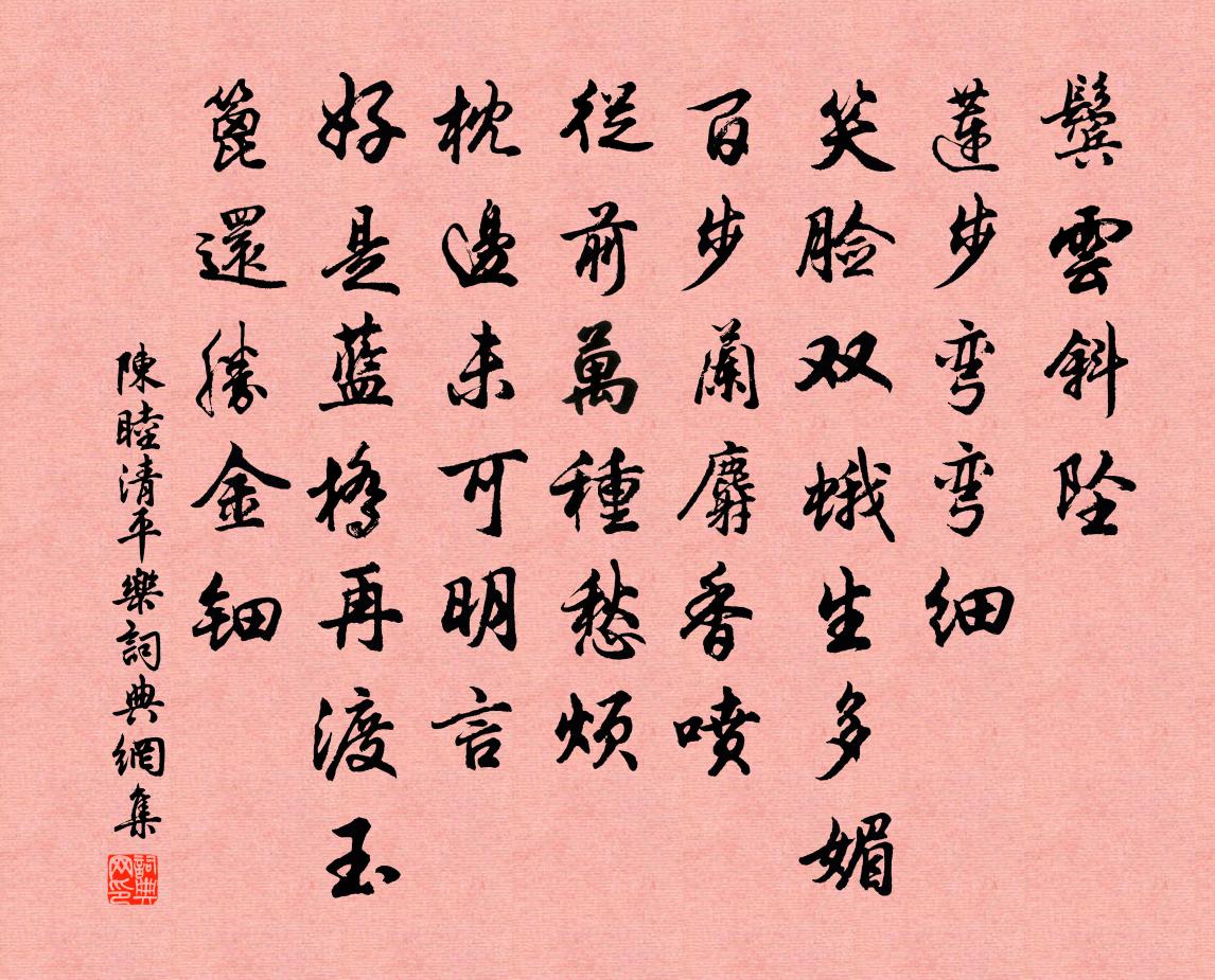 詩詞名句歷史字典書法欣賞書法字典國語詞典說文解字康熙字典古漢語字典標 題 作 者 詩 句 清平樂作者:陳睦 朝代:宋代清平樂原文鬢雲斜墜。蓮步彎彎細。笑臉雙蛾生多媚。百步蘭麝香噴。從前萬種愁煩。枕邊未可明言。好是藍橋再渡,玉篦還勝金鈿。詩詞問答問:清平樂的作者是誰?答:陳睦問:清平樂寫於哪個朝代?答:宋代問:清平樂是什麼體裁?答:詞陳睦清平樂書法欣賞清平樂書法作品詩詞推薦雨中遣懷陸游〔宋代〕秋稼連雲飽不疑,寧期一敗莫支持。雨如梅子初黃日,水似桃花欲動時。正晝蚊虻驅不去,終宵鼁黽怒何為?凶年題宛陵張待舉曲肱亭黃庭堅〔宋代〕仲蔚蓬蒿宅,宣城詩句中。人賢忘巷陋,境勝失途窮。寒葅書萬卷,零亂剛直胸。偃蹇勳業外,嘯歌山水重。晨雞題石溪偉觀易士達〔宋代〕水共長天不盡頭,石溪奇處著危樓。我來倚徒闌乾看,風撼蘆花葉葉秋。次韻袁起岩送示郡沼雙蓮圖范成大〔宋代〕珠淵玉水折方員,湧出雙蓮照酒邊。壓倒小湖 * 草,增光後沼兩重蓮。苕華名字元相併,桃葉根株本自連。好把送呂澤父釋寶曇〔宋代〕姓名元自徹東都,舊日河南肯便疏。利害總關天下事,聰明不惑枕中書。花迎馬首渾無賴,山似人情卻有餘。我亦雨中自秘書省訪王三侍御知早入朝便入集賢…詩贈之李德裕〔唐代〕共憐獨鶴青霞姿,瀛洲故山歸已遲。仁者焉能效鷙鶚,飛舞自合追長離。梧桐迥齊鳷鵲觀,煙雨屢拂蛟龍旗。鴻雁八月十五日夜,聞崔大員外翰林獨直,對酒玩白居易〔唐代〕秋月高懸空碧外,仙郎靜玩禁闈間。歲中唯有今宵好,海內無如此地閒。皓色分明雙闕榜,清光深到九門關。遙聞雨中望蓬萊山張君房〔宋代〕重簾垂密雨,孤夢隔秋宮。紅爐九華暗,香消芳思融。仙忻望不及,鶴信遣誰通。但云許玉斧,寧知張巨公。竹陳元晉〔宋代〕吾敬五子猷,傲俗獨愛竹。行止必與俱,情義均骨肉。雲龍求友心,上下亦相逐。彼哉絕彝倫,乃戒又下宿。高陽台·橋影流虹朱彝尊〔清代〕橋影流虹,湖光映雪,翠簾不捲春深。一寸橫波,斷腸人在樓陰。遊絲不系羊車住,倩何人傳語青禽?最難禁,倚雜題陳師道〔宋代〕亂水交如線,群山翠作屏。寒輕春稍稍,雪盡麥青青。霜草猶疑滑,風林漸喜聽。生涯鞍馬上,歲月短長亭。望蓬萊 寄張四秀才王丹桂〔元代〕清河氏,聽取此根原。自昔未逢超岸筏,而今又值下坡年。猶被世情牽。繁華境,虛幻不牢堅。休向夢中重作夢,少年時嘗過一村院見壁上有詩云夜涼疑有雨院蘇軾〔宋代〕佛燈漸暗飢鼠出,山雨忽來修竹鳴。知是何人舊詩句,已應知我此時情。感懷宋祁〔宋代〕天與疏慵地,人無榮進心。死灰差免溺,棄仗即成林。主諾固多暇,避賢懷所欽。難邀潁川鳳,敢望漢台金。倚酒次前韻謝王主簿二首項安世〔宋代〕南州高士到湘州,山鬼湘娥暮暮愁。行世頭顱渾欲老,賀天胸次未經酬。搜殘風月三千界,吟破江湖九十洲。誰報玉樓春(許運乾生辰)楊無咎〔宋代〕朱簾碧瓦乾雲際。占盡瀟灘形勢地。傍牆人喚狀元家,想見華堂融瑞氣。壽杯莫惜團欒醉。跳虎轉龜尋舊喜。小邦偈頌一百六十首釋宗杲〔宋代〕投子下繩床,今朝為舉揚。驢前馬後漢,切忌亂承當。歲晚書事十首劉克莊〔宋代〕書生元不信禨祥,老去無端慮事祥。白髮社巫雲日吉,明朝渫井更苫牆。今日何夕曾豐〔宋代〕今夕何夕,袢暑其蒸。於後之旦,維槿始榮。有綽其聲,我後中興。我公協成,有功有能。我後顯旌,不伐不矜。庚子臘月五日司空圖〔唐代〕復道朝延火,嚴城夜漲塵。驊騮思故第,鸚鵡失佳人。禁漏虛傳點,妖星不振辰。何當回萬乘,重睹玉京春。名句推薦桃李不言,下自成蹊。司馬遷《史記·李將軍列傳》 易漲易退山溪水,易反易覆小人心。佚名《增廣賢文·上集》 報導先生歸也,杏花春雨江南。虞集《風入松·寄柯敬仲》 雨雪自飛千嶂外,榆林只隔數峰西。朱彝尊《出居庸關》 何方可化身千億,一樹梅花一放翁。陸游《梅花絕句·其一》 餘霞散成綺,澄江靜如練。謝朓《晚登三山還望京邑》 相逢處,自有暗塵隨馬。周邦彥《解語花·上元》 未羞他、雙燕歸來,畫簾半卷張炎《解連環·孤雁》 飛絮濛濛。垂柳闌乾盡日風。歐陽修《採桑子·群芳過後西湖好》 志不勵,則士不死節;士不死節,則眾不戰。尉繚《尉繚子·戰威》