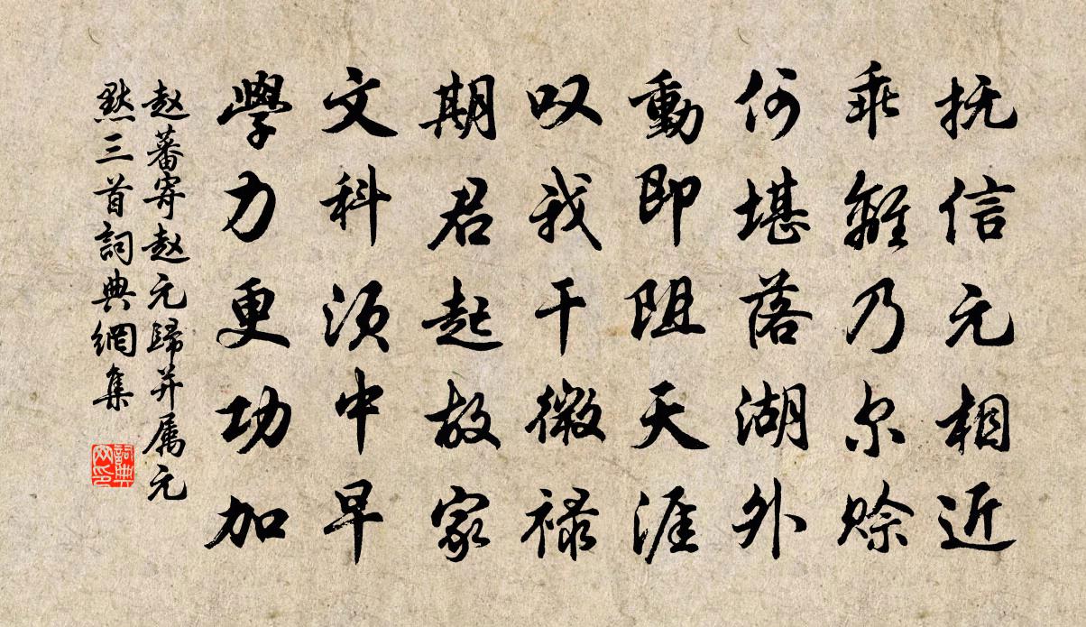 詩詞名句歷史字典書法欣賞書法字典國語詞典說文解字康熙字典古漢語字典標 題 作 者 詩 句 寄趙元歸併屬元默三首作者:趙蕃 朝代:宋代寄趙元歸併屬元默三首原文撫信元相近,乖離乃爾賒。何堪落湖外,動即阻天涯。嘆我1-1乾微祿,期君起故家。文科須中早,學力更功加。詩詞問答問:寄趙元歸併屬元默三首的作者是誰?答:趙蕃問:寄趙元歸併屬元默三首寫於哪個朝代?答:宋代趙蕃寄趙元歸併屬元默三首書法欣賞寄趙元歸併屬元默三首書法作品詩詞推薦玉樓春歐陽修〔宋代〕西亭飲散清歌闋。花外遲遲宮漏發。塗金燭引紫騮嘶,柳曲西頭歸路別。佳辰只恐幽期闊。密贈殷勤衣上結。翠屏上張舍人方乾〔唐代〕海內芳聲誰可並,承家三代相門深。剖符已副東人望,援筆曾傳聖主心。此地清廉惟飲水,四方焦熱待為霖。他年蝶戀花趙令畤〔宋代〕鏡破人離何處問。路隔銀河,歲會知猶近。只道新來消瘦損。玉容不見空傳信。棄擲前歡俱未忍。豈料盟言,陡頓寄題程氏菊莊馬廷鸞〔宋代〕最愛誠齋語絕佳,莫將清苦入妍華。淡香秋晚誰能道,猶是安陽晝錦家。海棠花方回〔宋代〕錦城春色萬人迷,飯顆無心著品題。實不如華謾濃艷,秋霜誰覷海棠梨。學詩吟十首方回〔宋代〕吾書能忍書窮,所以書不仕宦。兩紀加一載,考槃歌在澗。當車穩杖屨,當書飽藜莧。雖然鮮歡娛,終不墮憂患。和王弱翁七首彭龜年〔宋代〕曉日開屏障,籃輿行畫圖。融融萬物表,此處是規模。鷓鴣天·送歐陽國瑞入吳中辛棄疾〔宋代〕莫避春陰上馬遲。春來未有不陰時。人情展轉閒中看,客路崎嶇倦後知。梅似雪,柳如絲。試聽別語慰相思。短篷雪羅隱〔唐代〕細玉羅紋下碧霄,杜門顏巷落偏饒。巢居只恐高柯折,旅客愁聞去路遙。撅凍野蔬和粉重,掃庭松葉帶酥燒。寒窗秋夜泛舟王安石〔宋代〕池塹秋水淨,扁舟逆涼飆。的皪荷上珠,俯映疏星搖。深尋畏魚淰,中路且回橈。冥冥菰蒲中,乃復有驚跳。送賈升主簿之荊府孟浩然〔唐代〕奉使推能者,勤王不暫閒。觀風隨按察,乘騎度荊關。送別登何處,開筵舊峴山。征軒明日遠,空望郢門間。真州北山劉克莊〔宋代〕憶昔胡兒入控弦,官軍迎戰北山邊。笳簫有主安新葬,蓑笠無人墾廢田。兵散荒營吹戌笛,僧從敗屋盧茶煙。遙憐題渤海高夫人行實家鉉翁〔宋代〕當年初賦柏舟詩,正是中原板蕩時。手挾雛孤歷關險,身邊鴈影到天涯。五遷才定霜侵鬢,百歲何曾笑展眉。為報明州觀大閱劉過〔宋代〕書生燈窗困毛錐,說著刀劍何時持。忽聞殷殷金鼓震,驚起塊坐筋骸衰。國朝右武重秋獮,列郡敢不張其威。萬家煎茶釋文珦〔宋代〕吾生性嗜苦茗,性春山瓷攀性緣。采采性不盈掬,浥露殊芳鮮。慮溷仙草性,崖間取靈泉。石鼎乃所宜,灌濯手自別老母黃景仁〔清代〕搴帷拜母河梁去,白髮愁看淚眼枯。慘慘柴門風雪夜,此時有子不如無。落花陸游〔宋代〕桃李擅春事,酴醾為之殿。豈不欲周旋,過日如掣電。大風連三日,吹盡無餘片。留之豈有策,佇立情眷眷。空令出禮部試院王才元惠梅花三種皆妙絕戲答三首黃庭堅〔宋代〕舍人梅塢無關鎖,攜酒俗人來未曾。舊時愛菊陶彭澤,今作梅花樹下僧。春風扇微和張匯〔唐代〕木德生和氣,微微入曙風。暗催南向葉,漸翥北歸鴻。澹蕩侵冰谷,悠揚轉蕙叢。拂塵回廣路,泛籟過遙空。暖上元宵懷鄉二首董嗣杲〔宋代〕萬宇燈輝斂暗塵,幾年醉賞禁街春。良宵獨宿雙泉寺,負了吟風嘯月身。名句推薦樹繞村莊,水滿陂塘。秦觀《行香子·樹繞村莊》 不似天涯,捲起楊花似雪花。蘇軾《減字木蘭花·立春》 過春風十里,盡薺麥青青。姜夔《揚州慢·淮左名都》 夢中未比丹青見,暗裡忽驚山鳥啼。姜夔《鷓鴣天·元夕有所夢》 羌笛何須怨楊柳,春風不度玉門關。王之渙《涼州詞二首·其一》 婦人依倚子與夫,同居貧賤心亦舒。張籍《征婦怨》 想當年,金戈鐵馬,氣吞萬里如虎。辛棄疾《永遇樂·京口北固亭懷古》 了卻君王天下事,贏得生前身後名。辛棄疾《破陣子·為陳同甫賦壯詞以寄之》 人胸中各有個聖人,只自信不及,都自埋倒了。王陽明《傳習錄·卷下·門人陳九川錄》 居而安,動而變,可以佐王矣。王通《中說·卷七·述史篇》
