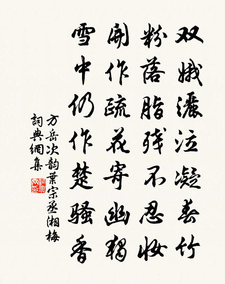 詩詞名句歷史字典書法欣賞書法字典國語詞典說文解字康熙字典古漢語字典標 題 作 者 詩 句 次韻葉宗丞湘梅作者:方岳 朝代:宋代次韻葉宗丞湘梅原文雙娥灑泣凝春竹,粉落脂殘不忍妝。開作疏花寄幽獨,雪中仍作楚騷香。詩詞問答問:次韻葉宗丞湘梅的作者是誰?答:方岳問:次韻葉宗丞湘梅寫於哪個朝代?答:宋代方岳次韻葉宗丞湘梅書法欣賞次韻葉宗丞湘梅書法作品詩詞推薦村圃陸游〔宋代〕村圃穿荒翳,秋容變慘淒。柳疏蟬噪急,雨重鵲飛低。小草臨池學,新詩滿竹題。若令車馬到,何處有幽棲?三老堂秦觀〔宋代〕堂堂三元老,業履冠儔匹。蹇諤橫秋霜,高明麗朝日。並道謁溫宣,連科收甲乙。東南奠藩服,西北馳使驛。解鞅江晦叔邀游吳氏園約月余始能一往吳生某求留李復〔宋代〕竹屋橫虛舫,松屏展翠帆。柳條晴後弱,花態曉來嚴。樂意難逢暇,清游久嘆淹。主人求客語,乘醉寫雲岩。臨江仙 長安新出家者馬鈺〔元代〕此個隴西明大道,看來俗累難拘。報予天水慕清虛。彭城歸正覺,割愛後來閭。更有段公 * 性,悟來巧變痴愚。夜行船毛滂〔宋代〕弄水餘英溪畔。綺羅香、日遲風慢。桃花春浸一篙深,畫橋東、柳低煙遠。漲綠流紅空滿眼。倚蘭橈、舊愁無限。偈頌二十五釋智遇〔宋代〕春風如刀,春雨如膏。衲僧門下,何用忉忉。水調歌頭(奉餞冠之之行)趙善括〔宋代〕佳客志淮海,賤子設樽罍。楚江昨夜清漲,短棹已安排。休問南樓風月,且念陽台雲雨,幾日卻重來。銀燭正凝淚題梅山雲悅樓李君式〔宋代〕無心出岫道人閒,身在虛無縹渺間。可惜雲霓人在望,卷將雲雨入梅山。次韻張太博方得余所遺二程先生集辨二程戲邵許應龍〔宋代〕文字未科斗,圖書未龜龍。燦然天地間,此理觸處逢。是謂象之祖,而為數之宗。昊羲古神聖,先得人所同。文因吳越吟二首邵雍〔宋代〕乙未闔廬凌楚歲,戊辰勾踐破吳時。正如當日乘虛事,三十四年人不知。六月十五日時閔雨甚矣三乎趙蕃〔宋代〕去此林篁蔽,出茲溪谷深。倍能明病眼,頓覺洗塵襟。問隱平生志,依僧夙昔心。危亭已無跡,斷刻尚堪臨。永遇樂(初夏獨坐西山釣台新亭)李彌遜〔宋代〕曲徑通幽,小亭依翠,春事才過。看筍成竿,等花著果,永晝供閒坐。蒼蒼晚色,臨淵小立,引首暮鷗飛墮。悄無駕幸溫泉盧象〔唐代〕傳聞聖主幸新豐,清蹕鳴鑾出禁中。細草終朝隨步輦,垂楊幾處繞行宮。千官扈從驪山北,萬國來朝渭水東。此日洞仙歌(壽盧竹溪)陳著〔宋代〕清溪帶竹,竹外山光抱。新築渾如圖畫了。稱閒心、管領昨夜天風,吹送□,端的琅音恰到。誰知青雲上,鸞鳳翱魏氏園林人賦一物得秋亭萱草陳子昂〔唐代〕昔時幽徑里。榮耀雜春叢。今來玉墀上。銷歇畏秋風。細葉猶含綠。鮮花未吐紅。忘憂誰見賞。空此北堂中。清明前十日大雪二首鄭剛中〔宋代〕南山春晏蕨生芽,怪得清寒數倍加。一雪洗將紅紫去,高低林樹試瑤花。送秦侍御外甥張篆之福州謁鮑大夫秦侍御與大夫有舊劉長卿〔唐代〕萬里閩中去渺然,孤舟水上入寒煙。轅門拜首儒衣弊,貌似牢之豈不憐。西江月 贈安靜散人俱守極馬鈺〔元代〕休要尋龍尋虎,不須搜奼搜嬰。勿勞講論汞鉛精。儘是虛名惑恁。只要心中清靜。無為便是功成。慈悲相助氣神凝偈頌二十九首釋雲〔宋代〕參禪人,莫造作。擬心即差,動念即錯。大乘小乘,錢貫井索。前三後三,佛手驢腳。開眼也著,合眼也著。擬向昔在九江,與蘇伯固唱和。其略曰我夢扁舟浮蘇軾〔宋代〕扁舟震澤定何時,滿眼廬山覺又非。春草池塘惠連夢,上林鴻雁子卿歸。水香知是曹溪口,眼淨同看古佛衣。不向名句推薦思歸未可得,書此謝情人。李白《送郄昂謫巴中》 暗室虧心,神目如電。徐田臣《戲文·殺狗記》 道千乘之國,敬事而信,節用而愛人,使民以時。孔子弟子《論語·學而篇》 少小離家老大回,鄉音無改鬢毛衰。賀知章《回鄉偶書二首·其一》 天子居未央,妾侍卷衣裳。李白《秦女卷衣》 寒氣先侵玉女扉,清光旋透省郎闈。李商隱《對雪二首》 漢甲連胡兵,沙塵暗雲海。李白《經亂離後天恩流夜郎憶舊遊書懷贈江夏韋太守良宰》 治世不一道,便國不必法古。商鞅《商君書·更法》 武皇去金閣,英威長寂寞江淹《銅爵妓》 窮冬烈風,大雪深數尺,足膚皸裂而不知。宋濂《送東陽馬生序》