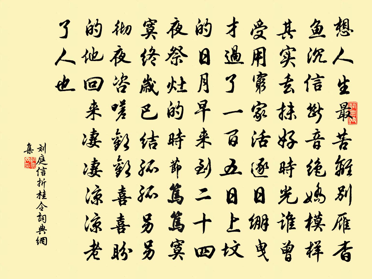 詩詞名句歷史字典書法欣賞書法字典國語詞典說文解字康熙字典古漢語字典標 題 作 者 詩 句 折桂令作者:劉庭信 朝代:元代折桂令原文想人生最苦離別。雁杳魚沉,信斷音絕。嬌模樣其實丟抹,好時光誰曾受用,窮家活逐日繃曳。才過了一百五日上墳的日月,早來到二十四夜祭灶的時節。篤篤寞寞終歲巴結,孤孤另另徹夜咨嗟。歡歡喜喜盼的他回來,淒淒涼涼老了人也!詩詞問答問:折桂令的作者是誰?答:劉庭信問:折桂令寫於哪個朝代?答:元代問:折桂令是什麼體裁?答:散曲劉庭信折桂令書法欣賞折桂令書法作品詩詞推薦古樂府白紵四時歌黃庭堅〔宋代〕日晴桑葉綠宛宛,春蠶忽忽都成繭。繰車宛轉頭緒多,相思如此心亂何。少年志願不成就,故年主人且恩舊。及河薛侍朗移鎮合肥被命入覲賦唐律詩二章曹彥約〔宋代〕經濟蜚聲數十年,只今韞櫝固依然。老於思慮惟憂國,好在功名更守邊。人望鼎來須易地,春風早去便朝天。漢家登鹿門山懷古①孟浩然〔唐代〕清曉因興來,乘流越江峴。②沙禽近初識,浦樹遙莫辨。漸到鹿門山,山明翠微淺。岩潭多屈曲,舟楫屢迴轉。昔秋望吟邵雍〔宋代〕草色連雲色,山光接水光。危樓一百尺,旅雁兩三行。人心吟柴元彪〔宋代〕長江萬頃深,風靜波自止。人心僅一寸,日夜風波起。桑田倏滄海,汩沒勢未已。安得今人心,常如古井水。洞庭山王禹偁〔宋代〕吳山無此秀,乘暇一游之。萬傾湖光里,千家橘熟時。平看月上早,遠覽鳥歸遲。近古誰真賞,白雲應得知。送碧梧入府許月卿〔宋代〕人勸酒公入相,酒我勸公早酒歸。今以酒副樞入,好以元樞回。易為六經宗,學易貴知時。時止則時行,時義大矣次韻竹溪題達卿後坡劉克莊〔宋代〕郎陵後嗣尤推彧,太傅諸孫最數嘉。之子固無慚爾祖,此翁所望大吾家。奪標羞與兒童競,佩印才堪妾婦夸。案上商子引語佚名〔先秦〕愚者暗於成事。智者見於未萌。雜曲歌辭。妾薄命三首李端〔唐代〕憶妾初嫁君,花鬟如綠雲。回燈入綺帳,對面脫羅裙。折步教人學,偷香與客熏。容顏南國重,名字北方聞。一從芳樹蕭衍〔南北朝〕綠樹始搖芳,芳生非一葉。一葉度春風,芳芳自相接。色雜亂參差,眾花紛重疊。重疊不可思,思此誰能愜。送李登少府賈島〔唐代〕伊陽耽酒尉,朗詠醉醒新。應見嵩山里,明年躑躅春。一千尋樹直,三十六峰鄰。流水潺潺處,堅貞玉澗珉。次韻元衡病酒伏枕趙蕃〔宋代〕陰從元日到人日,四體不佳真若病。每煩從事與料理,百戰不能圖一勝。幾思屏去不復親,茗碗薰爐事閒靜。鳴鳩座間分韻得道字王義山〔宋代〕一年景物秋最好,秋到重陽秋更老。留取黃花待再來,殷勤寄與西風道。菊花了後到梅花,梅花開時雪交加。何當懷昔舒岳祥〔宋代〕淮海新封國,東南望止戈。紗衣秋意早,石枕雨聲多。白露皺紅棗,西風擺老荷。昔年游萬里,今日興如何。旱麓佚名〔先秦〕瞻彼旱麓,榛楛濟濟。豈弟君子,乾祿豈弟。瑟彼玉瓚,黃流在中。豈弟君子,福祿攸降。鳶飛戾天,魚躍於淵。趙大監時賞第一百一十九文天祥〔宋代〕豪傑貴勳業,宗支神翹後。平生白羽扇,欝結回我首。戊申看花詩余懷〔清代〕五十年來老病愁,江山佳處幾回頭。齊梁舊事風吹去,柳葉梨花恨未休。百年歌陸機〔魏晉〕三十時。行成名立有令聞。力可扛鼎志乾雲。食如漏巵氣如熏。辭家觀國綜典文。高冠素帶煥翩紛。酒將炙奈樂何太常樂章三十首其九酌獻第五室奏大定之舞曲楊億〔宋代〕赫赫太祖,受命於天。赤符啟運,威加八埏。神武戡難,功無間然。翼翼丕承,億萬斯年。名句推薦忽然更作漁陽摻,黃雲蕭條白日暗。李頎《聽安萬善吹觱篥歌》 不惜千金買寶刀,貂裘換酒也堪豪。秋瑾《對酒·不惜千金買寶刀》 雲鬟綠鬢罷梳結,愁如回飆亂白雪。李白《久別離》 難相見,易相別,又是玉樓花似雪。韋莊《應天長·別來半歲音書絕》 陽關萬里道,不見一人歸。庾信《重別周尚書》 足國之道:節用裕民,而善臧其餘。荀子《荀子·富國》 寒燈思舊事,斷雁警愁眠。杜牧《旅宿》 雲和積雪蒼山晚,煙伴殘陽綠樹昏。周朴《春日秦國懷古》 我非生而知之者,好古,敏以求之者也。孔子弟子《論語·述而篇》 零落江南不自由。兩綢繆。料得吟鸞夜夜愁。姜夔《憶王孫·番陽彭氏小樓作》