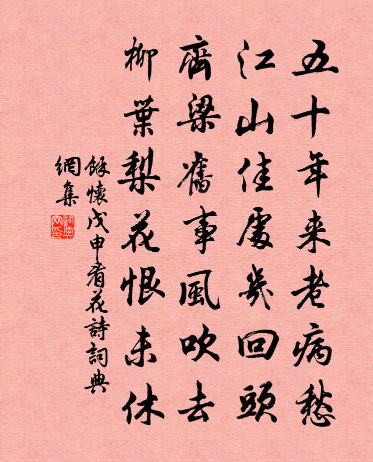 詩詞名句歷史字典書法欣賞書法字典國語詞典說文解字康熙字典古漢語字典標 題 作 者 詩 句 戊申看花詩作者:余懷 朝代:清代戊申看花詩原文五十年來老病愁,江山佳處幾回頭。齊梁舊事風吹去,柳葉梨花恨未休。詩詞問答問:戊申看花詩的作者是誰?答:余懷問:戊申看花詩寫於哪個朝代?答:清代問:戊申看花詩是什麼體裁?答:七絕余懷戊申看花詩書法欣賞戊申看花詩書法作品詩詞推薦初冬雜題陸游〔宋代〕五斗安能解醉酲,瞢騰睡眼怯窗明。策勛賴有春芽在,臥聽山童轉磑聲。泉州貢院舉梁八詠真德秀〔宋代〕明年丹詔下楓宸,定有英材起海瀕。勉取梁公舊衣缽,從今人說兩庚辰。次韻沈明遠春盡書事韓元吉〔宋代〕街槐園柳綠初連,花盡春歸思黯然。密葉鳴琴清夢斷,白雲雙眼暮山前。五雜組權德輿〔唐代〕五雜組,旗亭客。往復還,城南陌。不得已,天涯謫。巫山一段雲 西江風雪李齊賢〔元代〕過海風淒緊,連雲雪杳茫。落花飄絮滿江鄉。偷放一春狂。漁市關門早,征帆入浦忙。酒樓何處咽絲簧。愁殺孟襄頌古九首釋思岳〔宋代〕一句舉揚宗旨事,法堂上草亦須荒。回頭卻說人間話,大地山河常放光。光未明,無有佛,三條椽下好商量。岑大錢清觀禾董嗣杲〔宋代〕落葉清江路,秋行適古心。井田秦法變,河海禹功深。鷗浴蒹葭影,牛眠桑柘陰。誰憐浪遊客,獨倚斷蓬吟。春日新浴舒岳祥〔宋代〕白髮美青陽,新年試新浴。小窗潔而明,板閣密以燠。簾垂風絕蹊,湯暖雲升屋。探手酌溫涼,微微澆背腹。上盆合溪新亭章炳炎〔宋代〕每到雙溪興自招,新亭況是隔丹囂。水中山色都如畫,風裡湍聲卻似潮。欹枕幾回眠盡夜,憑欄不厭立終朝。人生秋懷詩十一首韓愈〔唐代〕窗前兩好樹,眾葉光薿薿。秋風一拂披,策策鳴不已。微燈照空床,夜半偏入耳。愁憂無端來,感嘆成坐起。天明樟樹舒岳祥〔宋代〕樛枝平地虬龍走,高幹半空風雨寒。春來片片流紅葉,誰與題詩放下灘。哭公素司馬光〔宋代〕負書游上國,拾芥取榮名。雅度津涯闊,高文風雨驚。忘懷翻得謗,縱酒遂傷生。忍使泉台客,悁悁不自明。丹旌木蘭花(美人書字)李邴〔宋代〕沉吟不語晴窗畔。小字銀鉤題欲遍。雲情散亂未成篇,花骨欹斜終帶軟。重重說盡情和怨。珍重提攜常在眼。暫時贈李司議張籍〔唐代〕漢庭誰問投荒客,十載天南著白衣。秋草茫茫惡谿路,嶺頭遙送北人稀。木蘭花/玉樓春李季萼〔宋代〕東風忽起黃昏雨。紅紫飄殘香滿路。憑闌空有惜春心,濃綠滿枝無處訴。春光背我堂堂去。縱有黃金難買住。欲將題秋堂四蘭釋紹曇〔宋代〕幽石封白,深要掩芳。隱德不耀,何矜色香。春雨鄭剛中〔宋代〕燕集深條簾未開,柳添新耳雨生苔。悲歌莫作子桑態,裹飯無人為我來。春日六絕句楊萬里〔宋代〕遠目隨天去,斜陽著樹明。犬知何處吠,人在半山行。木山引水二首蘇轍〔宋代〕檐下枯槎拂荻梢,山川迤邐費公瓢。幽泉細細流岩鼻,盆水瀰瀰漲海潮。但愛堅如湖上石,誰憐收自灶中焦。蒼崖歲晏出沐感事內訟一首宋庠〔宋代〕山海有完士,希世無良籌。偶穿東郭履,遂別野人舟。不恥篆刻賦,來肩英俊游。私智甚鳧短,塵容若鴟愁。備員名句推薦月兒彎彎照九州,幾家歡樂幾家愁。佚名《月兒彎彎照九州》 今日獨來香徑里,更無人跡有苔錢。韓偓《寒食日重遊李氏園亭有懷》 觀人以言,美於黼黻、文章荀子《荀子·非相》 深村時節好,應為去年豐。范成大《寒食郊行書事》 欲知卻老延齡藥,百草摧時始起花。蘇軾《趙昌寒菊》 碧水驚秋,黃雲凝暮,敗葉零亂空階。秦觀《滿庭芳·碧水驚秋》 一片春愁待酒澆。江上舟搖,樓上簾招。蔣捷《一剪梅·舟過吳江》 力分者弱,心疑者背。尉繚《尉繚子·攻權》 兒女已在眼,眉目略不省。陳師道《示三子》 吞舟之魚,陸處則不勝螻蟻呂不韋《呂氏春秋·覽·審分覽》