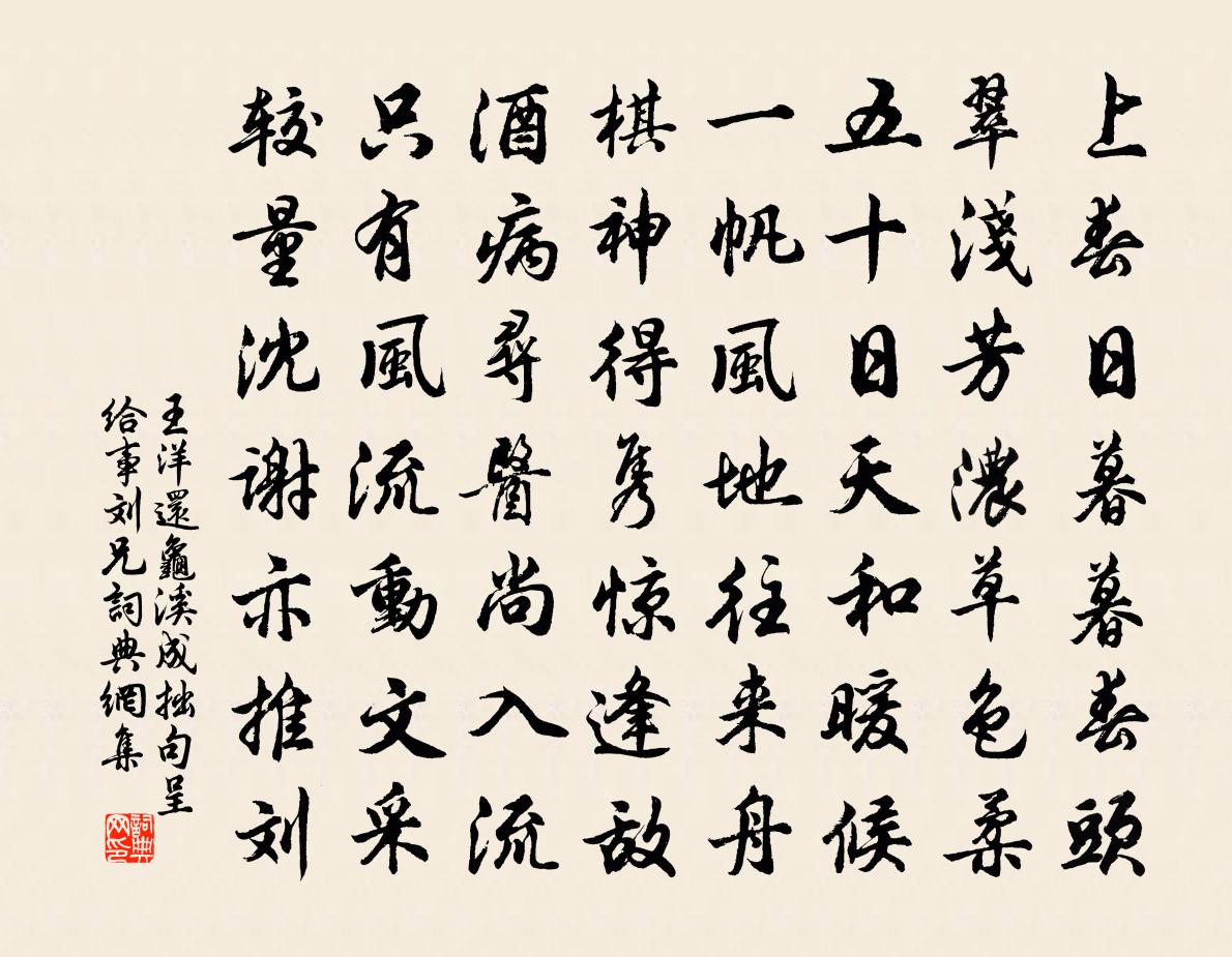 詩詞名句歷史字典書法欣賞書法字典國語詞典說文解字康熙字典古漢語字典標 題 作 者 詩 句 還龜溪成拙句呈給事劉兄作者:王洋 朝代:宋代還龜溪成拙句呈給事劉兄原文上春日暮暮春頭,翠淺芳濃草色柔。五十日天和暖候,一帆風地往來舟。棋神得雋驚逢敵,酒病尋醫尚入流。只有風流動文采,較量沈謝亦推劉。詩詞問答問:還龜溪成拙句呈給事劉兄的作者是誰?答:王洋問:還龜溪成拙句呈給事劉兄寫於哪個朝代?答:宋代王洋還龜溪成拙句呈給事劉兄書法欣賞還龜溪成拙句呈給事劉兄書法作品詩詞推薦題佛書六言一首劉克莊〔宋代〕圓隨如一百八,大知識五十三。旋學梵音朗誦,老無腳力遍參。頌古二十五首釋崇岳〔宋代〕描不成兮畫不成,臥龍長怖碧潭清。擬心湊泊終難會,達者應須暗裡驚。湯惠院以五言定交用韻以謝胡仲弓〔宋代〕阿邕才識面,轉盼便回春。藥籠還君富,詩囊笑我貧。學遵東魯訓,句逼晚唐人。五字論交意,吟邊憶李頻。偈六十九首釋道寧〔宋代〕歷歷分明,堂堂顯露。師子翻身,象王回顧。若能這裡會觀瞻,瞥轉玄關無別事。以道次韻因再和二首張鎡〔宋代〕頃年尋地喜初來,牆下松飄滿逕釵。屈指五經寒暑候,教人一掃利榮懷。南湖又共詩翁住,東寺須連單位排。獨景踏莎行秦觀〔宋代〕曉樹啼鶯,晴洲落雁。酒旗風颭村煙淡。山田過雨正宜耕,畦塍處處春泉漫。踏翠郊原,尋芳野澗。風流舊事嗟雲句麴信陵〔唐代〕台笠冒山雨,渚田耕荇花。次韻長汀壁間韻劉子翬〔宋代〕竄鼠驚殘夢,蕭蕭老屋虛。風聲傳遠瀨,寒意入秋蔬。客路漂搖久,歸身憔悴余。西窗滿殘照,仿佛似吾廬。漢江李新〔宋代〕低靄橫沙碧,長灘宿雁孤。樵薪窺樹癭,漁父就龜趺。落日駢游女,鳴波咽佩珠。啼鳥與驚鵲,先我渡城隅。酬忠公林亭包融〔唐代〕江外有真隱,寂居歲已侵。結廬近西術,種樹久成陰。人跡乍及戶,車聲遙隔林。自言解塵事,咫尺能輜塵。為道夜坐因觀楊伯虎和春字韻詩偶成五絕再寄張鎡〔宋代〕苕霅從來著志和,子云寧久占煙波。速歸逕上清班好,時過南湖伴浩歌。水龍吟 次前韻二首許有壬〔元代〕此身就健宜閒,莫教七十才休致。招讒賈怨,聲名*赫,文章雄麗。三紀紅塵,一簪華發,消磨豪氣。有清泉白石祁門道中即事曹彥約〔宋代〕山木陰陰擊晚牛,水田漠漠任春鷗。長歌大笑卻歸去,長在農家今白頭。姚源憶故人 贈董先生藏頭聯珠馬鈺〔元代〕予屬付須當認。取本源清淨。意清心除境。滅心忘盡。形八戒持來正。洽靈靈心印。結光輝禪定。是神仙準。句徐逢年〔宋代〕賢侯作意蘇民瘼,常念比鄰有餒人。鵲韓溉〔唐代〕才見離巢羽翼開,盡能輕颺出塵埃。人間樹好紛紛占,天上橋成草草回。幾度送風臨玉戶,一時傳喜到妝檯。若教南征彭秋宇〔宋代〕聖皇神武志規恢,南國胡為貢未來。銅柱地荒雲隔斷,珠崖天盡雁飛回。秋風曾見秦師出,曉日今聞漢詔哀。中國金字經馬致遠〔元代〕夜來西風裡,九天鵰鶚飛。困煞中原一布衣。悲,故人知未知?登樓意,恨無天上梯!題苦竹寺海棠洞三首王之道〔宋代〕翠袖朱唇一笑開,依風無力競相隈。陽城豈是僧家物,端恐齊奴步障來。和鄭信卿孫應時〔宋代〕天與風情壓眾芳,雕欄翠幄奉君王。猗蘭自欠傾城色,空作深林一味香。名句推薦人老去西風白髮,蝶愁來明日黃花。張可久《折桂令·九日》 妾家高樓連苑起,良人執戟明光里。張籍《節婦吟·寄東平李司空師道》 雪紛紛,掩重門,不由人不斷魂,瘦損江梅韻。關漢卿《大德歌·冬》 枕前淚共階前雨,隔個窗兒滴到明。聶勝瓊《鷓鴣天·別情》 老翁逾牆走,老婦出門看。杜甫《石壕吏》 天地生君子,君子理天地。荀子《荀子·王制》 楚水巴山江雨多,巴人能唱本鄉歌。劉禹錫《竹枝詞二首·其二》 實無有法佛得阿耨多羅三藐三菩提。鳩摩羅什譯《金剛經·究竟無我》 懷君屬秋夜,散步詠涼天。韋應物《秋夜寄邱員外 / 秋夜寄丘二十二員外》 一切賢聖,皆以無為法而有差別。鳩摩羅什譯《金剛經·無得無說》