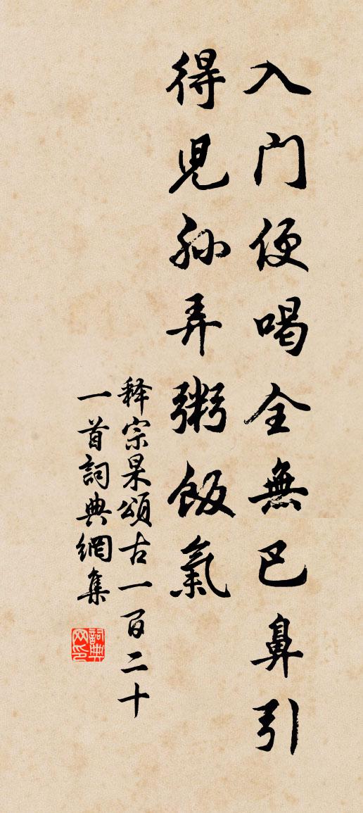 詩詞名句歷史字典書法欣賞書法字典國語詞典說文解字康熙字典古漢語字典標 題 作 者 詩 句 頌古一百二十一首作者:釋宗杲 朝代:宋代頌古一百二十一首原文入門便喝,全無巴鼻。引得兒孫,弄粥飯氣。詩詞問答問:頌古一百二十一首的作者是誰?答:釋宗杲問:頌古一百二十一首寫於哪個朝代?答:宋代釋宗杲頌古一百二十一首書法欣賞頌古一百二十一首書法作品詩詞推薦依韻酬葉道卿中秋對月二首范仲淹〔宋代〕天遣今宵無寸雲,故開秋碧掛冰輪。詩人不悔衣沾露,為惜清光豈易親。浣溪沙(呈潮陽使君宋台簿敦書)姚述堯〔宋代〕乳酒初頒菊正黃||。去年高宴近清光。朝回猶帶御爐香。暫向花封陪客醉,已聞芝檢促歸裝。昌黎寧許到潮陽。酹江月 任御史有約不至薩都剌〔元代〕秦淮曉發,掛雲帆十丈,天風如箭。一碧湖光三十里,落日水平天遠。系馬維舟,買魚沽酒,楊柳人家店。輕寒襲和鄰僧韻陳德翔〔宋代〕七八年來住水心,鼓鄰蕭寺共僧吟。古池暗有泉相接,春地從教筍自侵。興到濃時因坐久,交於淡處見情真。極憐詠懷八十二首阮籍〔魏晉〕 夜中不能寐,起坐彈鳴琴。薄帷鑒明月,清風吹我襟。孤鴻號外野,翔鳥鳴北林。徘徊將何見?憂思獨傷心。二送趙叔自吏部知福州四首趙蕃〔宋代〕公雖去朝廷,秘殿通班在。不應獻納忠,於爾分內外。而況我此州,甘棠存蔽芾。旱疫苦相仍,要當蒙大賚。寄題吳介夫專壑七詠負閒劉學箕〔宋代〕鐘鼎本玩世,富貴徒苦人。何似天地間,蕭然一閒身。明月鄭獬〔宋代〕一環明月午初停,自掛虛窗不可扃。恰見梧桐一雙影,綠陰漠漠覆中庭。陌上花八首晁補之〔宋代〕吳歌白紵怨芳菲,腸斷懷王去不歸。陌上如今小花伴,山前山後白鷳飛。西叔兄生日魏了翁〔宋代〕上壽班齊日未升,風廊露幙立公卿。親聞商略西南彥,爭說高家好弟兄。竹枝孫光憲〔唐代〕門前春水白苹花,岸上無人小艇斜。商女經過江欲暮,散拋殘食飼神鴉。蜀僧明操思歸龍丘子書壁蘇軾〔宋代〕更厭勞生能幾日,莫將歸思擾衰年。片雲會得無心否,南北東西只一天。蘇武慢 鳴鶴餘音 世傳全真馮尊師蘇武慢二凌雲翰〔元代〕篇論學仙之事。道園先生謂費無隱獨善歌之,則能知者亦罕矣。及觀先生所作,非惟足以追配尊師,而使世之汩沒送曾公善赴定武吳則禮〔宋代〕關河熊落落孤鴻熊飛,燕然山南霜草齊。邊笳戍角自悲壯,千里不聞邊馬嘶。刁斗夜急虎帳靜,皎皎隴月臨牙旗。答王聘君 其一王冕〔元代〕門徑蕭條勘,相知得往來。人方戀升斗,我獨撫尊缸。故國秋風慘,荒城暮雨開。閒中多樂意,不在最深杯。詩 一謝惠連〔南北朝〕掛鞍長林側。飲馬修川湄。巳未春日山居雜興十二解楊萬里〔宋代〕寒久花遲也大奇,雨膏飽足土膏肥。牡丹芍藥君須記,管取花房二尺圍。滿庭芳(賜茶)王之望〔宋代〕犀隱雕龍,蟾將威鳳,建溪初貢新芽。九天春色,先到列仙家。今日磨圭碎璧,天香動、風入窗紗。清泉嫩,江南贈相士蜀張二詩陳造〔宋代〕貧病謝人謀,形容覽鏡羞。要隨耕釣往,聊為斗升留。子術誠探妙,吾門恐暗投。霜髯文學掾,寧復鄧元侯。陳大夫華嚴閣鄧肅〔宋代〕星郎德望欲摩天,坎止流行任自然。直道不回真鐵石,高懷未老已林泉。宗門夙了風幡動,傑閣聊修香火緣。顧我名句推薦劍外忽傳收薊北,初聞涕淚滿衣裳。杜甫《聞官軍收河南河北》 山從人面起,雲傍馬頭生。李白《送友人入蜀》 賴其力者生,不賴其力者不生。墨子《墨子·32章 非樂(上)》 內外相應也,言行相稱韓非及後人《韓非子·解老》 採蓮南塘秋,蓮花過人頭。佚名《西洲曲》 鼎湖流水清且閒,軒轅去時有弓劍,古人傳道留其間李白《飛龍引二首·其二》 春江花朝秋月夜,往往取酒還獨傾。白居易《琵琶行 / 琵琶引》 欲知平直,則必準繩;欲知方圓,則必規矩呂不韋《呂氏春秋·論·不苟論》 君子崇人之德,揚人之美,非諂諛也;正義直指,舉人之過,非毀疵也。荀子《荀子·不苟》 桂棹兮蘭枻,斵冰兮積雪;屈原《九歌》