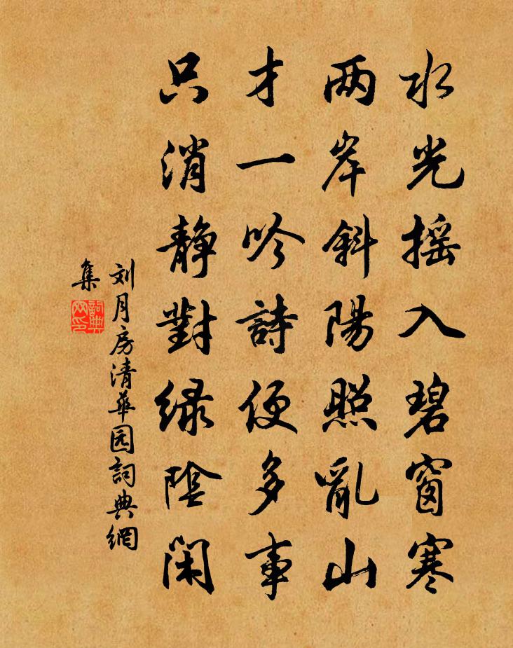 詩詞名句歷史字典書法欣賞書法字典國語詞典說文解字康熙字典古漢語字典標 題 作 者 詩 句 清華園作者:劉月房 朝代:宋代清華園原文水光搖入碧窗寒,兩岸斜陽照亂山。才一吟詩便多事,只消靜對綠陰閒。詩詞問答問:清華園的作者是誰?答:劉月房問:清華園寫於哪個朝代?答:宋代劉月房清華園書法欣賞清華園書法作品詩詞推薦米元章猶硯帖贊岳珂〔宋代〕公謂是硯,生平之所無。彼美硯山,乃易其所居。既舍其所寶,聊假以自娛,其亦人之情歟。朝日梅堯臣〔宋代〕日色才出海,曉月無光彩。曉月在青空,不與日色同。誠知大君德,照耀無不通。鬼車歐陽修〔宋代〕嘉佑六年秋,九月二十有八日,天愁無光月不出。浮雲蔽天眾星沒,舉手向空如抹漆。天昏地黑有一物,不見其形滿江紅(送施德初)毛並〔宋代〕東馬嚴徐,名籍甚、西京人物。誰不羨、伏蒲忠鯁,演綸詞筆。雅意中朝今小試,二年東郡弦風跡。數中興、循吏刁同年草堂蘇軾〔宋代〕不用長竿矯繡衣,南園北第兩參差。青山有約長當戶,流水無情自入池。歲久酴縻渾欲合,春來楊柳不勝垂。主答錢寺丞憶伊川歐陽修〔宋代〕之子問伊川,伊川已春色。綠芷雜芳浦,青溪含白石。山阿昔留賞,屐齒無遺蹟。惟有岩桂花,留芳待歸客。江城子 賦牡丹(原無題,據凌張諸本補)元好問〔金代〕姚家池館魏家鄰。上番春。姓名新。傾國傾城,為雨復為雲。水北水南無別物,金屑粉,麝香塵。折枝圖上看精神長相思·汴水流白居易〔唐代〕汴水流,泗水流,流到瓜州古渡頭。吳山點點愁。思悠悠,恨悠悠,恨到歸時方始休。月明人倚樓。詠史二首陳造〔宋代〕暴楚狂秦席捲中,謀臣戰將各言功。端知四百綿炎祚,只屬商山禿鬢翁。吾宗(衛倉曹崇簡)杜甫〔唐代〕吾宗老孫子,質樸古人風。耕鑿安時論,衣冠與世同。在家常早起,憂國願年豐。語及君臣際,經書滿腹中。宿楊塘店楊萬里〔宋代〕吾生行路何時了,舊館重來身漸老。路旁松桂只十年,如今修修舊小小。昨宵宿處又雲邊,來宵還似今宵然。陳跡南園趙嘏〔唐代〕雨過郊園綠尚微,落花惆悵滿塵衣。芳尊有酒無人共,日暮看山還獨歸。永州陪鄭太守登舟夜宴席上各賦詩蔣肱〔唐代〕江頭朱紱間青衿,豈是仙舟不可尋。誰敢強登徐稚榻,自憐還學謝安吟。月凝蘭棹輕風起,妓勸金罍盡醉斟。剪盡贈秀才虛中〔唐代〕筠陽多勝致,夫子縱游遨。鳳鳥瑞不見,鱸魚價轉高。門開沙觜靜,船系樹根牢。誰解伊人趣,村沽對鬱陶。昨夜月中一睡殊有秋色覺書所見戲呈道孚張耒〔宋代〕幽人息遙夜,四聽市聲寂。月華清可掬,天色紺欲滴。候蟲先知秋,微響出陰壁。精熒高露濕,斷續殘河白。興懷趙安國梅坡樓鑰〔宋代〕隆暑倦行役,梅坡得暫閒。捲簾南浦岸,終日對成山。竹里清風遠,棋邊夕照還。歲寒重卜醉,覓句暗香間。次韻抱拙即事胡仲弓〔宋代〕一嘯立東皋,輕寒侵二毛。曉光浮野草,春色染夭桃。有水池添滿,無雲山更高。清源何日約,掃石共歌騷。自冬徂春,道中多雨,至臨江、宜春之間特甚范成大〔宋代〕客行無晴時,涔涔如漏天。東吳至西江,舊歲接新年。蠟屐驚踵決,油衣笑鶉懸。掀淖起復仆,頃步如重關。略似悟黃梁王丹桂〔元代〕浮名浮利兩悠悠。終不道,把身囚。好貪多敗更多憂。又著個,甚來由。願人識破早抽頭。從前事,盡都休。飄飄十二時歌釋印肅〔宋代〕晡時申,衙鼓冬冬妙意新。括地該天人不會,如飄野馬入迷津。不敢相,勿疏親,露體堂堂絕翳塵。屠兒一念無諸名句推薦可以仕則仕,可以止則止。孟子《孟子·公孫丑章句上·第二節》 流水下灘非有意,白雲出岫本無心。佚名《增廣賢文·上集》 相思只在夢魂中。今宵月,偏照小樓東。何大圭《小重山·綠樹鶯啼春正濃》 今日暫同芳菊酒,明朝應作斷蓬飛。王之渙《九日送別》 秋天一夜靜無雲,斷續鴻聲到曉聞。張仲素《秋閨思二首》 斟酌乎質文之間,而隱括乎雅俗之際,可與言通變矣。劉勰《文心雕龍·通變》 登高望蓬流,想像金銀台。李白《游泰山六首》 知音少,弦斷有誰聽。岳飛《小重山·昨夜寒蛩不住鳴》 不似春風逞紅艷,鏡前空墜玉人釵。司空圖《華下對菊》 畫樓洗淨鴛鴦瓦,彩繩半濕鞦韆架。王元鼎《醉太平·寒食》