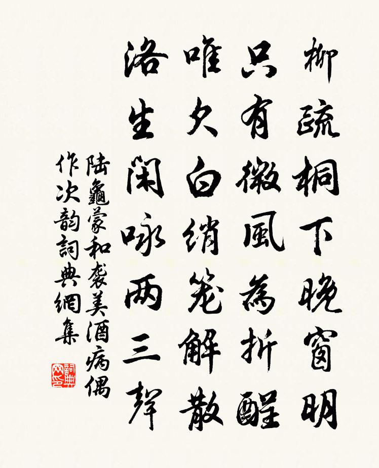 詩詞名句歷史字典書法欣賞書法字典國語詞典說文解字康熙字典古漢語字典標 題 作 者 詩 句 和襲美酒病偶作次韻作者:陸龜蒙 朝代:唐代和襲美酒病偶作次韻原文柳疏桐下晚窗明,只有微風為折酲。唯欠白綃籠解散,洛生閒詠兩三聲。詩詞問答問:和襲美酒病偶作次韻的作者是誰?答:陸龜蒙問:和襲美酒病偶作次韻寫於哪個朝代?答:唐代問:陸龜蒙的名句有哪些?答:陸龜蒙名句大全陸龜蒙和襲美酒病偶作次韻書法欣賞和襲美酒病偶作次韻書法作品詩詞推薦郊廟歌辭。享太廟樂章。長發舞張說〔唐代〕具禮崇德,備樂承風。魏推幢主,周贈司空。不行而至,無成有終。神興王業,天歸帝功。用前韻招蕃叟弟陳傅良〔宋代〕落花風雨奈愁何,愁亦不應緣落花。尚可流觴追曲水,底須占鵩似長沙。無人晤語鳥烏落,為我食貧樓筍佳。休說詠史下謝安陳普〔宋代〕封胡羯末皎琳琅,歲久渾無憶洛陽。江左家居照江水,謝安元為宋齊梁。滿庭芳 論金玉馬鈺〔元代〕玉洞玄玄,金爐燦燦,清中金玉希奇。金龍玉虎,玉走與金飛。撞透金門玉戶,見金蓮、玉蕊爭輝。金玉好,天風翠雲屏乾隆〔清代〕崔巍孤峰削玉華,山樞旁出古槎枒。何人解事為鐫泐,語鑿空猶道女蝸。《言懷》一詞,遂繼韻戲贈王惲〔元代〕休官鼓澤居閒久,縱清苦愛吾子能守。幸年來所事消磨,只有苦吟甘酒。平生學道在初心,富貴浮云何有?恐此身秋日懷國仲觀樓鑰〔宋代〕四明聳秀一溪流,曾記經行十里秋。行李今從何處住,宦遊自笑幾時休。兒時故舊今誰在,老去光陰不借留。贏得失調名吳某〔宋代〕剪羅幡兒,斜插真珠髻。中梁山寺文同〔宋代〕上方梯磴繞岩頭,誰就孤高更起樓。直望漢江三百里,一條如線下洋州。秋末江上望貫休〔唐代〕莽莽古江濱,紛紛墜葉頻。煙霞誰是主,丘隴自傷神。吞併寧唯漢,淒涼莫問陳。盡隨流水去,寂莫野花春。章氏園小集荷池上葛立方〔宋代〕一金營雅集,荷濕露香濃。鳥起驚歌扇,雲移落酒鍾。碧筩彎象鼻,翠釜出駝峰。百歲風狂似,無因系六龍。敬和九鎖步虛詞藏雲鎖趙汝湜〔宋代〕靈根郁三素,一氣同氤氳。冉冉霄上游,永離囂塵熏。空體含五華,霞貫泥丸君。鈽剛爾何神,攝身混祥雲。晚霽宋庠〔宋代〕斷續簷聲歇,徘徊隙影賒。歸雲衛樹破,殘雨入樓斜。徑綠都成草,叢薰尚隱花。便同江海思,春水照軍牙。偈頌一百三十六首釋惟一〔宋代〕天門一合,十方無路。似海之深,如山這固。如何造入,步。丙子兵禍台溫為烈寧海雖經焚掠然耕者不廢丁舒岳祥〔宋代〕事過清眠足,心寬緩步宜。古人無限事,煙蹙幾修眉。同滕推游朱緋堂二首許月卿〔宋代〕當日朱緋夢,荒煙代鶴城。斜陽邊草色,深樹里禽聲。欲雨路微濕,出雲山半青。神遊應故里,只欠愛翁亭。雨小人相凌王洋〔宋代〕負擔相隨笑同,不分強習弱便相攻。若無三尺齊民律,曠野何人是長雄。送內尋廬山女道士李騰空二首李白〔唐代〕君尋騰空子,應到碧山家。水舂雲母碓,風掃石楠花。若愛幽居好,相邀弄紫霞。多君相門女,學道愛神仙。素手題九老圖二首陳造〔宋代〕涼亭燠館塵埃外,野鳥溪花俎豆前。但愛林泉映華發,豈知勛烈載青編。送淨道人徐鉉〔唐代〕北阜與西山,前期夢寐間。羨師乘興去,應擬此生閒。喬木人誰在,鱸魚我未還。歸心寄秋水,東去日潺潺。名句推薦燕語如傷舊國春,宮花一落已成塵。李益《隋宮燕》 不可以身相得見如來。鳩摩羅什譯《金剛經·如理實見》 濁酒一杯家萬里,燕然未勒歸無計。范仲淹《漁家傲·秋思》 同心一人去,坐覺長安空。白居易《別元九後詠所懷》 已見寒梅發,復聞啼鳥聲。王維《雜詩三首 / 雜詠三首》 君埋泉下泥銷骨,我寄人間雪滿頭。白居易《夢微之》 為我引杯添酒飲,與君把箸擊盤歌。白居易《醉贈劉二十八使君》 黃河怒浪連天來,大響谹谹如殷雷。溫庭筠《拂舞詞 / 公無渡河》 繁華事散逐香塵,流水無情草自春。杜牧《金谷園》 晝短苦夜長,何不秉燭游!佚名《生年不滿百》