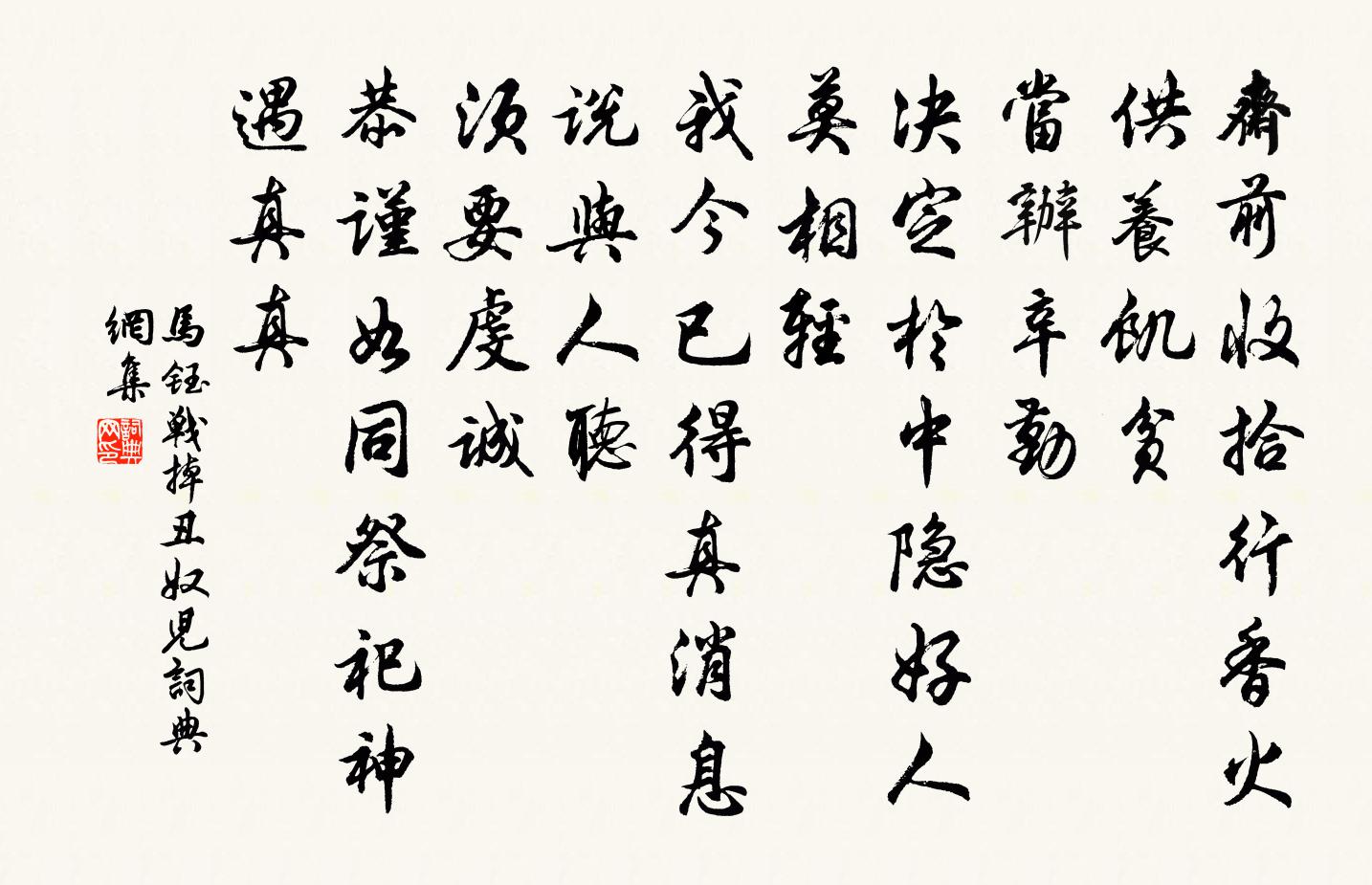 詩詞名句歷史字典書法欣賞書法字典國語詞典說文解字康熙字典古漢語字典標 題 作 者 詩 句 戰掉醜奴兒作者:馬鈺 朝代:元代戰掉醜奴兒原文齋前收拾行香火,供養飢貧。當辦辛勤。決定於中隱好人。莫相輕。我今已得真訊息,說與人聽。須要虔誠。恭謹如同祭祀神。遇真真。詩詞問答問:戰掉醜奴兒的作者是誰?答:馬鈺問:戰掉醜奴兒寫於哪個朝代?答:元代問:戰掉醜奴兒是什麼體裁?答:詞馬鈺戰掉醜奴兒書法欣賞戰掉醜奴兒書法作品詩詞推薦山齋向子諲〔宋代〕橫側數峰碧,逶迤一徑開。無人相就宿,時有白雲來。有感十首吳芾〔宋代〕蜀錦機中瑞鶻盤,宮袍歲歲給千官。朱門次第皆輕暖,御所空悲易水寒。偈頌一百四十一首釋師範〔宋代〕面面相看,眼眼廝覷。衣外別傳,有甚憑據。倒卻門前剎竿著,鳳棲不在梧桐樹。別東林後回寄修睦齊己〔唐代〕昨夜從香社,辭君出薜蘿。晚來巾舄上,已覺俗塵多。遠路縈芳草,遙空共白波。南朝在天末,此去重經過。御愛山宋祁〔宋代〕翠嶂奔騰一氣間,六飛留賞暫怡顏。君王草草非真愛,心愧東方檢玉山。出東城門見牧牛曾豐〔宋代〕出逢春客放牛天,浩嘆微官久自纏。回首未能收白牯,歸家猶可養烏犍。扇子詩李石〔宋代〕神農醫王七十毒,金粟如來四百病。未如一卷混沌書,淡飯粗羹學清淨。送嚴陵汪學正巽元並寄趙賓暘方回〔宋代〕子去桐江路,諸生迓水濱。為言前郡守,獨憶老詩人。揖拜衣冠古,歌游棟宇新。故吾誰見念,辛苦戰場塵。水調歌頭蔣士銓〔清代〕偶為共命鳥,都是可憐蟲。淚與秋河相似,點點注天東。十載樓中新婦,九載天涯夫婿,首已似飛蓬。年光愁病里壽容山陳普〔宋代〕天下東南有玄圃,左瞰閩浙右俯楚。蘊環露秀周峰巒,異氣時出為雲雨。何年營丘文獻孫,相攸馳檐來胥宇。綿綿頌古三十一首釋安永〔宋代〕南北山相對,東西有路分。不經場陣裹,爭見李將軍。和此陽先生感興詩二十首劉黻〔宋代〕交遊重金石,里巷毋泛尋。胸中抱明鏡,妍醜不相侵。熱交但以貌,冷交惟其心。勢利易苟合,道義難力任。詠春南柯子/南歌子曾覿〔宋代〕綠陰侵檐淨,紅榴照眼明。主人開宴出傾城。正是雨餘天氣、暑風清。別酒殷勤竟,危弦要妙聲。年年相見豈無情建寧重五陸游〔宋代〕霏微入戶黃梅雨,磊落堆盤碧筒黍。病來一滴不飲酒,但嗅菖蒲作端午。人生忽忽東逝波,白頭奈此節物何!去年唐竹卿道士相過黃庚〔宋代〕一徑秋老碧苔,柴扉掩書少曾開。詩書門戶無人到,只有通玄道士來。句杜抑之〔宋代〕雷霆真自地中出,河漢莫從天上翻。瑤台散天花詞三首白玉蟾〔宋代〕諸天彩女一雙雙,十二樓前並捧香。太乙真人乘白鶴,雲中端簡候虛皇。題小松(一作移)張喬〔唐代〕松子落何年,纖枝長水邊。斫開深澗雪,移出遠林煙。帶月棲幽鳥,兼花灌冷泉。微風動清韻,閒聽罷琴眠。時世裝,儆戎也乾隆〔清代〕城中好高髻,鄉間一尺長。元和亦有時世裝,因之流行遍四方,不為怡容為戚態,望而可知非兆祥。所以少傅作詩出山作盧仝〔唐代〕出山忘掩山門路,釣竿插在枯桑樹。當時只有鳥窺窬,更亦無人得知處。家僮若失釣魚竿,定是猿猴把將去。名句推薦細雨魚兒出,微風燕子斜。杜甫《水檻遣心二首》 仙苑春濃,小桃開,枝枝已堪攀折。阮逸女《花心動·春詞》 楊花榆莢無才思,惟解漫天作雪飛。韓愈《晚春》 把酒看花想諸弟,杜陵寒食草青青。韋應物《寒食寄京師諸弟》 尋河愁地盡,過磧覺天低。岑參《磧西頭送李判官入京》 久住令人賤,頻來親也疏。佚名《增廣賢文·上集》 欸乃一聲山水綠。回看天際下中流,岩上無心雲相逐柳宗元《漁翁》 十年磨一劍,霜刃未曾試。賈島《劍客 / 述劍》 山隨平野盡,江入大荒流。李白《渡荊門送別》 窗白一聲雞,枕函聞馬嘶。顧貞觀《菩薩蠻·山城夜半催金柝》