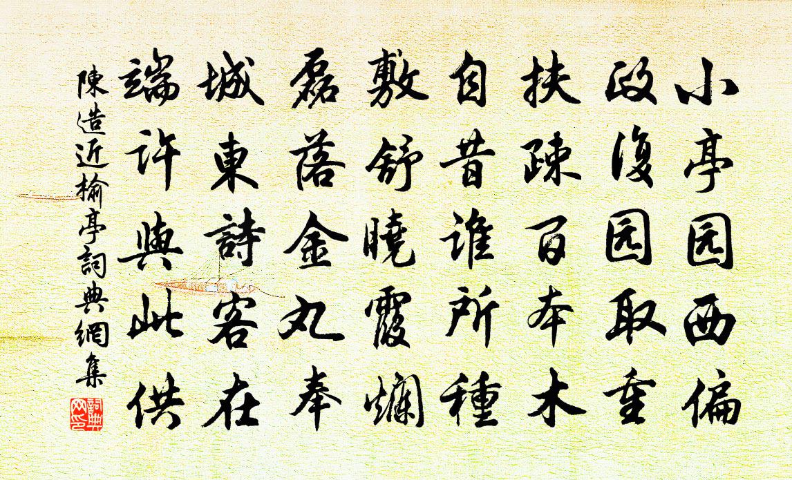 詩詞名句歷史字典書法欣賞書法字典國語詞典說文解字康熙字典古漢語字典標 題 作 者 詩 句 近榆亭作者:陳造 朝代:宋代近榆亭原文小亭園西偏,政復園取重。扶疎百本木,自昔誰所種。敷舒曉霞爛,磊落金丸奉。城東詩客在,端許與此供。詩詞問答問:近榆亭的作者是誰?答:陳造問:近榆亭寫於哪個朝代?答:宋代陳造近榆亭書法欣賞近榆亭書法作品詩詞推薦自九里平水至雲門陶山歷龍瑞禹祠而歸凡四日陸游〔宋代〕老子無心老尚狂,山程隨處寄倀倀。雲歸岫穴初收雨,水入陂塘正下秧。野客就林煨燕筍,蠶家負籠采雞桑。遠遊玉樓春(乙酉九日)劉辰翁〔宋代〕龍山歌舞無人道。只說先生狂落帽。秋風亦是可憐人,要令天意知人老。菊花不為重陽早。自愛古人詩句惱。與君冒雪早行張嵲〔宋代〕每憶西山千丈秀,雲霾對面失空青。千林夜雪無人跡,獨策羸驂帶曉星。九日偕府城諸貴人游南山寺分韻和杜工部九日何夢桂〔宋代〕飯山吟瘦帶圍寬,過得秋來一日歡。謾道高風憐破帽,還應衰發戀南冠。黃花幾度今人老,藍水千年時夢寒。日暮以人生五馬貴莫受侵為韻送胡獻叔守邵陽方岳〔宋代〕燈寒嶽麓雪,帆飽湘江胡。過家誰起予,豈無獨醒人。漢上春雪呈郡太守宋庠〔宋代〕春草江南瑞霰霏,溪山千疊共清輝。林繁不辨妝梅落,川秀空疑月蚌歸。夕苑縈叢聊自舞,橫塘拂水更低飛。民疇送簡棲上人之建州覲使君舅皎然〔唐代〕亂峰江上色,羨爾及秋行。釋氏推真子,郗家許貴甥。氎花新雨淨,帆葉好風輕。千里依元舅,回潮亦有情。九曲詞三首高適〔唐代〕許國從來徹廟堂,連年不為在疆場。將軍天上封侯印,御史台上異姓王。萬騎爭歌楊柳春,千場對舞繡騏驎。到處春夜二首劉子翬〔宋代〕葉葉風鳴幕,梢梢雨打窗。煙銷寒寶鴨,膏淺側銀缸。奉和御製後苑賞花詩宋祁〔宋代〕詔蹕回清御,宸旒駐紫煙。矞雲霏漢幄,法曲度文弦。獵翠雄風度,凝香甲帳褰。仙葩浮羽葆,藻衛縟芝廛。式宴送紫微夏舍人從治洪州宋庠〔宋代〕方底丁寧細札書,豫章都會冠全吳。垂腰三品龜銜綬,衛帳千兵虎刻符。藥省樹翻拋賜筆,練江波靜見還珠。西山寄題喻叔奇國傅郎中園亭二十六詠愛山堂楊萬里〔宋代〕詩人性癖愛看山,曉坐堂中夕嬾還。只對月山無限好,月山外面八雙鬟。贈右台監察鄧茂遷左台殿中劉懷一〔唐代〕惟昔參多士,無雙仰異才。鷹鸇同效逐,鵷鷺忝游陪。入仕光三命,遷榮歷二台。隔牆欽素躅,對問限清埃。紫署閼逢敦{妝女換羊}二月十一日與一二僚友游叔司馬光〔宋代〕下馬久徘徊,林芳殊未開。人同真有意,須待主翁來。詠懷余觀復〔宋代〕山容洗眼青,江光照肌白。翻枝鵲查查,抱葉蟬嘖嘖。蒹葭搖風聲,梧桐淡秋色。草木了無能,陰陽互相激。人於重遊雁山分得六題龍鼻水薛嵎〔宋代〕怪極生真想,飢凶禱請勤。半身鱗甲具,一勺渺瀰分。應谷聲如鬼,飛空石礙雲。精誠隨寓在,亦以感通聞。秋晚懷友程洙〔宋代〕長亭一樽酒,猶記別時斟。碧草思前夢,黃花見此心。關河秋北望,天地日西沈。遙想山中桂,何人月下吟。奉和御製讀史記詩夏竦〔宋代〕漢武將從禪,須如亟釋兵。甘泉誠毖祀,喬嶽紀尊名。加禮崇休祉,修封蓋號榮。豈同承帝籙,肆覲正權衡。朝中措(乙未中秋麥湖舟中)趙師俠〔宋代〕西風著意送歸船。家近總欣然。去日梅開爛漫,歸時秋滿山川。京華倦客,難堪羈思,歷盡秋邊。寄語姮娥休笑,閒坐海觀興致悠然是時月白如晝蒲壽宬〔宋代〕一笑靈龜尾曳塗,扁舟聊復寄菰蒲。潮生潮落帆來去,雲捲雲舒山有無。風定若教胥怒息,月明空憶蠡游孤。漁翁名句推薦倚遍闌乾,只是無情緒。李清照《點絳唇·閨思》 濁酒一杯家萬里,燕然未勒歸無計。范仲淹《漁家傲·秋思》 夢中未比丹青見,暗裡忽驚山鳥啼。姜夔《鷓鴣天·元夕有所夢》 鹹言上國繁華,豈謂帝城羈旅。子蘭《秋日思舊山》 悲莫悲生離別,樂莫樂新相識,兒女古今情。辛棄疾《水調歌頭·壬子三山被召陳端仁給事飲餞席上作》 霜威出塞早,雲色渡河秋。李白《太原早秋》 過頭飯好吃,過頭話難聽!佚名《增廣賢文·下集》 食者,國之寶也;兵者,國之爪也墨子《墨子·05章 七患》 從善如登,從惡如崩司馬光《資治通鑑·魏紀·魏紀三》 千錘萬鑿出深山,烈火焚燒若等閒。于謙《石灰吟》