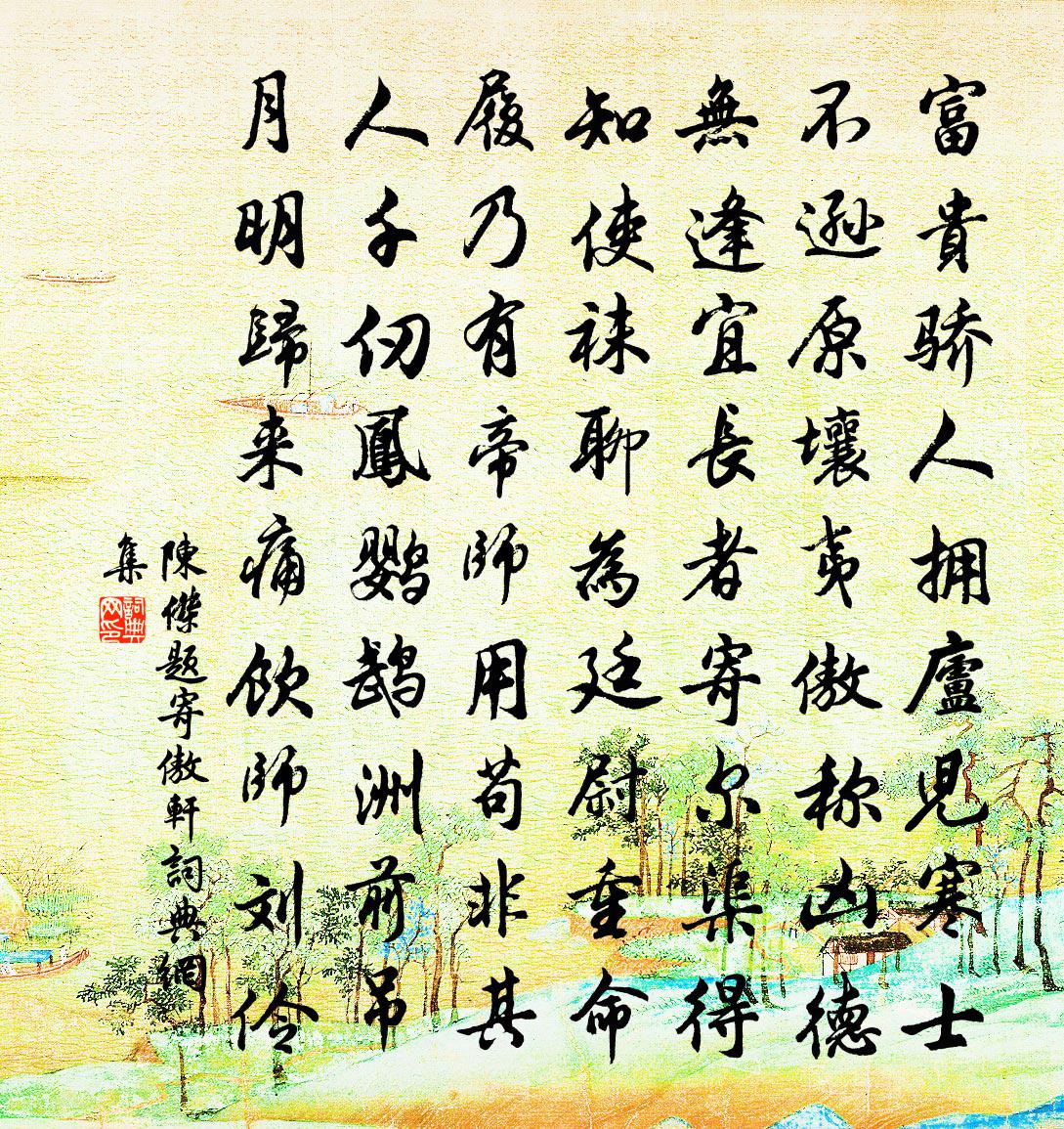 詩詞名句歷史字典書法欣賞書法字典國語詞典說文解字康熙字典古漢語字典標 題 作 者 詩 句 題寄傲軒作者:陳杰 朝代:宋代題寄傲軒原文富貴驕人擁廬兒,寒士不遜原壤夷。傲稱凶德無逢宜,長者寄爾渠得知。使襪聊為廷尉重,命履乃有帝師用,苟非其人千仞鳳。鸚鵡洲前吊月明,歸來痛飲師劉伶。詩詞問答問:題寄傲軒的作者是誰?答:陳杰問:題寄傲軒寫於哪個朝代?答:宋代陳杰題寄傲軒書法欣賞題寄傲軒書法作品詩詞推薦和虞守感秋二首姜特立〔宋代〕家音何用寄,郵置有沉浮。旦夕天邊去,書來一雁秋。乞雙峰山頻婆果朱翌〔宋代〕我聞如來有佛眼,結子成時速寄來。從此慈悲修廣目,得爭開處便爭開。去年十月九日余至燕城今周星不報為賦長句文天祥〔宋代〕君不見常山太守罵羯奴,天津橋上舌盡刳。又不見睢陽將軍怒切齒,三十六人同日死。去冬長至前一日,朔庭呼我雪喻良能〔宋代〕密雪乘風逞素肌,穿窗透隙入簾幃。漫空隱隱瓊瑰悄,亂眼紛紛鷗鷺飛。三客新成梁苑賦,六花又舞謝莊衣。回思九日四首李石〔宋代〕昔人臥聽門前酒,我亦坐看籬下花。不是雨多門自掩,情知歲惡酒難賒。三祖贊釋道沖〔宋代〕通身是病骨粘皮,舉世無人識得伊。縱使罪根都懺了,依前失卻兩莖眉。池上釋文珦〔宋代〕曉業池上獨憑闌,無限春愁欲訴難。最是閏年時候別,楝花開盡尚清寒。次韻劉架閣和予壬寅入局詩方岳〔宋代〕入開圖籍底須箝,誰校蓬山三萬簽。有竹兩窗聊下榻,為梅一笑幾巡檐。虎頭食肉亦安用,熊掌與魚那得兼。好事偈頌三十六首釋如珙〔宋代〕龍門無宿客,不是點額人。孤峰無宿客,不是守株人。紅日繞須彌,清風遍寰宇。夜到潤州孫逖〔唐代〕夜入丹陽郡,天高氣象秋。海隅雲漢轉,江畔火星流。城郭傳金柝,閭閻閉綠洲。客行凡幾夜,新月再如鉤。嶺梅李龍高〔宋代〕雪立孤標不受霾,世間浪蕊等浮埃。清高已是無儔伍,更向群山頂上開。寄曹使君毛滂〔宋代〕幕中墨客隨車後,駕上牙籤遮坐右。唯留筆研乃自鐍,豈惜車茵容吏嘔。青霞老去雲海深,舊遊尚見翻濤手。寄聲寄李群玉姚合〔唐代〕九衢名與利,無計擾閒人。道遠期輕世,才高貴重身。石脂稀勝乳,玉粉細於塵。骨換肌膚膩,心靈氣色真。嵩山句陶去泰〔宋代〕富川郡治居高閒,萬頃平湖几案間。賜楊億判秘監宋真宗〔宋代〕瑣闥往年司制誥,共嘉藻思類相如。蓬山今日詮墳史,還仰多聞過仲舒。報政列城歸覲後,疏恩高閣拜官初。諸生遍地錦佚名〔宋代〕萊州武觀是吾鄉。因遇先生號長生。穿街柳巷也無妨。不染塵埃性月詠鷺鷥邵棠〔宋代〕如鷳非鶴自精神,天地江湖快爾生。既不鵑吟因甚瘦,何嘗食素也能清。隨身釣具去無計,到處畫圖來便成。見說侄孫子淵新居落成二首戴復古〔宋代〕結屋鄰蒼海,開門面翠屏。堂前萱草綠,壽母鬢絲青。禮樂陳樽俎,詩書立戶庭。一時勤卜築,百世享康寧。禪會圖黃檗裳沙彌釋了惠〔宋代〕膝下黃金貴,掌中天地寬。風雲欣際會,四海夜濤寒。重陽遣興喻良能〔宋代〕秋高身老少陵悲,不獨雲飛雁亦飛。紅葉色深偏照酒,黃花香重欲沾衣。絕知落帽歡娛好,最奈登山伴侶稀。強插名句推薦含煙御柳拂旌旗,帶露宮花迎劍戟。施耐庵《水滸傳·第一回》 天下稍安,尤須兢慎,若便驕逸,必至喪敗。吳兢《貞觀政要·卷一·論政體》 夕陽西下,斷腸人在天涯。馬致遠《天淨沙·秋思》 壯年何事憔悴,華發改朱顏。蘇舜欽《水調歌頭·滄浪亭》 唯有相思似春色,江南江北送君歸。王維《送沈子歸江東 / 送沈子福之江東》 吹燈窗更明,月照一天雪。袁枚《十二月十五夜》 青天蜀道難,紅葉吳江冷。張可久《普天樂·秋懷》 練於骨者,析辭必精;深乎風者,述情必顯。劉勰《文心雕龍·風骨》 相攜及田家,童稚開荊扉。李白《下終南山過斛斯山人宿置酒》 數叢沙草群鷗散,萬頃江田一鷺飛。溫庭筠《利州南渡》