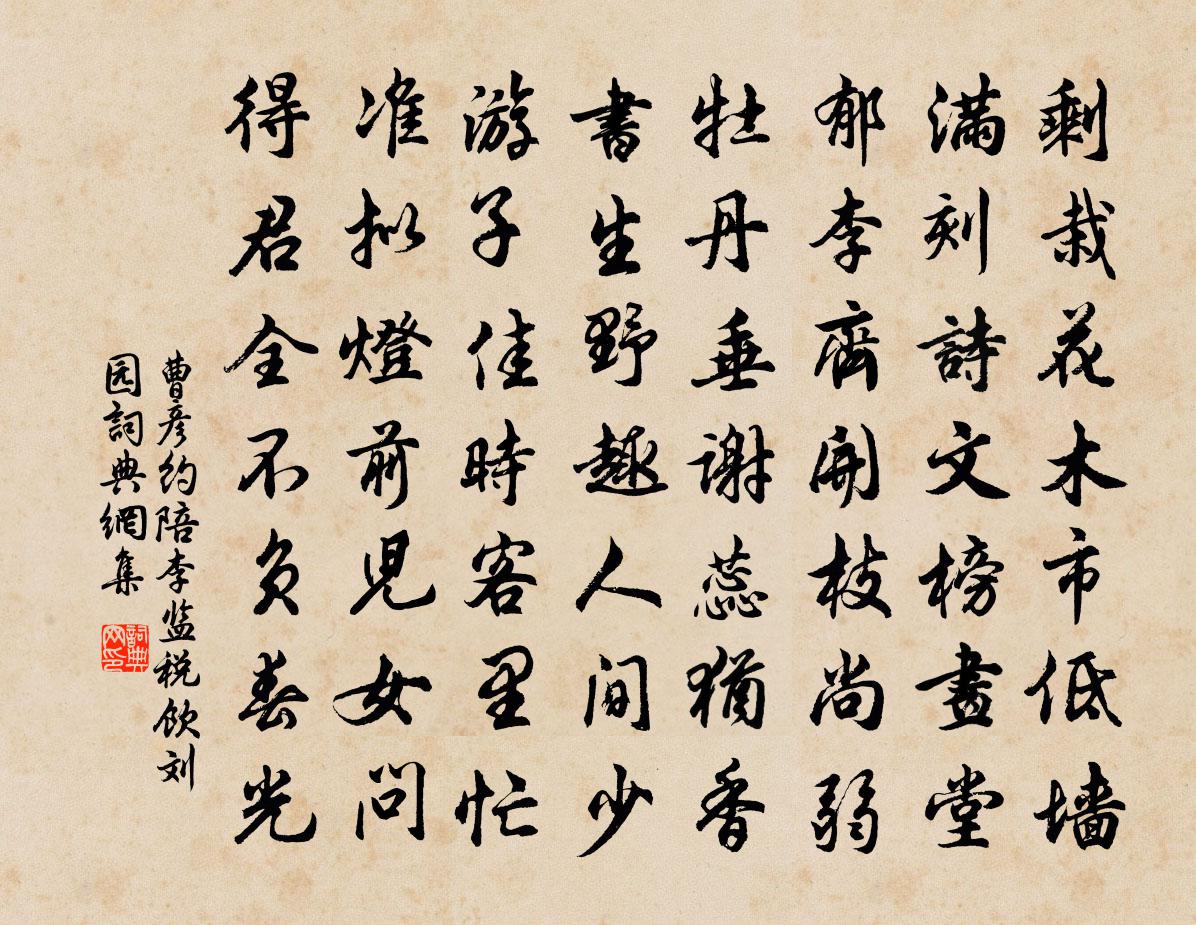詩詞名句歷史字典書法欣賞書法字典國語詞典說文解字康熙字典古漢語字典標 題 作 者 詩 句 陪李監稅飲劉園作者:曹彥約 朝代:宋代陪李監稅飲劉園原文剩栽花木市低牆,滿刻詩文榜畫堂。郁李齊開枝尚弱,牡丹垂謝蕊猶香。書生野趣人間少,遊子佳時客里忙。準擬燈前兒女問,得君全不負春光。詩詞問答問:陪李監稅飲劉園的作者是誰?答:曹彥約問:陪李監稅飲劉園寫於哪個朝代?答:宋代曹彥約陪李監稅飲劉園書法欣賞陪李監稅飲劉園書法作品詩詞推薦寄程滄洲趙汝騰〔宋代〕山間藜杖看初春,忽報滄洲除命新。今日昌黎司憲部,幾年陸贄任詞臣。扶持世道豈無策,宗主時賢今有人。老懶御製太皇太后輓詞四首范祖禹〔宋代〕定策元豐末,勞謙聖烈光。外家深自抑,俊德盡明揚。恭儉隆三世,寬仁覆萬方。功成身不處,仙駕白雲鄉。天淨沙·春白樸〔元代〕春山暖日和風,闌桿樓閣簾櫳。楊柳鞦韆院中。啼鶯舞燕,小橋流水飛紅。偶書寇準〔宋代〕往事都如夢,流年只斷魂。不堪春盡日,細雨欲黃昏。金縷曲/賀新郎劉辰翁〔宋代〕拍瓮春醅動。洞庭霜、壓綠堆黃,林苞堪貢。況有老人潭邊菊,搖落賞心入夢。數百歲、半來許中。兒女牽衣團欒又二首劉克莊〔宋代〕萊菔可虀秔可炊,絕勝遠訪碧溪祠。渠能去伴舒為誥,時有來聽鼎說詩。江夏奇童今屬子,金華仙伯更傳誰。錦囊六州歌頭(美人足)劉過〔宋代〕洛浦凌波,為誰微步,輕塵暗生。記踏花芳徑,亂紅不損,步苔幽砌,嫩綠無痕。襯玉羅慳,銷金樣窄,載不起、憶王孫 漁者善住〔元代〕悠悠長是白雲間。猿鳥漁樵共往還。倚個喬松看遠山。少機關。世上南康邂逅江西吳運判劉過〔宋代〕一節西來已駭傳,不堪歸去便湘川。舟行彭蠡輕文種,酒到當陽醉樂天。台諫久無公議論,朝廷新有驟除遷。臣心送友人下第游邊貫休〔唐代〕失意窮邊去,孤城值晚春。黑山霞不赤,白日鬼隨人。角咽胡風緊,沙昏磧月新。明時至公在,回首莫因循。用前韻勉陳進之赴省項安世〔宋代〕痴翁切莫強笞兒,子之勤勞我所知。但看匡衡穿壁苦,難雲寗越讀書遲。能來伴我滄浪艇,共看一年橙橘時。莫為共樂堂陳俊卿〔宋代〕共樂堂前花木深,登臨當暑豁塵襟。紅垂荔子千家熟,翠擁篔簹十畝陰。老退已尋居士服,清歡時伴醉翁吟。憑欄題稅軒新築送青亭四首張榘〔宋代〕日抱吟情到此亭,捲簾孤坐看雲生。詩懷恰與雲相似,一點悠然度太清。借居值雪陳起〔宋代〕已嘆長安索米難,可禁風雪滿長安。無家又是於人借,有命從來只有寬。春入園林根覺暖,色連天地眼生寒。西湖牟元禮挽章馮時行〔宋代〕淚注瓊瑰事可傷,白衣回首白雲鄉。兩三遺冊新詩在,四十餘年素業荒。學海驟乾千頃浪,儒林舊剪一枝芳。風流次韻劉敏殿丞送春蘇轍〔宋代〕春去堂堂不復追,空餘草木弄晴暉。交遊歸雁行將盡,蹤跡鳴鳩懶韻不飛。老大未須驚節物,醉狂兼得避危機。東水調歌頭佚名〔宋代〕吾鄉陸永仲,博學高才。自其少時,有聲場屋,今棲自鹿洞下,絕葷酒,屏世事,自放塵埃之外。行將六十,而有將巡堤堰先寄高郵蔣知軍王禹偁〔宋代〕二十年前在濮陽,賓筵留我共飛觴。當時進士衣如雪,今日郎官鬢有霜。吏役可堪巡堰埭,軍城猶喜接封疆。能來少年游晁補之〔宋代〕如今田野謾拋春。紅雨掩衡門。懶讀詩書,欠伸扶杖,几案任生塵。縱教便向東山老,誰知是箇中人。莫怪年來,次韻蒲壽宬〔宋代〕絕頂秋高風露寒,倚闌心事到梅間。誰知歲晚相思意,欲種梅花滿此山。名句推薦奢者富而不足,何如儉者貧而有餘。洪應明《菜根譚·概論》 江皋樓觀前朝寺,秋色入秦淮。徐再思《人月圓·甘露懷古》 故人何在,煙水茫茫。柳永《玉蝴蝶·望處雨收雲斷》 燕子不知人去也,飛認闌乾。韓疁《浪淘沙·莫上玉樓看》 勾引東風,也知芳思難禁。韓疁《高陽台·除夜》 此路無知己,明珠莫暗投。高適《送魏八》 臣敢竭股肱之力,效忠貞之節,繼之以死!陳壽《三國志·蜀書·諸葛亮傳》 魂來楓葉青,魂返關塞蒙杜甫《夢李白二首·其一》 亂之所生也,則言語以為階。佚名《易傳·繫辭傳上·第八章》 故人南燕吏,籍籍名更香。岑參《至大梁卻寄匡城主人》