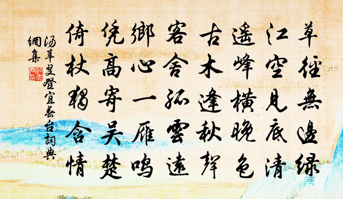 詩詞名句歷史字典書法欣賞書法字典國語詞典說文解字康熙字典古漢語字典標 題 作 者 詩 句 登宜春台作者:湯莘叟 朝代:宋代登宜春台原文草徑無邊綠,江空見底清。遙峰橫晚色,古木逢秋聲。客舍孤雲遠,鄉心一雁鳴。憑高寄吳楚,倚杖獨含情。詩詞問答問:登宜春台的作者是誰?答:湯莘叟問:登宜春台寫於哪個朝代?答:宋代湯莘叟登宜春台書法欣賞登宜春台書法作品詩詞推薦殿前歡·暢幽哉貫雲石〔元代〕暢幽哉,春風無處不樓台。一時懷抱俱無奈,總對天開。就淵明歸去來,怕鶴怨山禽怪,問甚功名在?酸齋是我,偈頌七十一首釋了惠〔宋代〕一擊華鯨吼月明,主翁魂夢已惺惺。海天空闊無知已,贏得潮聲到客亭。豫章別李元中宣德林之奇〔宋代〕舊聞諸李隱龍眠,伯時已老元中少。一行作吏各天涯,故人落落疏星曉。西山影裹識君面,碧照草江眸子瞭。向來頌古三十二首釋明辯〔宋代〕當堂古路白雲漫,碧眼黃頭尚未諳。無孔笛兒氈拍板,輕輕吹破御街寒。送王正字山寺讀書李嘉祐〔唐代〕欲究先儒教,還過支遁居。山階閒聽法,竹徑獨看書。向日荷新卷,迎秋柳半疏。風流有佳句,不似帶經鋤。入東經諸暨縣下浙江作詩何遜〔南北朝〕疲身不自量。溫腹無恆擬。未能守封植。何能固廉恥。一經可人言。三冬徒戲爾。虛信蒼蒼色。未究冥冥理。得彼晚過鄰幾官舍三首韓維〔宋代〕車馬東橋絕,涼風滿夕軒。水聲通沁苑,樹色入夷門。每接淵明詠,常懷仲理言。滄洲如可約,杯酒會重論。團練統製程公全哀輓程暘〔宋代〕舉宗南渡日,相恃得元戎。譜系通江左,家聲愧洛中。一捧埋寶劍,三錫負彤弓。誰念轅門士,哀歌徹昊穹。予賦雁湖詩蒙友社諸文繼聲不一輒復自和四首李壁〔宋代〕欄楯相望咫尺間,翻溝送水助潺潺。王家傳里烏衣巷,夢得詩中碧玉環。好看畫船來泛月,何須蠟屐去尋山。時人玩丹砂 贈張仙馬鈺〔元代〕決烈修持大丈夫。專心致志免三塗。冰清玉潔個塵無。空里人頭歡笑落,壺中斗柄斡旋舒。丹成九轉駕雲輿。句楊徽之〔唐代〕杳杳煙蕪何處盡,搖搖風柳不勝垂。戲題小雀捕飛蟲畫扇黃庭堅〔宋代〕小蟲心在一啄間,得失與世同輕重。丹表妙處不可傳,輪扁斲輪如此用。句范祖禹〔宋代〕會老名堂清潁上,禮賢開館大河濱。失調名何〔宋代〕細雨共斜風,作輕寒。壽鄧提乾母陽枋〔宋代〕爭似瑤仙捧玉觴,一堂四世聚簪裳。間中尊俎江山久,靜里襟懷日月長。蓂紫爛連庭桂此,橘香濃引誥花香。陵溪玉樓春佚名〔宋代〕臘前先報東君信。清似龍涎香得潤。黃輕不肯整齊開,比著紅梅仍舊韻。纖枝瘦綠天生嫩。可惜輕寒摧挫損。劉郎句李商隱〔唐代〕蘭膏爇處心猶淺,銀燭燒殘焰不馨。好向書生窗畔種,免教辛苦更囊螢。遙想故園陌,桃李正酣酣。頭上金雀釵,子規來鵠〔唐代〕月落空山聞數聲,此時孤館酒初醒。投人語若似伊淚,口畔血流應始聽。仰山行趙汝鐩〔宋代〕平生幾兩謝公屐,愛山愛水真成癖。集雲峰在指顧間,年來抗塵乃絕跡。西風從臾作意登,佛境未入心境清。九秋失調名佚名〔宋代〕無計奈愁何。名句推薦仰天大笑出門去,我輩豈是蓬蒿人。李白《南陵別兒童入京》 蘭溪三日桃花雨,半夜鯉魚來上灘。戴叔倫《蘭溪棹歌》 昨夜西風凋碧樹,獨上高樓,望盡天涯路。晏殊《蝶戀花·檻菊愁煙蘭泣露》 生而富者驕,生而貴者傲。范曄《後漢書·列傳·崔駰列傳》 碧水浩浩雲茫茫,美人不來空斷腸。李白《早春寄王漢陽》 楓落河梁野水秋。淡煙衰草接郊丘。蘇庠《鷓鴣天·楓落河梁野水秋》 春色邊城動,客思故鄉來。何遜《邊城思》 昨日入城市,歸來淚滿巾。張俞《蠶婦》 殘月出門時,美人和淚辭。韋莊《菩薩蠻·紅樓別夜堪惆悵》 寒眼亂空闊,客意不勝秋。楊炎正《水調歌頭·登多景樓》
