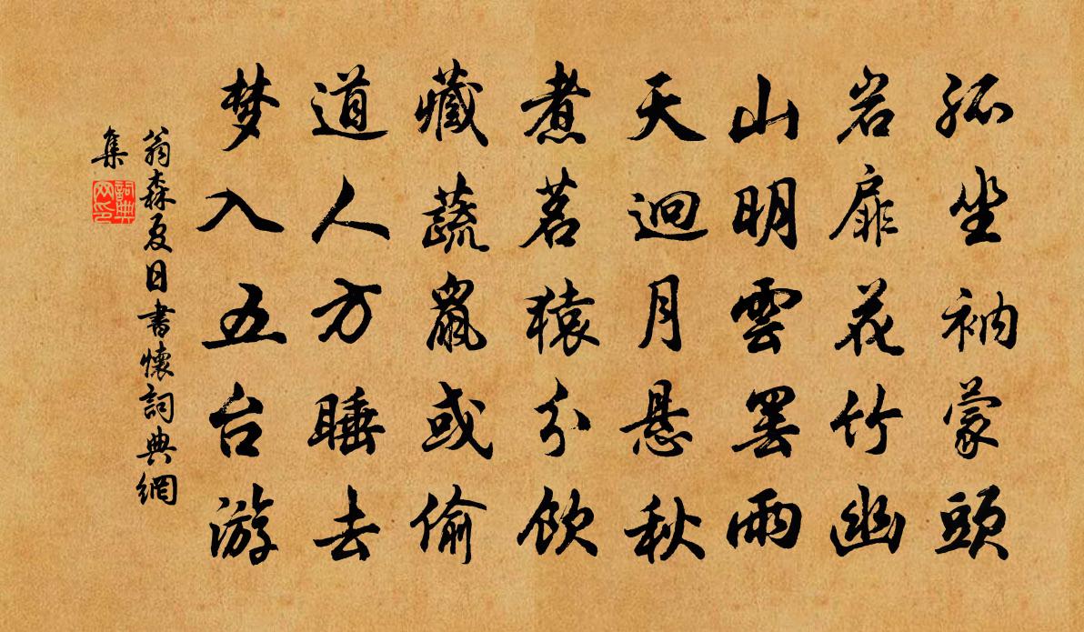 詩詞名句歷史字典書法欣賞書法字典國語詞典說文解字康熙字典古漢語字典標 題 作 者 詩 句 夏日書懷作者:翁森 朝代:宋代夏日書懷原文孤坐衲蒙頭,岩扉花竹幽。山明雲罷雨,天迥月懸秋。煮茗猿分飲,藏蔬鼠或偷。道人方睡去,夢入五台游。詩詞問答問:夏日書懷的作者是誰?答:翁森問:夏日書懷寫於哪個朝代?答:宋代翁森夏日書懷書法欣賞夏日書懷書法作品詩詞推薦中兄於余至厚奄隔幽膽因過其門追棹口述汪炎昶〔宋代〕山色花香總是愁,當年此地幾同游。偶來恍似君獨在,足擬過門卻復休。送王書記之官永興司馬光〔宋代〕白髮添新鑷,紅塵滿弊衣。人生適未值,吾道豈雲非。鞏洛風煙遠,函秦草樹微。長安春酒美,行樂勿令希。大水寓武信二首李石〔宋代〕民無穴居智,不知彼狐狸。奔流決戶入,尚懷囊橐資。倉卒老稚計,共此高樹棲。茫茫無舟筏,渺渺失陵陂。號呼題芹溪居士張宜泉〔清代〕愛將筆墨逞風流,廬結西郊別樣幽。門外山川供繪畫,堂前花鳥入吟謳。羹調未羨青蓮寵,苑召難忘立本羞。借問題嵩陽焦道士石壁錢起〔唐代〕三峰花畔碧堂懸,錦里真人此得仙。玉體才飛西蜀雨,霓裳欲向大羅天。彩雲不散燒丹灶,白鹿時藏種玉田。幸入寄顧次岳五首許月卿〔宋代〕韋齋井畔通宵月,流出文公闕里心。半夜起來湖瑩玉,明朝應有柳搖金。萬壑正看天地肅,一樓坐斷水雲岑。鏡湖朝中措趙長卿〔宋代〕於壁。坐前數妓乞詞而歌,以勸大白。因有所感,再和前韻。秋景柳林冪冪暮煙斜。秋水淺平沙。樓外碧天無際,題共樂亭程師孟〔宋代〕千門日照珍珠市,萬心煙生碧玉城。山海是為中國藏,梯航尤見外夷情。哭邢芻父六首蘇泂〔宋代〕頤養花能秀,謙卑玉似溫。當家衣缽受,外氏典型存。逸驥方開路,歸雲遽斂昏。胸中何事了,地下與誰論。碧雲亭晚眺二首岳珂〔宋代〕歲化方冉冉,耕畝自閒閒。日落青楓浦,雲平白苧山。夜城嚴警柝,昏鼓動層關。風露汀洲冷,驚鴻自往還。永遇樂·璧月初晴劉辰翁〔宋代〕余自乙亥上元,誦李易安《永遇樂》,為之涕下。今三年矣。每聞此詞,輒不自堪,遂依其聲,又托之易安自喻。有別二首陸龜蒙〔唐代〕且將絲wf系蘭舟,醉下煙汀減去愁。江上有樓君莫上,落花隨浪正東流。池上已看鶯舌默,雲間應即雁翰開。唯寓西馬塍宋伯仁〔宋代〕十畝荒林屋數間,門通小艇水灣灣。人行遠路多嫌僻,我得安居卻爾閒。樽酒相忘霜後菊,一詩難盡雨中山。何時夜寒覺有霜鄭剛中〔宋代〕不勝孤潔寒窗月,分外清圓遠守鍾。後圃便當收橘柚,無疑侵曉一相濃。七娘子(賀人子晬)吳申〔宋代〕君家諸子燕山盛。去年兩見門弧慶。銀蠟燒花,寶香熏燼。晬盤珠玉還相映。耳邊好語憑君聽。此兒不與群兒並。病中贈張十八韓愈〔唐代〕中虛得暴下,避冷臥北窗。不蹋曉鼓朝,安眠聽逢逢。籍也處閭里,抱能未施邦。文章自娛戲,金石日擊撞。龍文次呂子益韻陸游〔宋代〕呂子奇才非復常,詩來起我醉中狂。大音誰和陽春曲?真色一空時世妝。東合獻諛無轍跡,西湖寄傲有杯觴。病懷游司空山彭天益〔宋代〕此行疑是入天台,雲鎖岩扉次第開。未得路通游紫府,且隨溪轉上丹台。藤蘿映帶皆天設,山水瀠洄總地裁。果是送郎侍郎致政歸錢塘釋重顯〔宋代〕帆掛西風別海城,二疏千古道相應。誰夸富貴沽時譽,自笑經綸作技能。殘葉賦題紅片片,遠山供望碧層層。武林金燈花晏殊〔宋代〕煌煌五枝燈,下有玉蟠螭。漢宮已荊棘,此地生何為。名句推薦夜寒不近流蘇,只憐他、後庭梅瘦。毛滂《上林春令·十一月三十日見雪》 聞道黃龍戍,頻年不解兵。沈佺期《雜詩三首·其三》 枯木逢春猶再發,人無兩度再少年。佚名《增廣賢文·上集》 少年心事當拿雲,誰念幽寒坐嗚呃。李賀《致酒行》 燕支落漢家,婦女無華色。李白《塞上曲》 莫道不銷魂,簾卷西風,人比黃花瘦。李清照《醉花陰·薄霧濃雲愁永晝》 牆裡鞦韆牆外道。牆外行人,牆裡佳人笑。蘇軾《蝶戀花·春景》 十分不耐煩,乃為人大病;一味學吃虧,是處事良方。王永彬《圍爐夜話·第五四則》 春風不解禁楊花,蒙蒙亂撲行人面。晏殊《踏莎行·小徑紅稀》 秋霜不惜人,倏忽侵蒲柳。李白《長歌行》