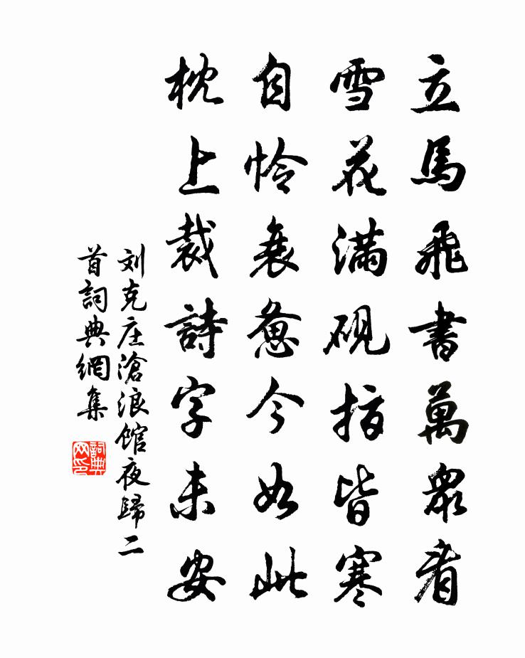 詩詞名句歷史字典書法欣賞書法字典國語詞典說文解字康熙字典古漢語字典標 題 作 者 詩 句 滄浪館夜歸二首作者:劉克莊 朝代:宋代滄浪館夜歸二首原文立馬飛書萬眾看,雪花滿硯指皆寒。自憐衰憊今如此,枕上裁詩字未安。詩詞問答問:滄浪館夜歸二首的作者是誰?答:劉克莊問:滄浪館夜歸二首寫於哪個朝代?答:宋代問:劉克莊的名句有哪些?答:劉克莊名句大全劉克莊滄浪館夜歸二首書法欣賞滄浪館夜歸二首書法作品詩詞推薦草石寺孔武仲〔宋代〕高士去已久,余蹤猶可知。竹陰侵晏坐,山影在平池。塵蝕參軍墨,苔侵相國碑。漫尋瀟灑趣,俯仰愜心期。茶瓶兒石孝友〔宋代〕相對盈盈一水。多聲價、開名得字。剛能見也還拋棄。負了萬紅千翠。留無計。來無計。□□□、成何況味。而今嘉定巳巳立秋得膈上疾近寒露乃小愈陸游〔宋代〕一枕鳥聲殘曉夢,半窗竹影弄新晴。屏深室暖秋垂老,粥美蔬香疾漸平。千葉水仙花楊萬里〔宋代〕薤葉蔥根兩不差,重蕤風味獨清嘉。薄揉肪玉圍金鈿,淺染鵝黃剩素紗。台琖元非千葉種,丰容要是小蓮花。向來霜天曉角(壽蕭靜安,時歸永新)劉辰翁〔宋代〕歸來把菊。春瓮今朝熟。苦苦留君不得,攜孺子、到汾曲。廬山真面目。冰清還映玉。長笑歐公老懶,君且住,飲贈彥清洪皓〔宋代〕好生惡殺號蒼天,天憫斯民欲息肩。自是大邦後不戢,在於南國使無{左亻右替日換心}。論功弗用矜三捷,寺勝寒山拾得贊釋智遇〔宋代〕爨下偷曾飯,岩根抱虎眠。懶吟長短句,來把梵書看。真箇看,牛皮也須穿。九日九日曾鞏〔宋代〕淒淒風露滋,靡靡塵靄屏。已忻廬舍清,未苦裘褐冷。眠食味尤嘉,起坐日尚永。虛天照積水,精鑒出幽礦。石瑩送百丈專使釋重顯〔宋代〕大雄孤頂曾遐舉,遍索諸方誰敢拒。乳竇峰前捋虎鬚,再得完全又歸去。喜雪次陳書韻楊簡〔宋代〕簾垂不覺夜窗明,清曉從容如下平。推戶忽驚瓊作地,登樓笑指玉為就。暫停枰上猶賢弈,來作弦間太古聲,甚念次韻范少才在峽中寄李季允二首魏了翁〔宋代〕大明臨照職方州,漢沔江淮澹若油。剪薙荊榛開蹕路,護持杞梓聳岑樓。朝綱人為諸公喜,國體誰知志士愁。讜議樂庵所茂柳影及松梅二畫因作二絕摹作砑花箋李衡〔宋代〕崔嵬霜乾欲凌雲,俯映寒梢數尺春。須信蒼髯淨明老,坐中容有散花人。曉醒追思夜來句四首白玉蟾〔宋代〕孤雲野鶴寄山家,不料寒空璨六花。越樣月明渾不夜,個般天氣好分茶。二月十日雨趙蕃〔宋代〕喜雪仍喜雨,相須旬日期。天民終自恤,歲事可前知。起我泛舟役,思渠荷笠詩。嗔人問米價,王掾果真痴。村居陸游〔宋代〕自笑觸藩羝,人嘲失旦雞。囊慳衣任短,山冷屋便低。宦拙讒銷骨,言狂悔噬臍。自今焚筆研,有手但扶犁。唐虞陸游〔宋代〕唐虞雖遠愈巍巍,孔氏如天孰得違?大道豈容私學裂,專門常怪世儒非。少林尚忌隨人轉,老氏亦尊知我稀。能盡同徐侍郎五雲溪新庭重陽宴集作獨孤及〔唐代〕萬峰蒼翠色,雙溪清淺流。已符東山趣,況值江南秋。白露天地肅,黃花門館幽。山公惜美景,肯為芳樽留。五馬酬樂天詠老見示劉禹錫〔唐代〕人誰不顧老,老去有誰憐。身瘦帶頻減,發稀冠自偏。廢書緣惜眼,多炙為隨年。經事還諳事,閱人如閱川。細思奉和襲美病孔雀陸龜蒙〔唐代〕懶移金翠傍檐楹,斜倚芳叢舊態生。唯奈瘴煙籠飲啄,可堪春雨滯飛鳴。鴛鴦水畔回頭羨,豆蔻圖前舉眼驚。爭得贈防江卒六首劉克莊〔宋代〕一炬曹瞞僅脫身,謝郎棋畔走苻秦。年年拈起防江字,地下諸賢會笑人。名句推薦江山代有才人出,各領風騷數百年。趙翼《論詩五首·其二》 流星飛玉彈,寶劍落秋霜。張玉娘《從軍行》 天秋月又滿,城闕夜千重。戴叔倫《客夜與故人偶集 / 江鄉故人偶集客舍》 攀荷弄其珠,蕩漾不成圓。李白《折荷有贈》 日射紗窗風撼扉,香羅拭手春事違。李商隱《日射》 孤飛一片雪,百里見秋毫。李白《觀放白鷹二首》 梅花雪,梨花月,總相思。張惠言《相見歡·年年負卻花期》 戎馬關山北,憑軒涕泗流。杜甫《登岳陽樓》 蛛絲暗鎖紅樓,燕子穿簾處。吳文英《荔枝香近·七夕》 人道山長山又斷。蕭蕭微雨聞孤館。李清照《蝶戀花·淚濕羅衣脂粉滿》