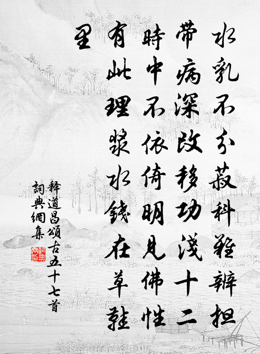 詩詞名句歷史字典書法欣賞書法字典國語詞典說文解字康熙字典古漢語字典標 題 作 者 詩 句 頌古五十七首作者:釋道昌 朝代:宋代頌古五十七首原文水乳不分,菽科難辨。擔帶病深,改移功淺。十二時中不依倚,明見佛性有此理,漿水錢在草鞋裡。詩詞問答問:頌古五十七首的作者是誰?答:釋道昌問:頌古五十七首寫於哪個朝代?答:宋代釋道昌頌古五十七首書法欣賞頌古五十七首書法作品詩詞推薦論語絕句一百首張九成〔宋代〕性習自然分遠近,智愚安得便無移。困而不學民斯下,愚者要當且力為。白鶴梁觀石魚高應乾〔宋代〕訪勝及春遊,雙魚古石留。能觀時顯晦,不逐浪沉浮。守介難投餌,呈祥類躍舟。胥歸霖雨望,千載砥中流。代陳季若上張帥林光朝〔宋代〕天邊草木舊知名,為道潢池莫弄兵。野市旋收黃犢去,明時火急趁春耕。春日登大悲閣二首錢惟治〔宋代〕閣,閣。般斤,郢作。木從繩,工必度。華飾藻繪,密施榱桷。明蟾代寶燈,瑞霧為珍箔。欄危似倚高空,梯回疑嵐似屏風徐夤〔唐代〕嵐似屏風草似茵,草邊時膾錦花鱗。山中宰相陶弘景,谷口耕夫鄭子真。宦達到頭思野逸,才多未必笑清貧。君看歲暮枉衢州張使君書並詩因以長句報之白居易〔唐代〕西州彼此意何如,官職蹉跎歲欲除。浮石潭邊停五馬,望濤樓上得雙魚。萬言舊手才難敵,五字新題思有餘。貧薄送周元吉顯謨左司將漕湖北三首楊萬里〔宋代〕君詩日日說歸休,忽解西風一葉舟。黃鶴樓前作重九,水精宮裡過中秋。職親六閣仍金馬,喜入千屯看木牛。繡斧老身陸游〔宋代〕老身無處著,登望憶閒遊。白浪浮天遠,黃雲出塞秋。百年殊鼎鼎,萬事只悠悠。歲晚長亭路,寒侵季子裘。藕池阻風,寄同行撫牧裘駕王周〔唐代〕船檣相望荊江中,岸蘆汀樹煙濛濛。路間堤缺水如箭,未知何日生南風。春日即事陳深〔宋代〕忽忽春將晚,幽窗趣亦佳。山峰時入座,野鼠畫緣階。俗事何能已,浮生信有涯。莊書讀一尺,聊復散幽懷。遇高台獲信老詩集林用中〔宋代〕今朝移步野雲端,幸得新詩讀夜闌。識破中間真隱訣,月明風雪道休寒。孟童中異科而還來訪余於行都賜第輒贈以詩鄭清之〔宋代〕在昔昌黎公,序贈張童子。獨出超等夷,芳名駕青史。君門藹世勛,夐軼四平李。宗社方同休,彪炳見孩稚。天庭殺虎行楊維楨〔元代〕夫從軍,妾從夫,夢魂猶痛刀箭瘢,況乃全軀飼豺虎。拔刀誓天天為怒,眼中於菟小於鼠。血號虎鬼冤魂語,精光下方山詩何遜〔南北朝〕寒鳥樹間響。落星川際浮。繁霜白曉岸。苦霧黑晨流。鱗鱗逆去水。瀰瀰急還舟。望鄉行復立。瞻途近更修。誰能頌古一百二十一首釋宗杲〔宋代〕五月五日午時書,赤口毒舌盡消除。更饒急急如律令,不須門上畫蜘蛛。嘉禾百詠真如院張堯同〔宋代〕田家輕脫屣,聊結淨人緣。影外香燈寂,清風百世傳。導引佚名〔宋代〕重親萬壽,八帙衍新元。禮典備文孫。溫溫和氣迎長日,寶冊煥瑤琨。徽音顯號自堯門。德行已該存。更期昌算齊韋七自太子賓客再除秘書監,以長句賀而餞之白居易〔唐代〕離筵莫愴且同歡,共賀新恩拜舊官。屈就商山伴麋鹿,好歸芸閣狎鵷鸞。落星石上蒼苔古,畫鶴廳前白露寒。老監暑行聞黃鸝聲程公許〔宋代〕人行午倦渴思冰,黃栗留鳴綠樹陰。安得故山歸燕坐,竹風窗戶一披襟。江上望西興滕岑〔宋代〕跨浦橋邊萬里風,客帆去盡暮江空。西興只在斜陽里,白壁青林淡染紅。名句推薦不在其位,不謀其政。孔子弟子《論語·泰伯篇》 漢帝重阿嬌,貯之黃金屋。李白《妾薄命》 黃鶴樓中吹玉笛,江城五月落梅花。李白《與史郎中欽聽黃鶴樓上吹笛 / 題北榭碑》 日暮酒醒人已遠,滿天風雨下西樓。許渾《謝亭送別》 一葉葉,一聲聲,空階滴到明。溫庭筠《更漏子·玉爐香》 功蓋三分國,名成八陣圖。杜甫《八陣圖》 冰泮寒塘水綠,雨余百草皆生。韋應物《三台》 秋色到空閨,夜掃梧桐葉。夏完淳《卜運算元·秋色到空閨》 遙憐小兒女,未解憶長安。杜甫《月夜》 此地朝來餞行者,翻向此中牧征馬。孟浩然《高陽池送朱二》